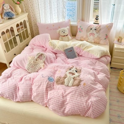 Cute Kitty Pink Gingham Bedding Set