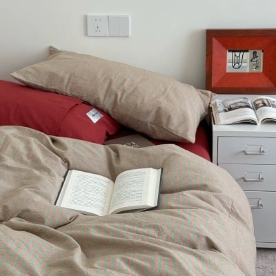 Red & Beige Striped Cotton Bedding Set