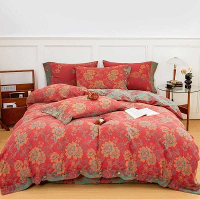 Flower Print Red Cotton Bedding Sets (4PCS)