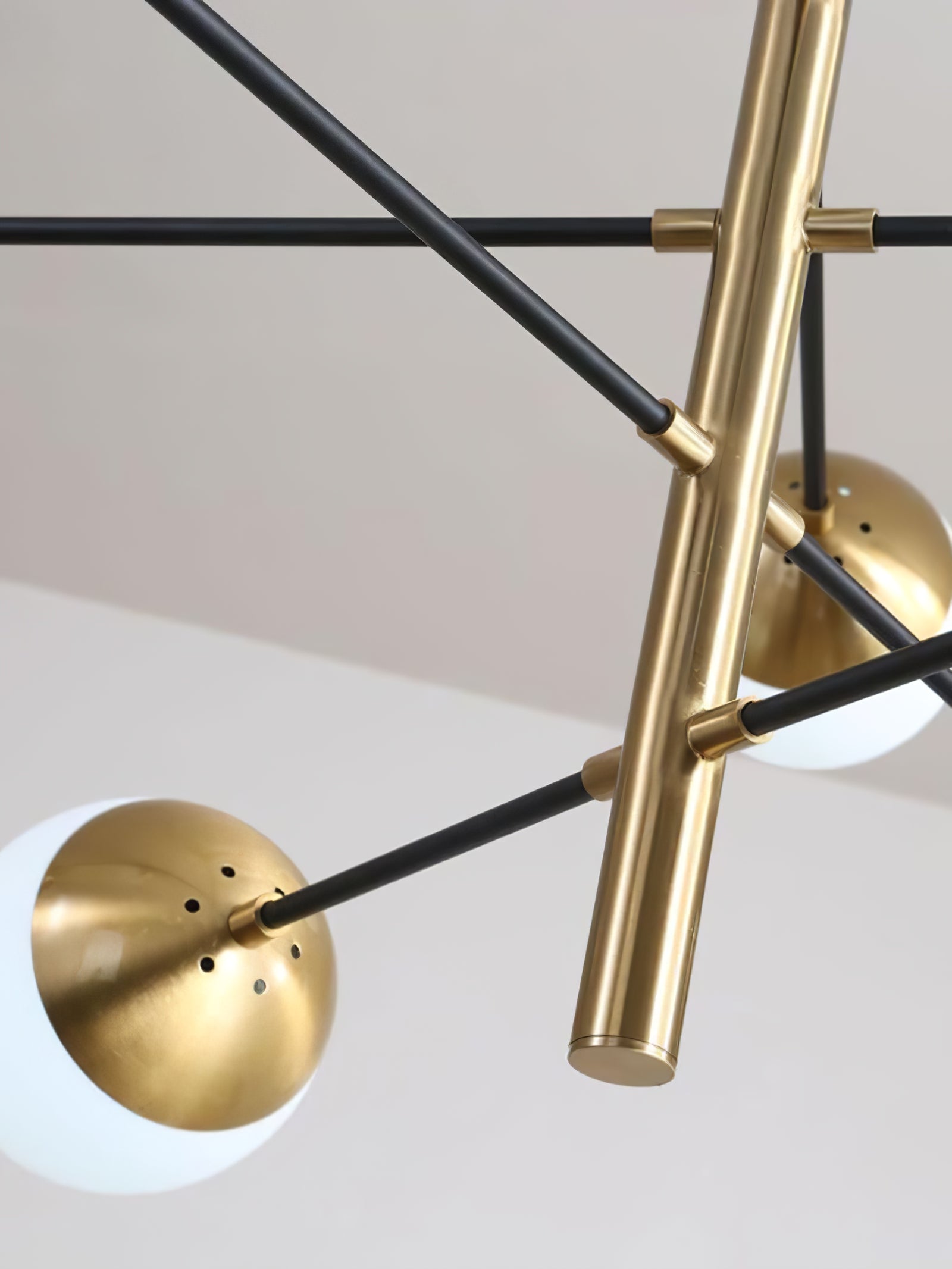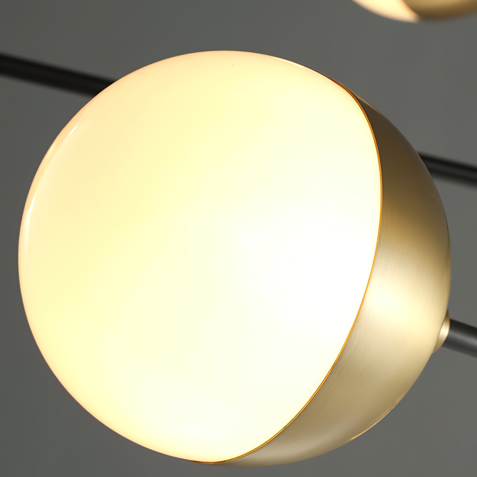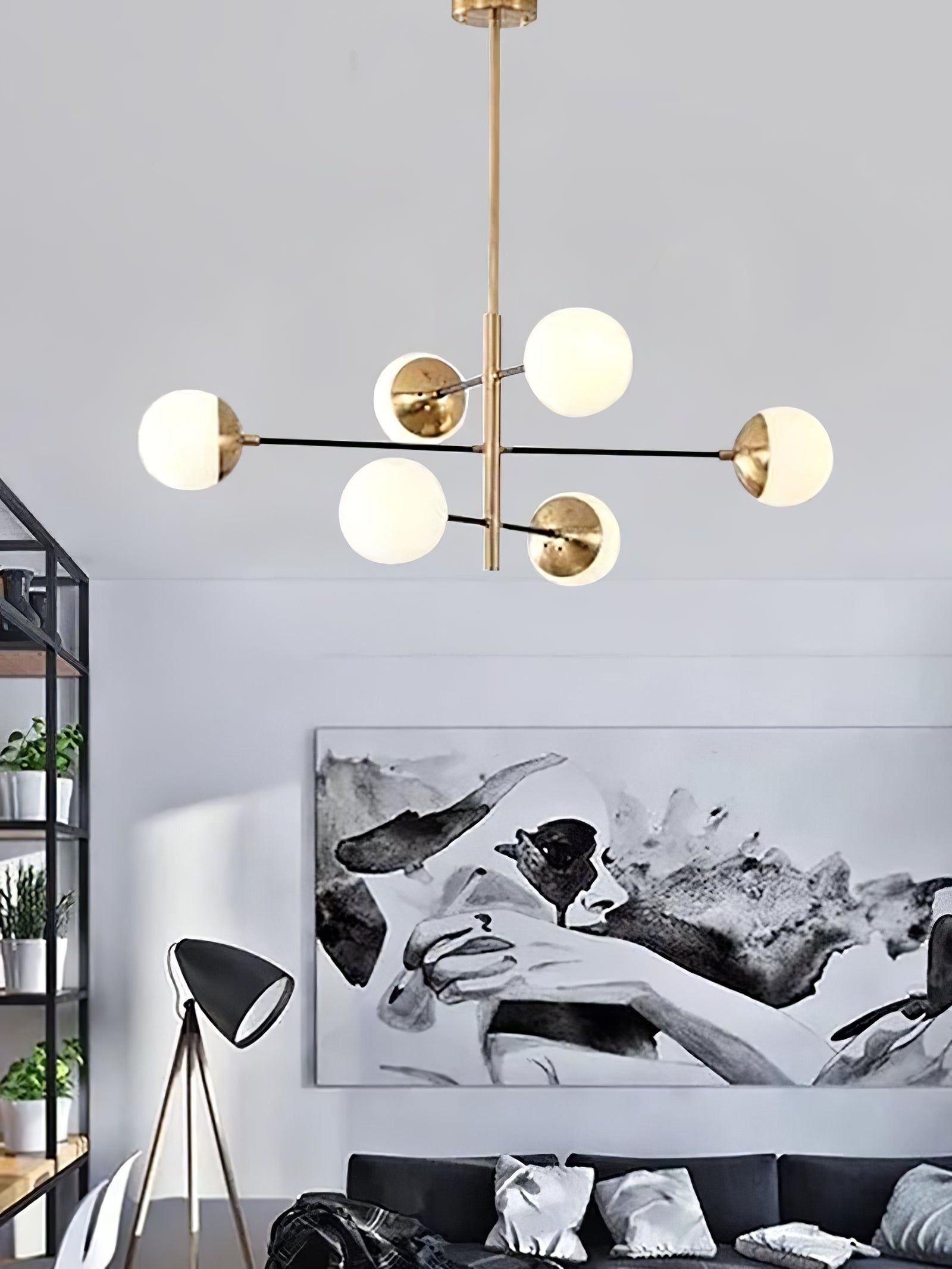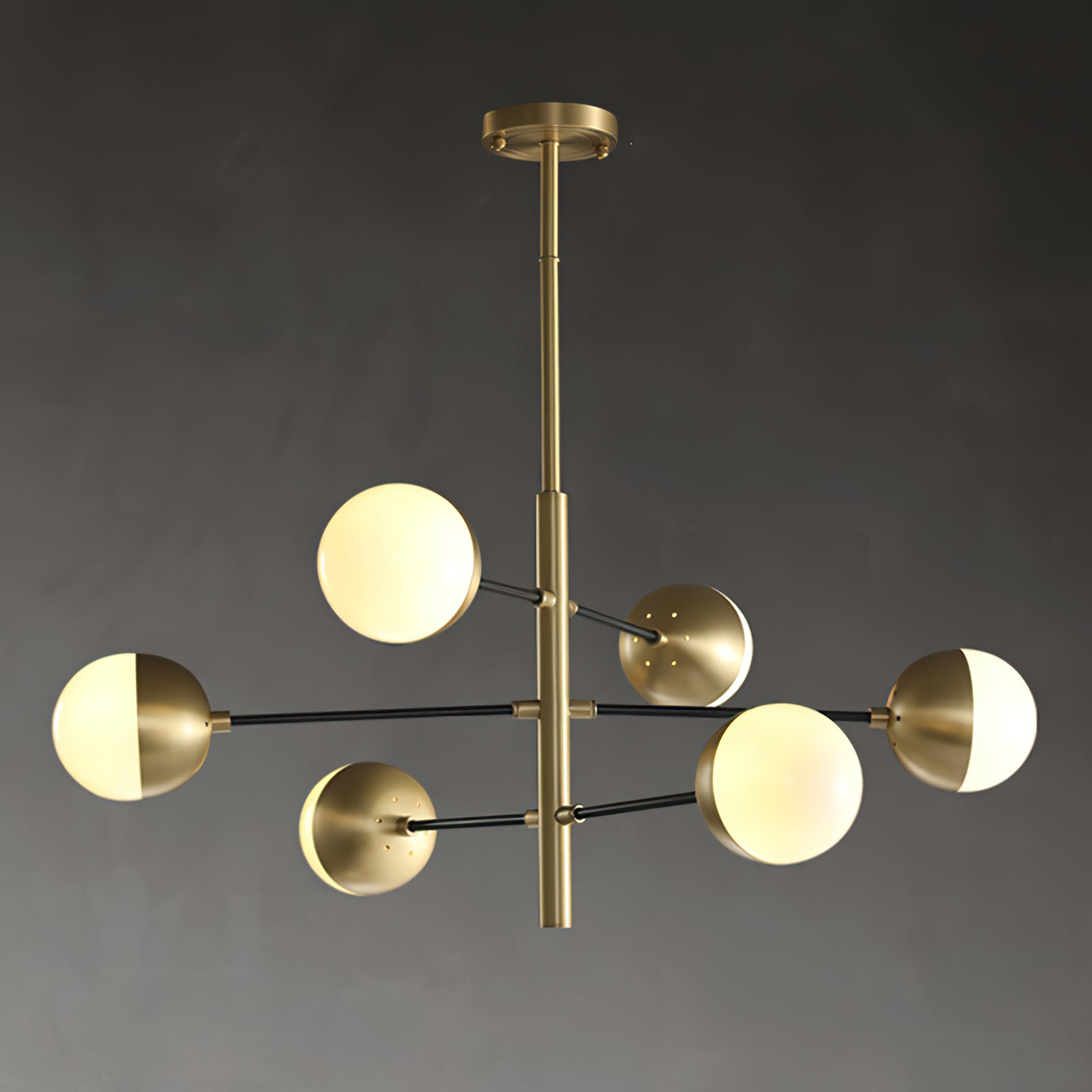 10-Globe Modern Brass Chandelier chandelier features a sleek brass finish for a luxurious yet understated look. The globe shade is split into two parts, with one half covered in opaque brass and the other allowing soft, diffused light to filter through, creating a balanced lighting effect. The lamp's clean lines and geometric symmetry make it perfect for contemporary interiors, dining rooms or living spaces looking to incorporate a sleek, modern twist.