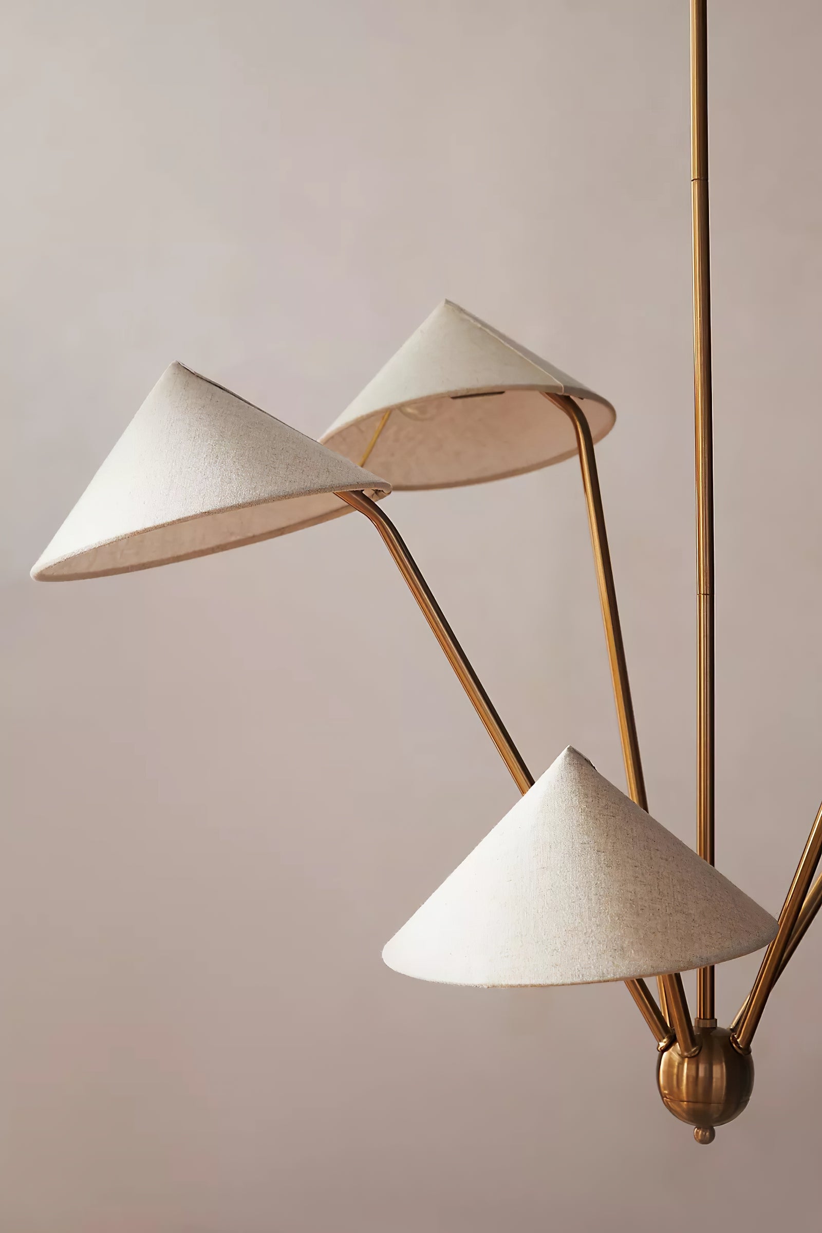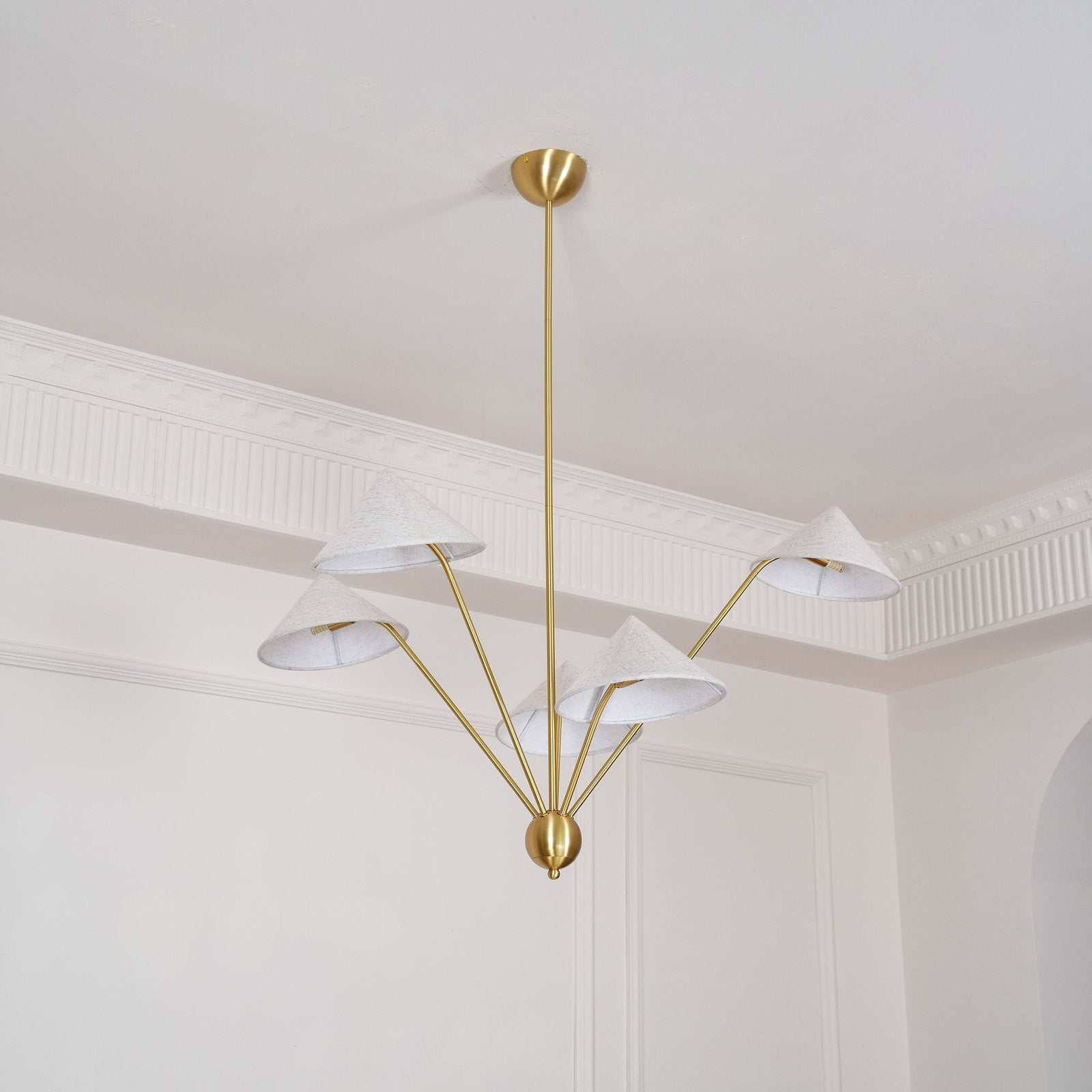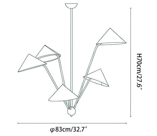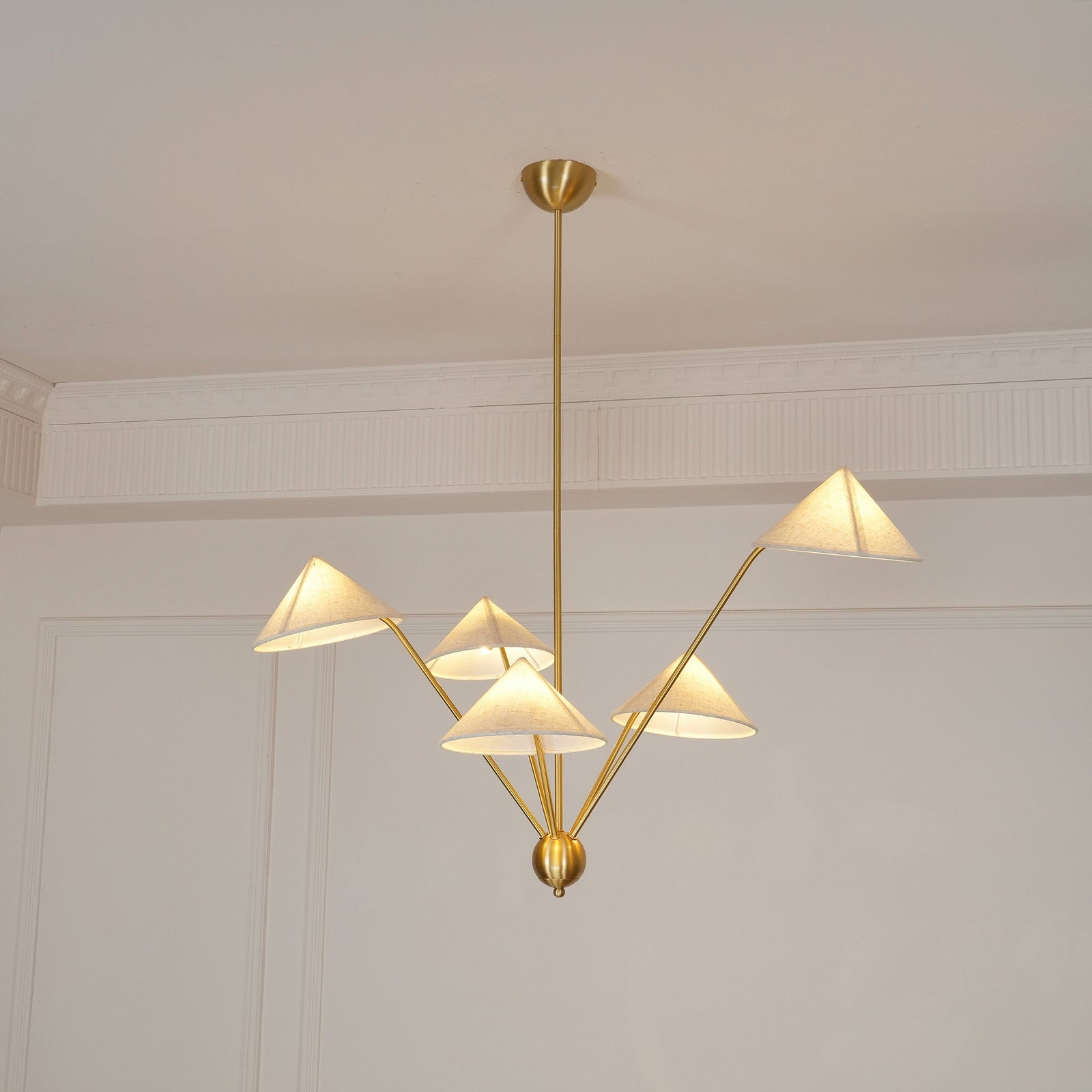 The 5-Arm Fabric Cone Chandelier combines modern minimalism with vintage elegance. Its sleek geometric form, defined by simple lines and a rich gold frame, complements the warm beige fabric lampshades. This chandelier creates a cozy yet stylish focal point, perfect for any contemporary space. Inspired by the harmony between simplicity and beauty, it brings balance and warmth to your living area or dining room.