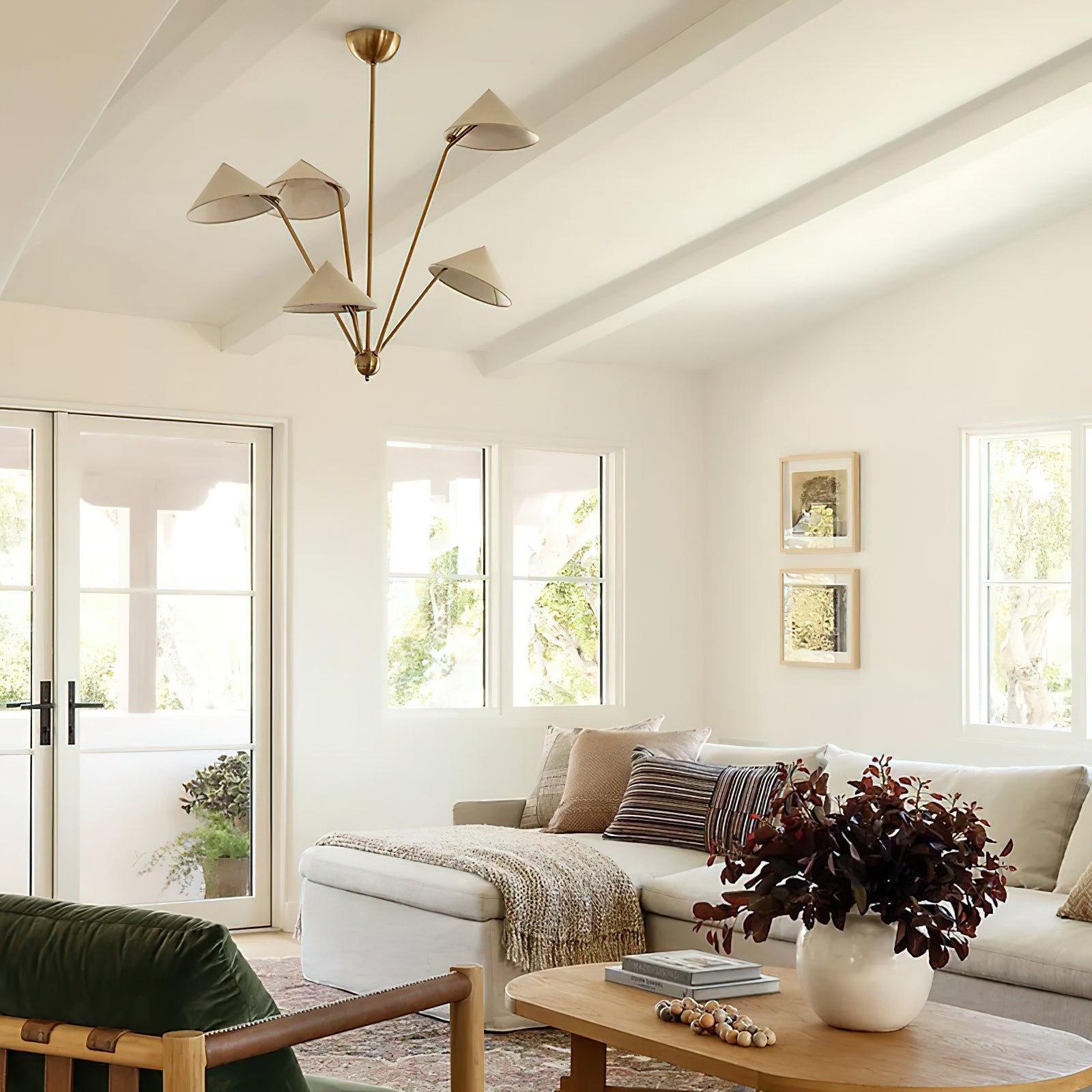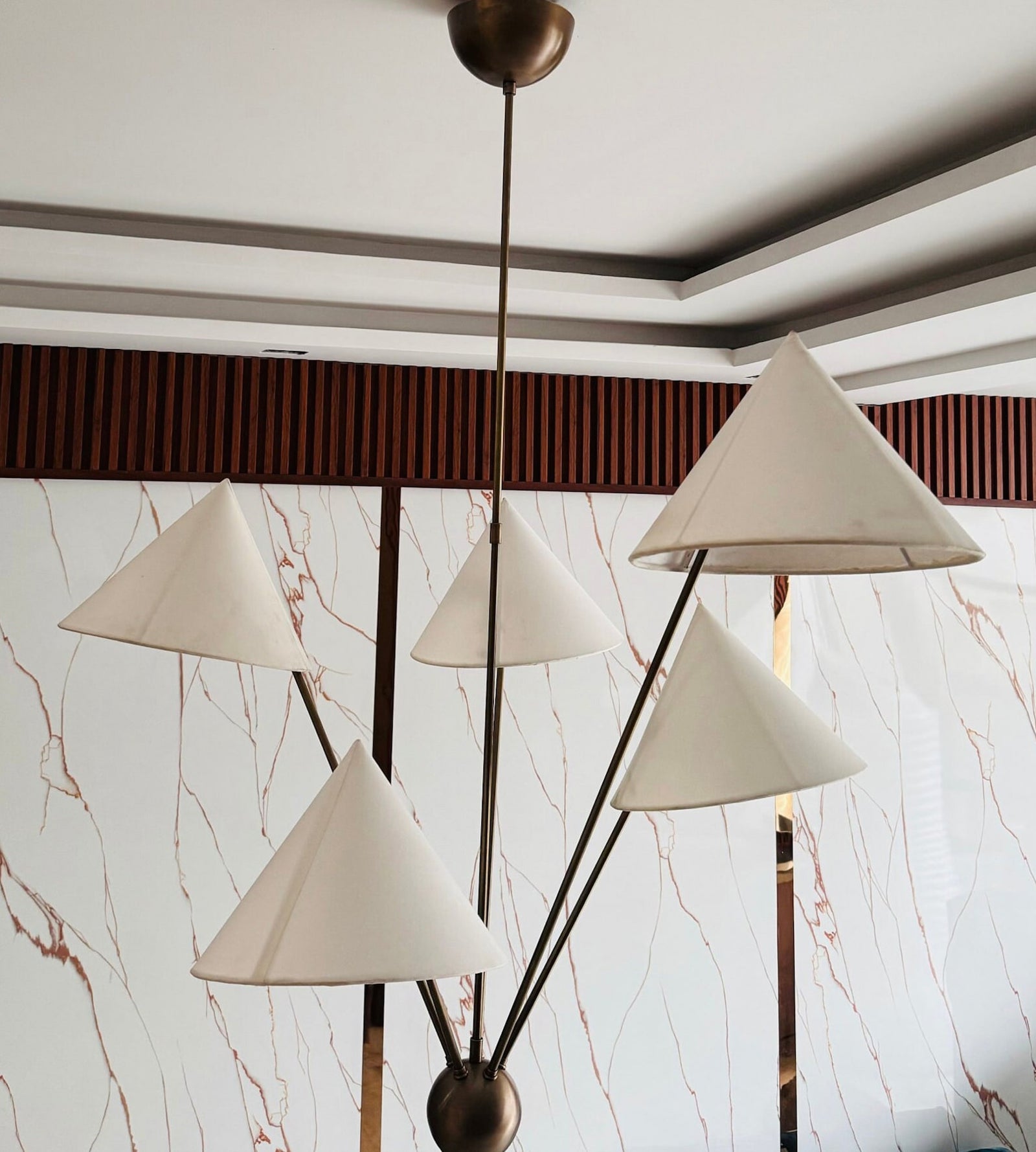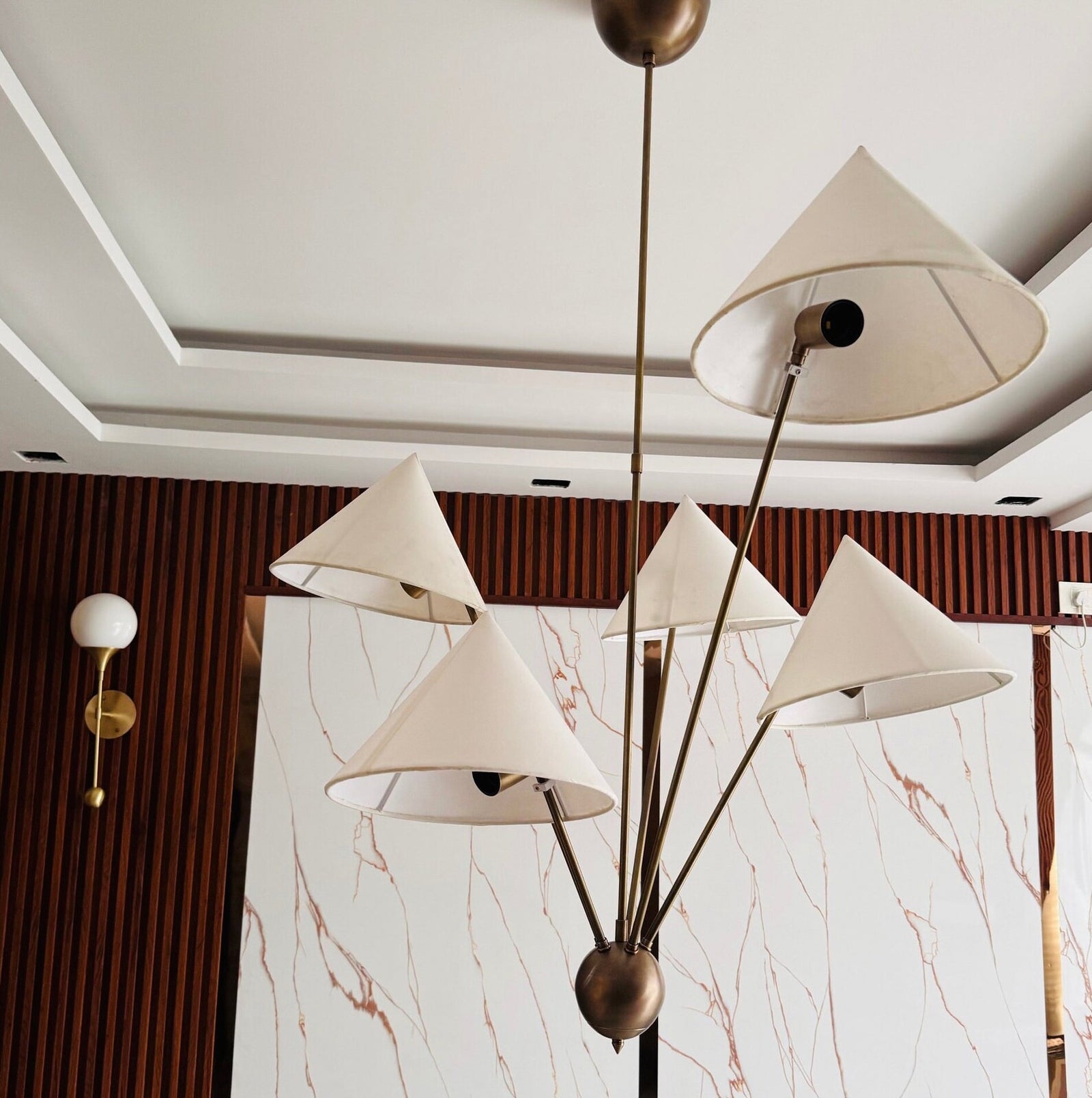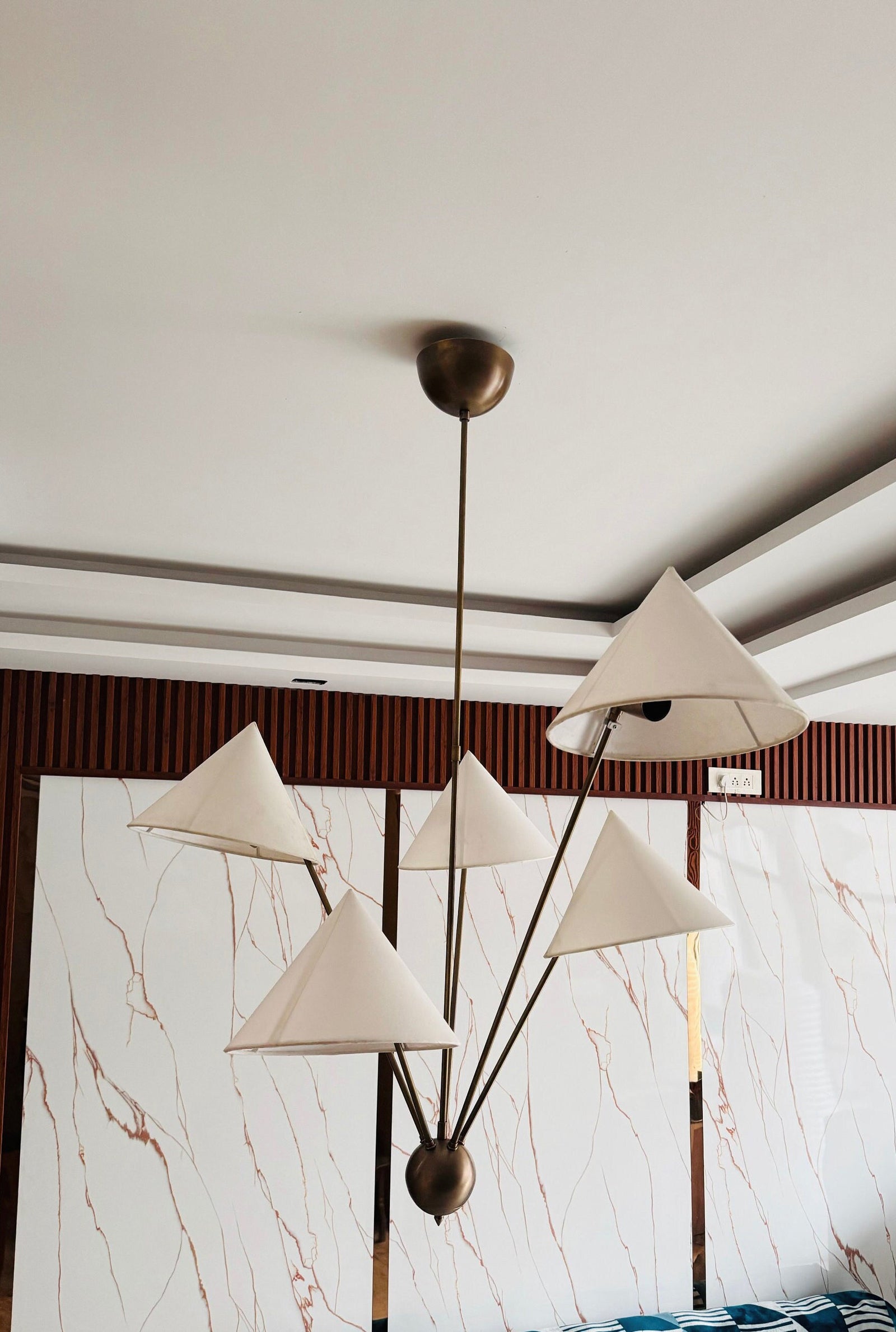 The 5-Arm Fabric Cone Chandelier combines modern minimalism with vintage elegance. Its sleek geometric form, defined by simple lines and a rich gold frame, complements the warm beige fabric lampshades. This chandelier creates a cozy yet stylish focal point, perfect for any contemporary space. Inspired by the harmony between simplicity and beauty, it brings balance and warmth to your living area or dining room.