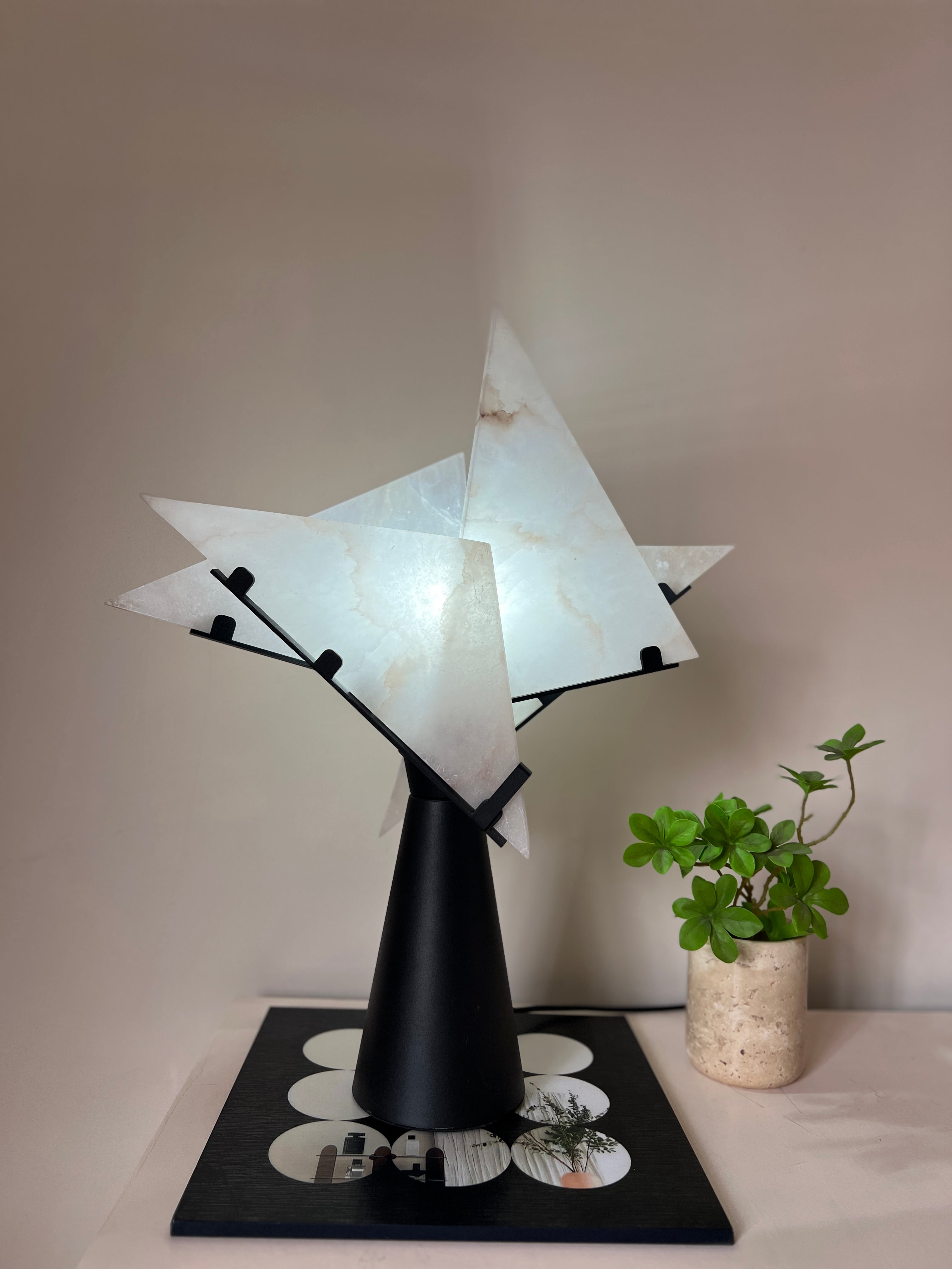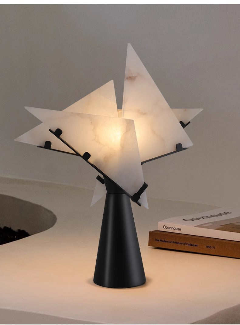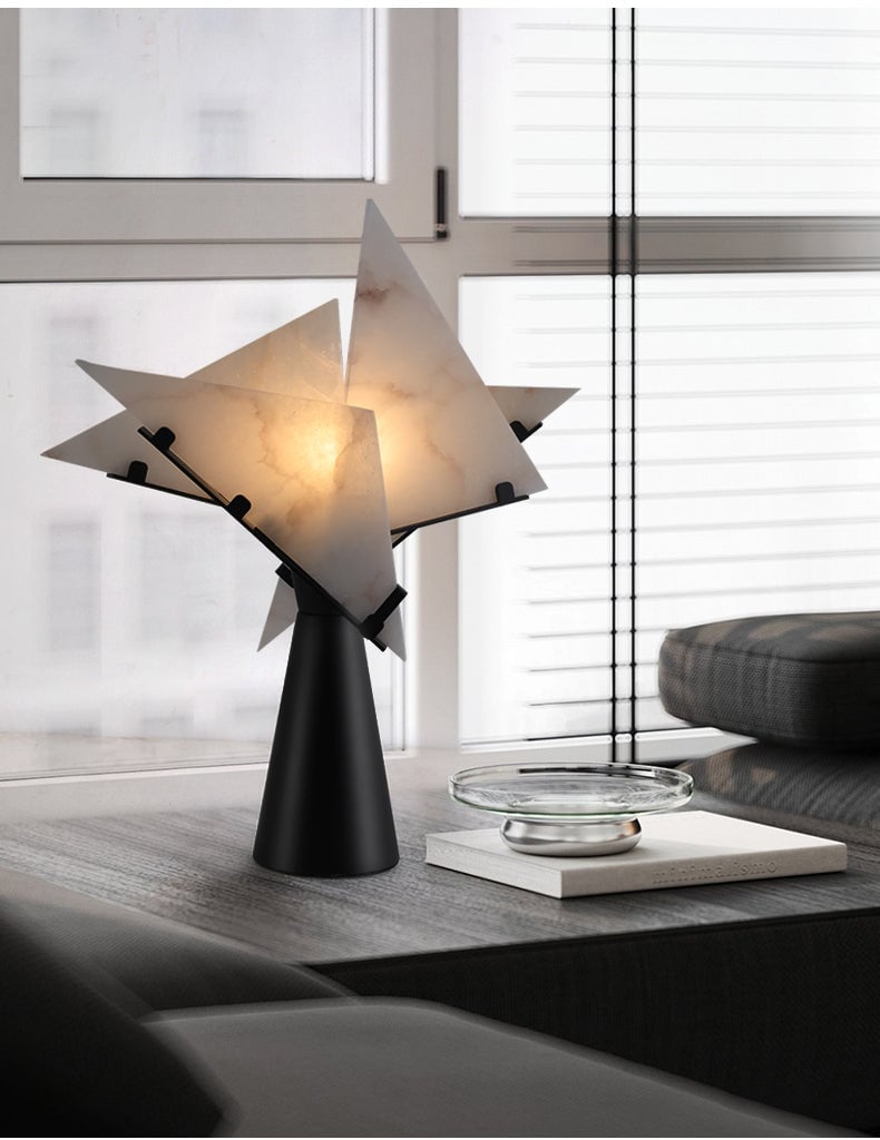 Illuminate your space with the Abstract Alabaster Table Lamp, a perfect blend of modern art and timeless elegance. Featuring uniquely shaped alabaster panels and a sleek black base, this lamp adds a sophisticated touch to any room. Its soft, warm glow creates an inviting ambiance, making it an ideal accent piece for your living room, bedroom, or office. Elevate your interior decor with this distinctive and artistic lighting solution.