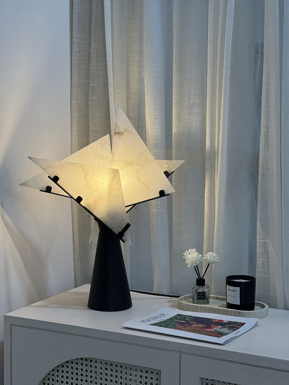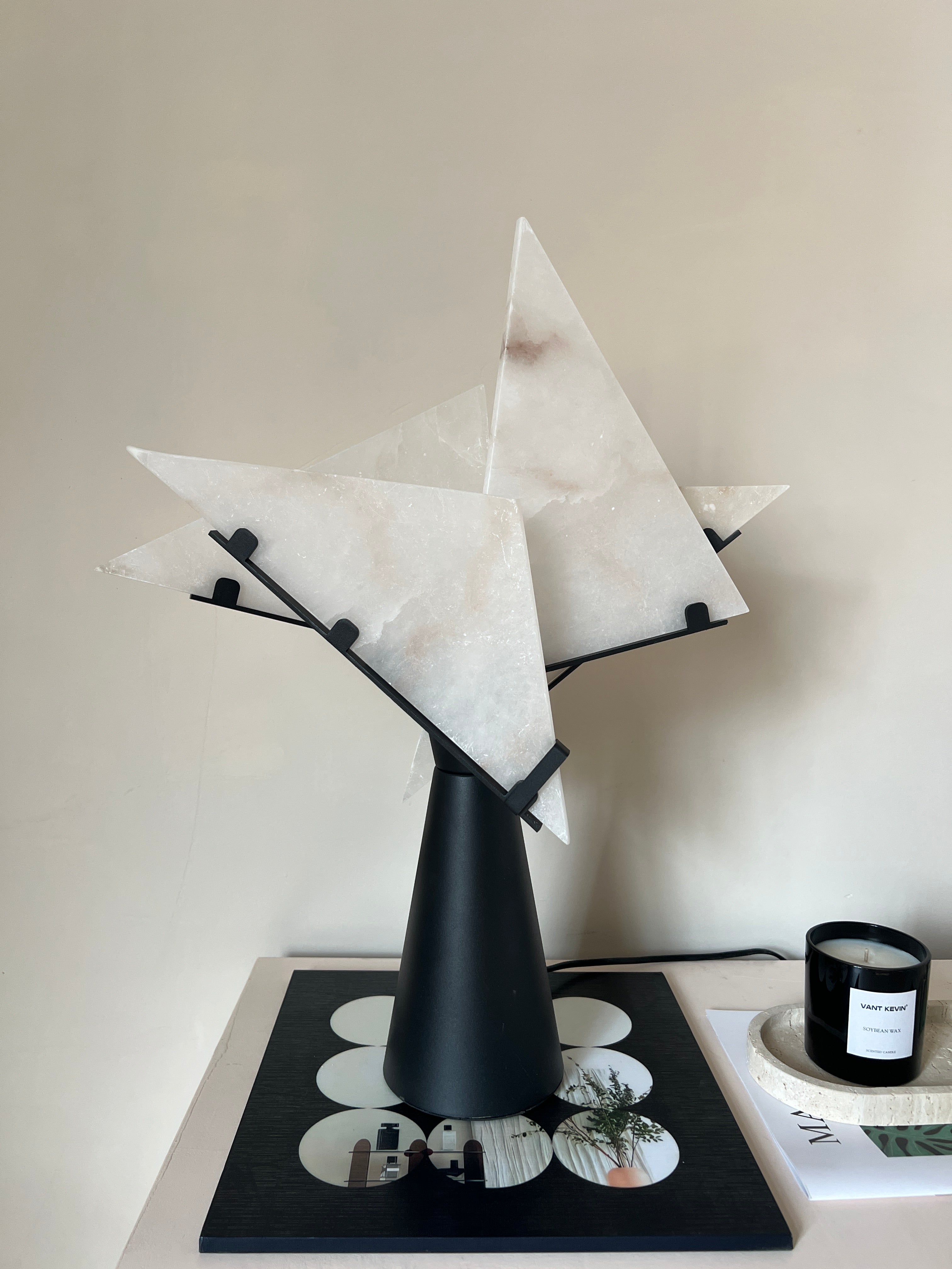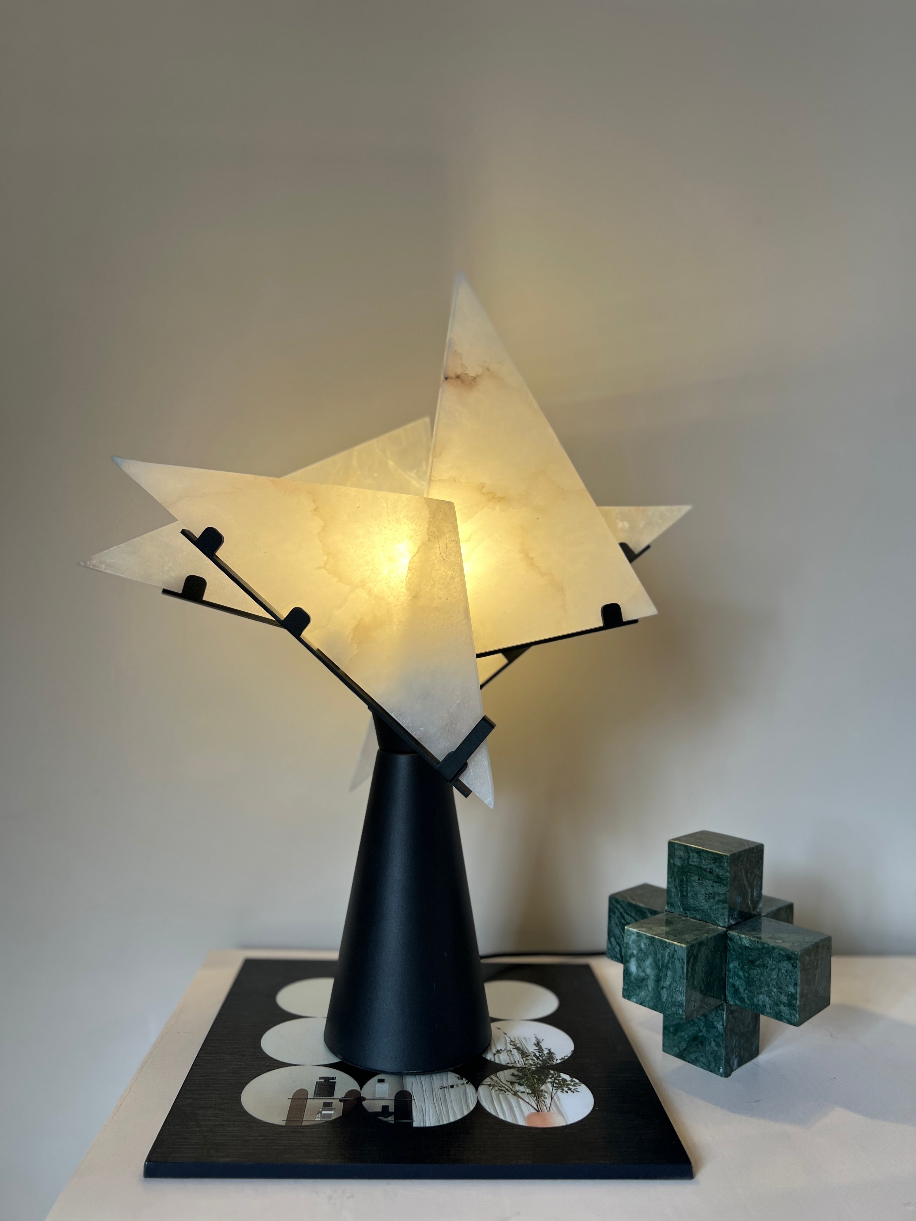Illuminate your space with the Abstract Alabaster Table Lamp, a perfect blend of modern art and timeless elegance. Featuring uniquely shaped alabaster panels and a sleek black base, this lamp adds a sophisticated touch to any room. Its soft, warm glow creates an inviting ambiance, making it an ideal accent piece for your living room, bedroom, or office. Elevate your interior decor with this distinctive and artistic lighting solution.