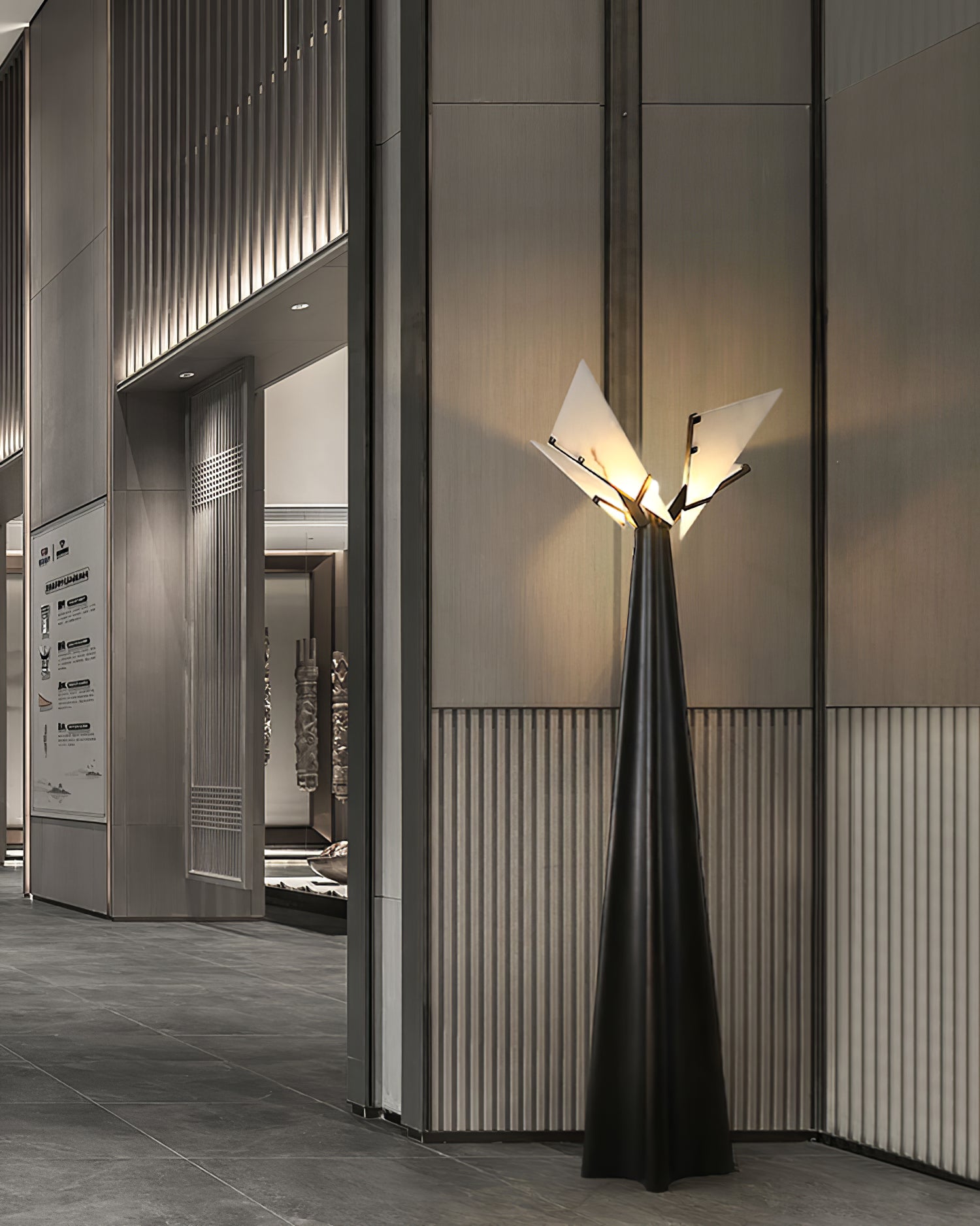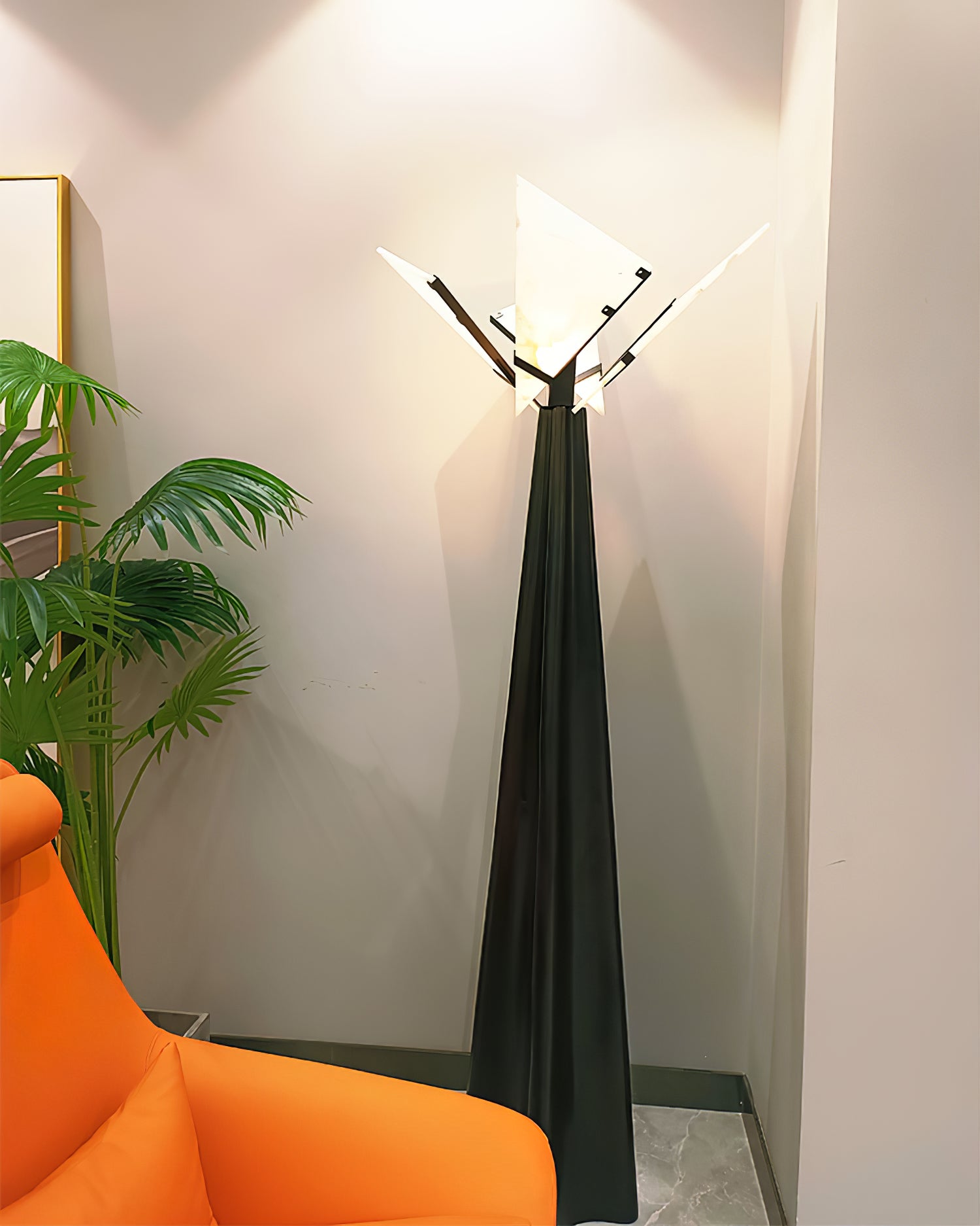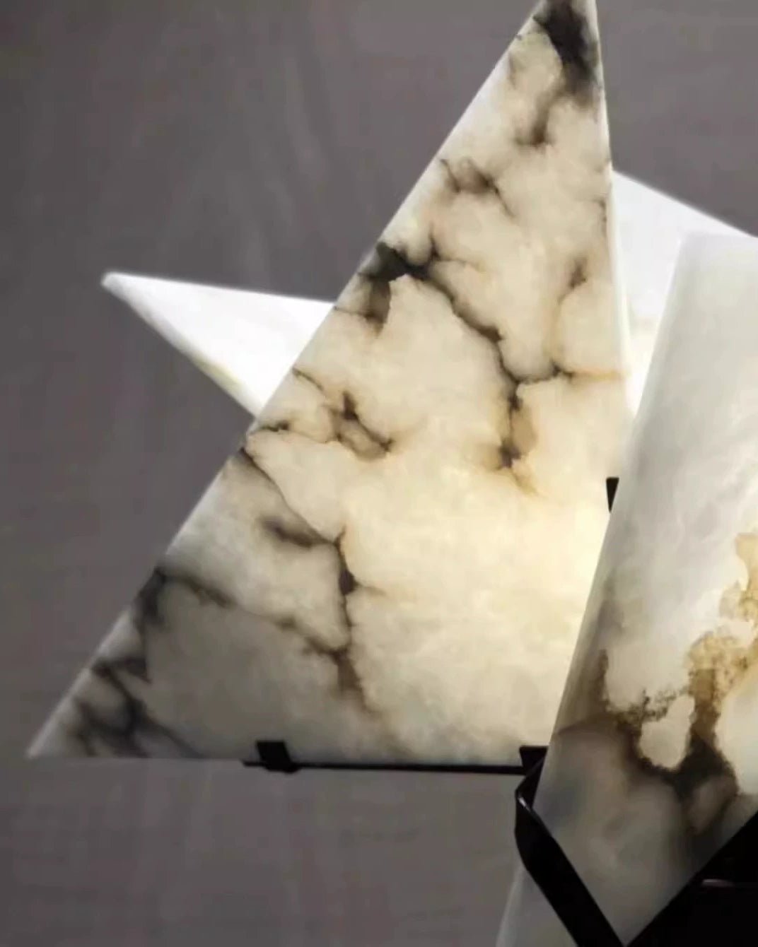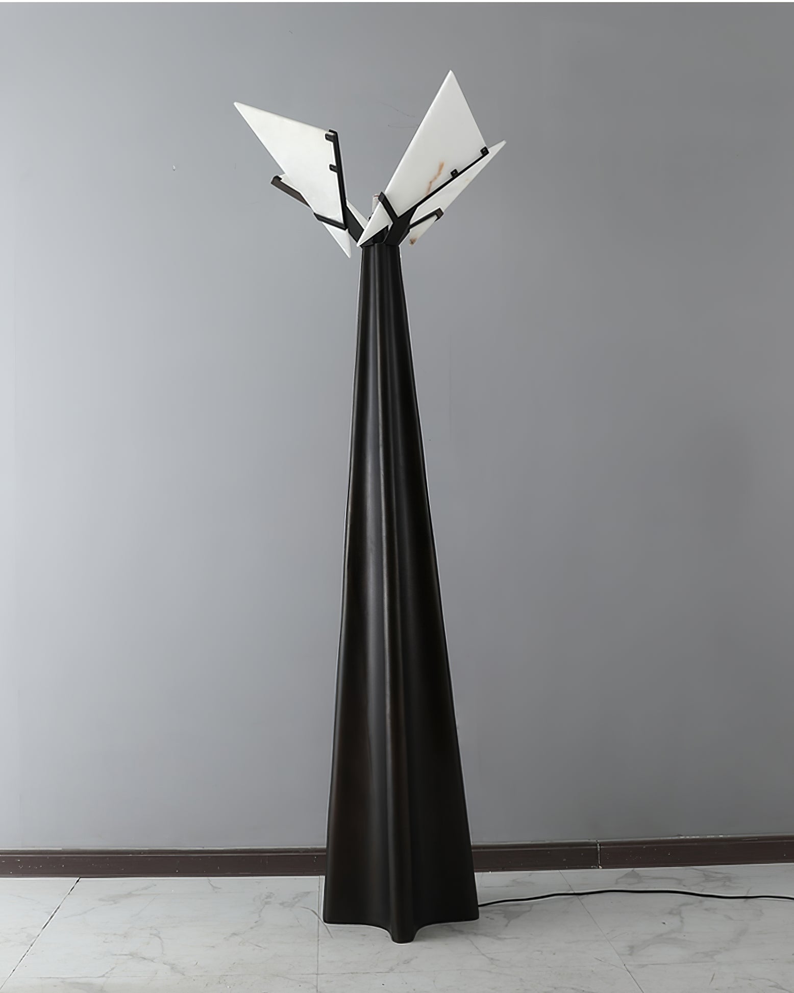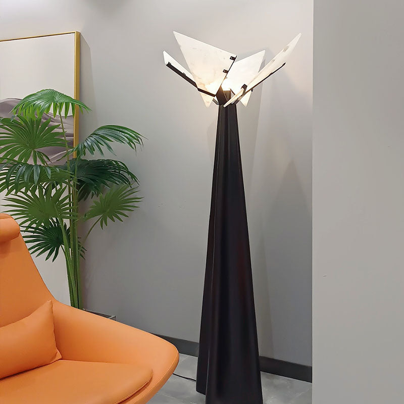 Illuminate your space with the Abstract Black and Alabaster Floor Light. This unique lamp features a striking geometric design with alabaster panels and a sleek black base, adding a touch of modern sophistication to any room. Perfect for living rooms, offices, or lounges, it provides warm ambient lighting while serving as an eye-catching art piece.