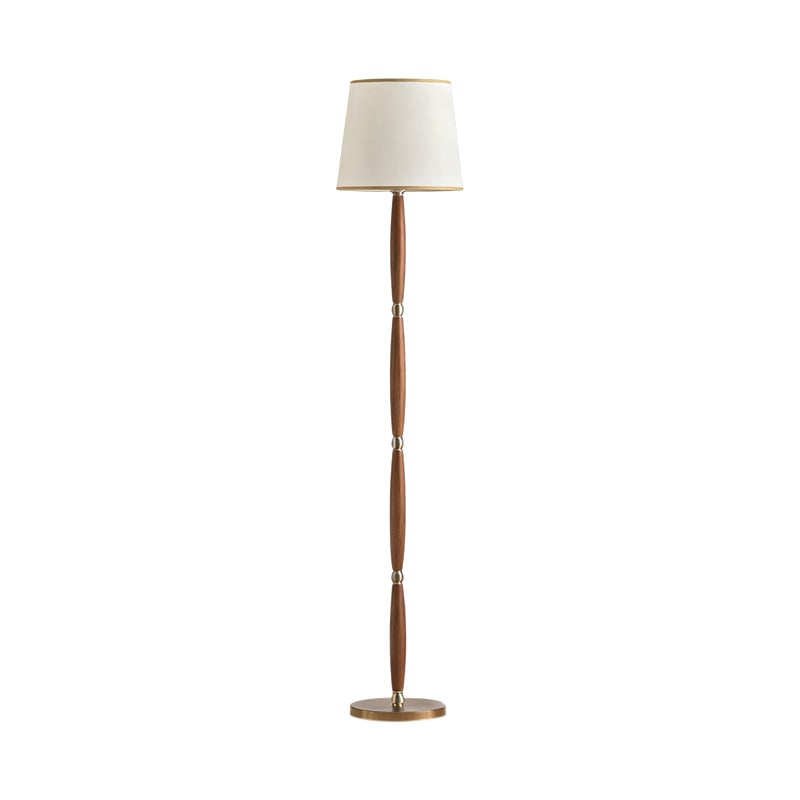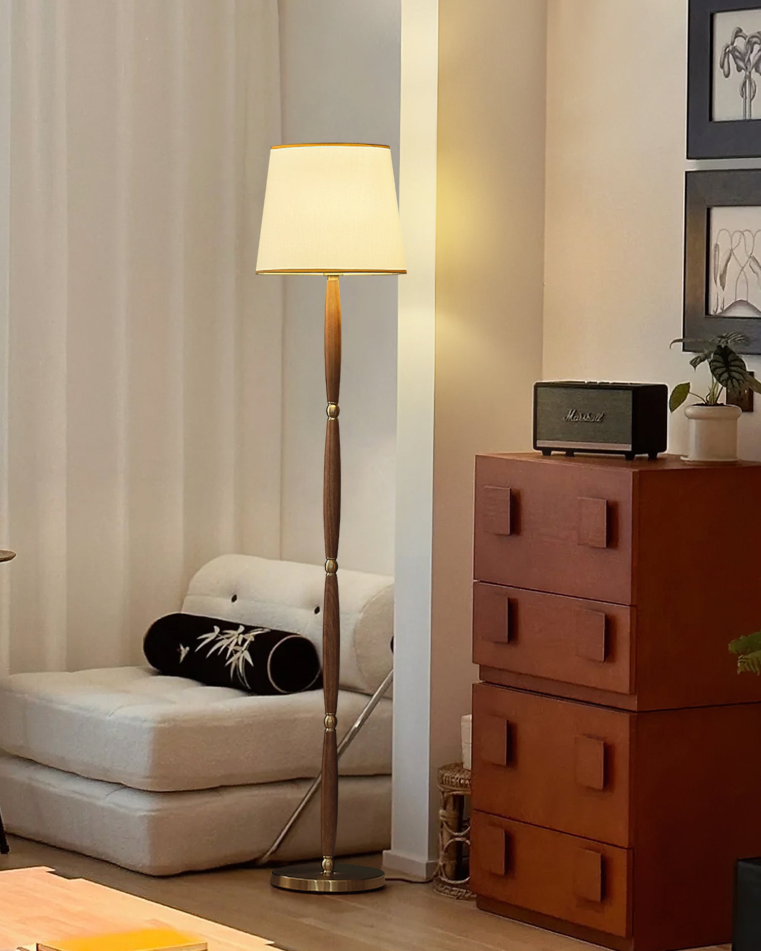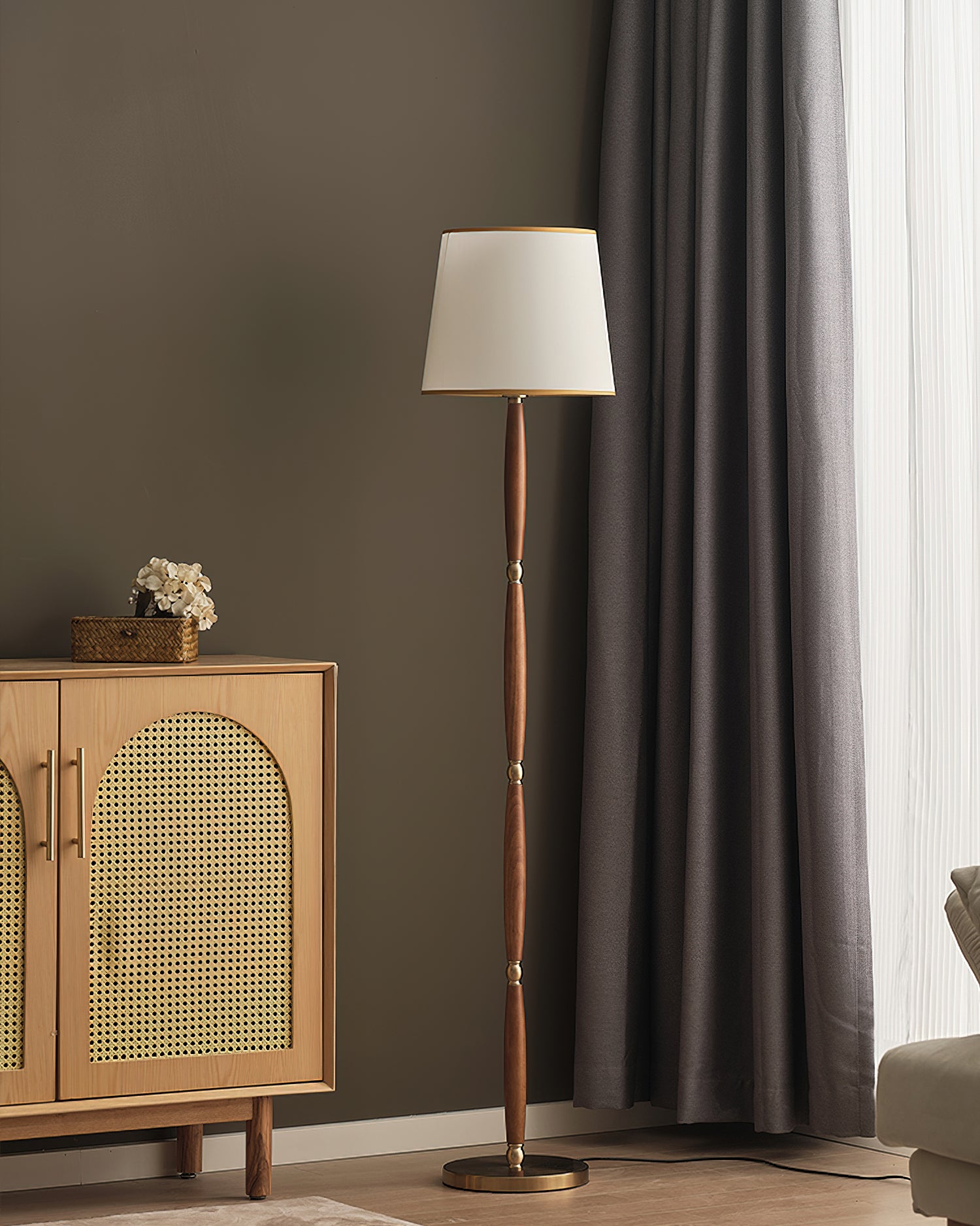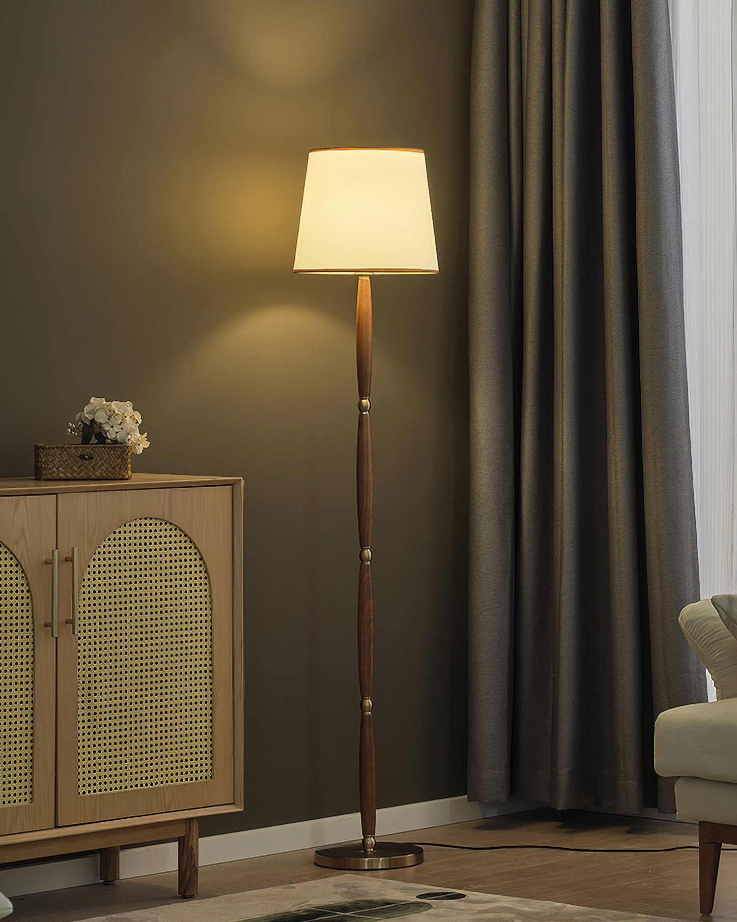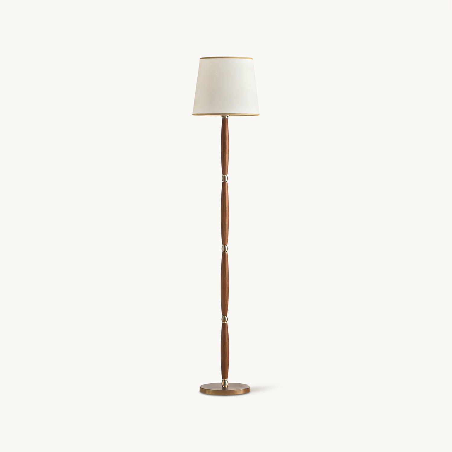 The Adaire Floor Lamp by Mooijane embodies timeless sophistication through refined simplicity. Its slender, tapered wood column is accented with polished metal hardware, creating a harmonious balance of warm and cool tones. Topped with a classic fabric shade edged in gold trim, it softly diffuses light, adding a warm and inviting ambiance to living rooms, bedrooms, or study spaces.