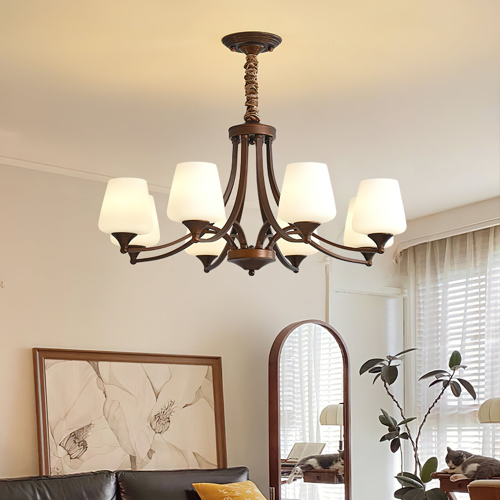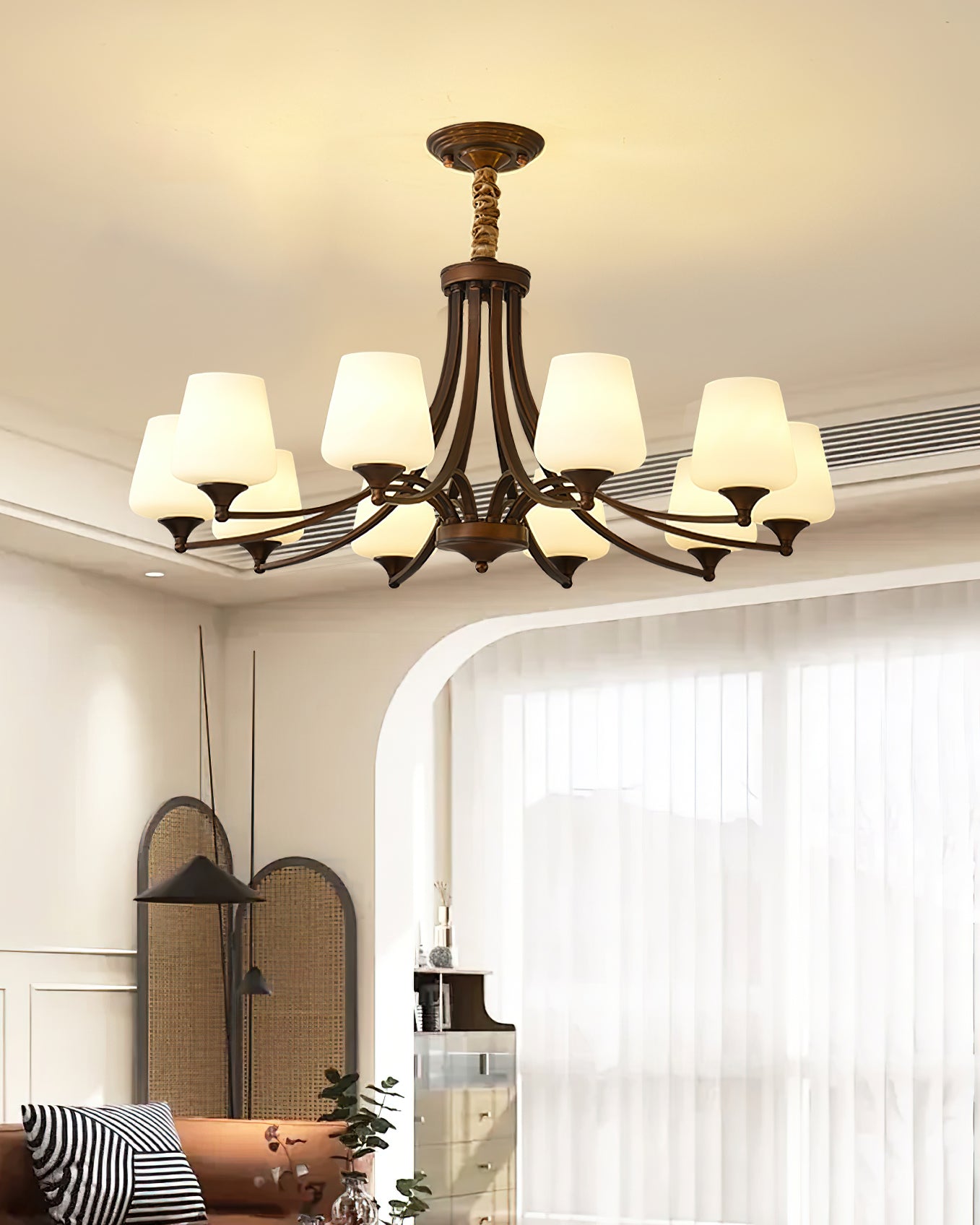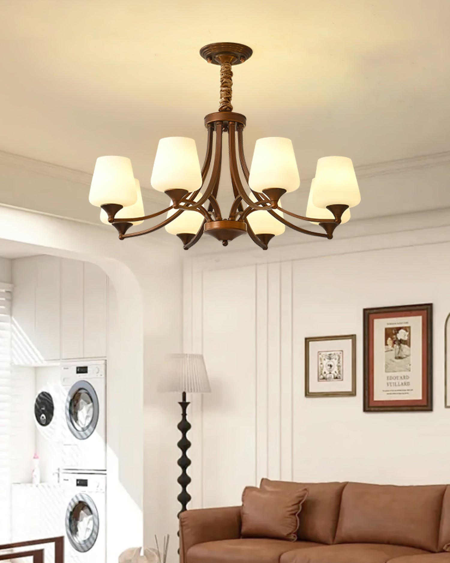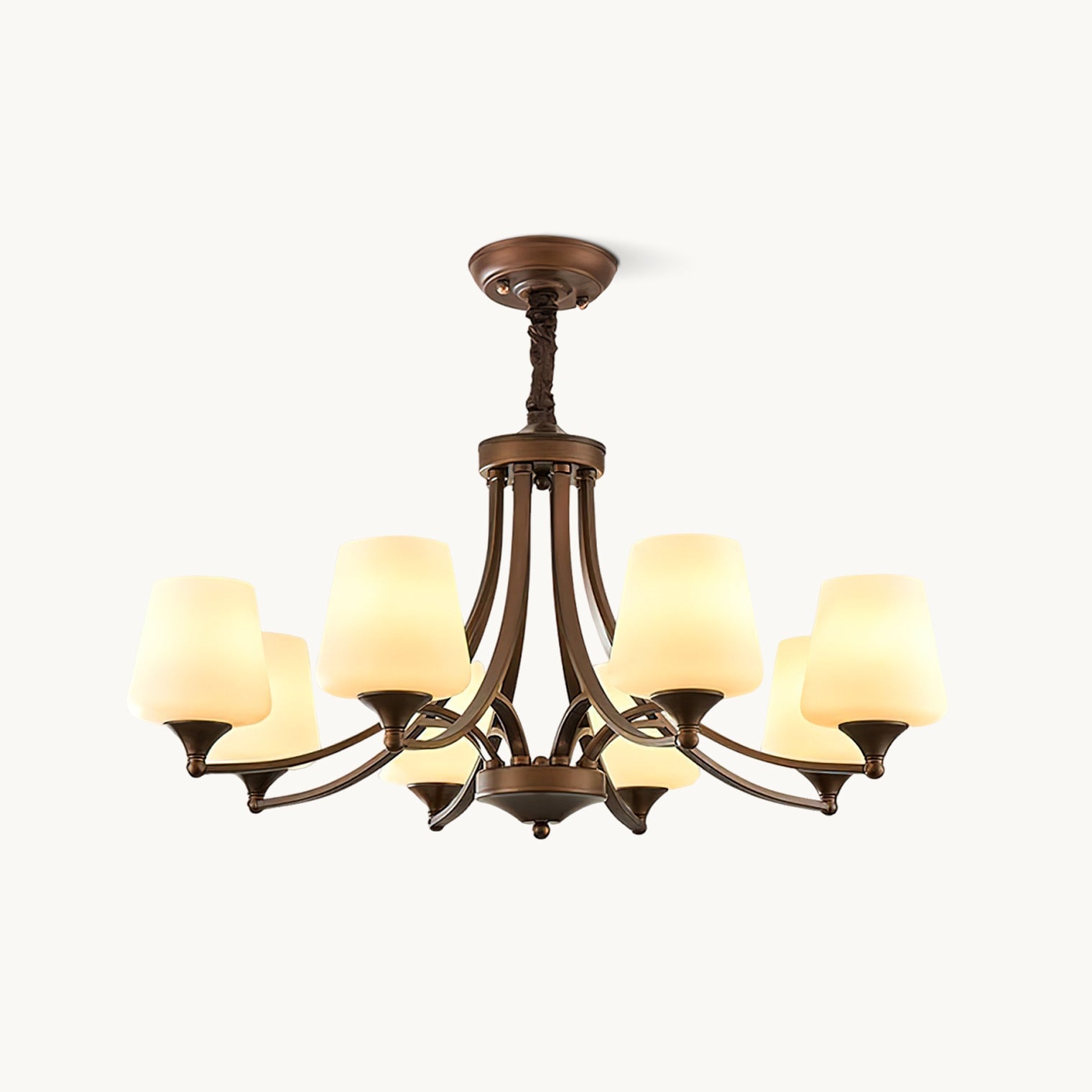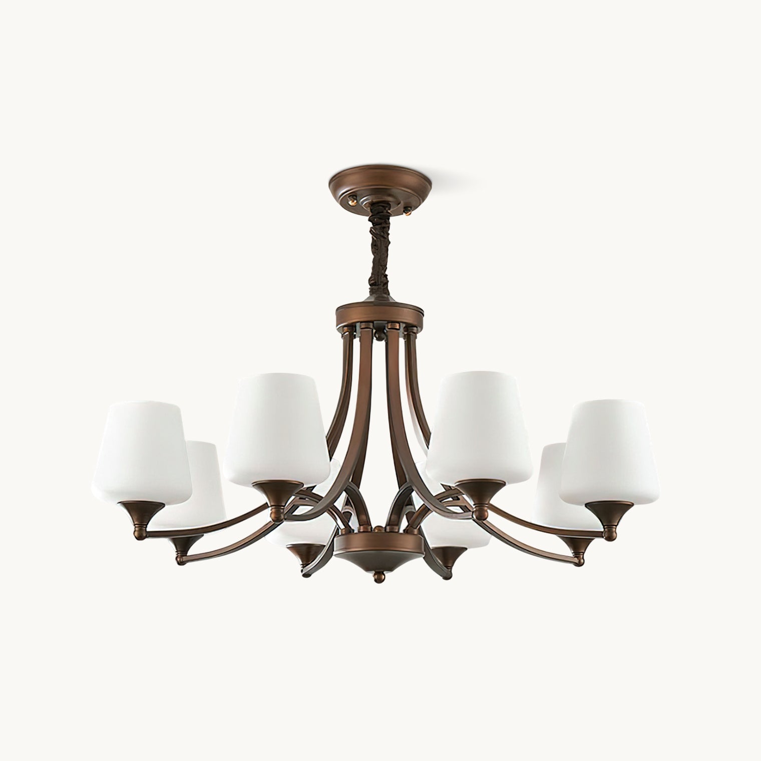 Inspired by the warmth of a sunset, the Adalyn Chandelier by Mooijane features a rich reddish-brown frame paired with frosted glass shades that cast a soft, ambient glow. Blending rustic charm with modern elegance, it’s a perfect centerpiece for both classic and contemporary interiors.
