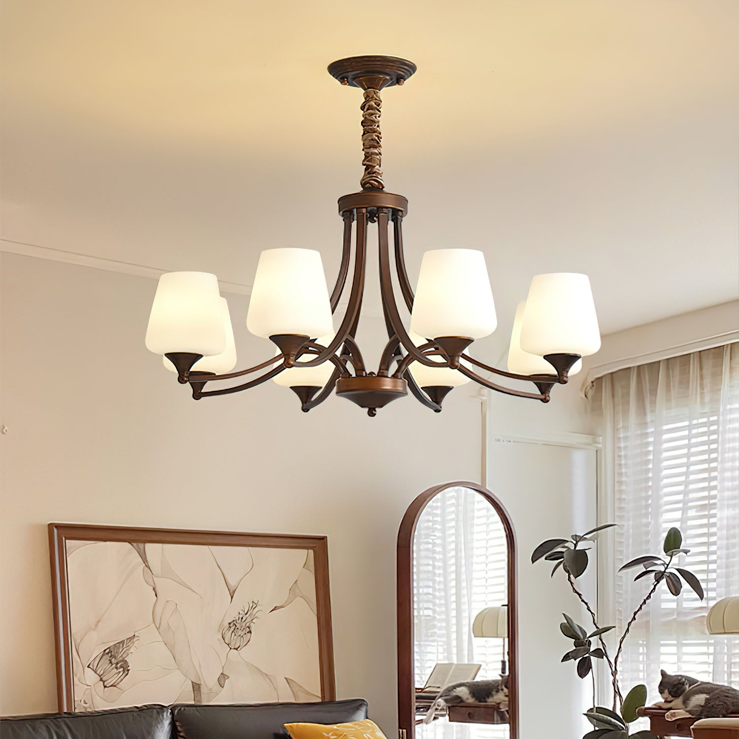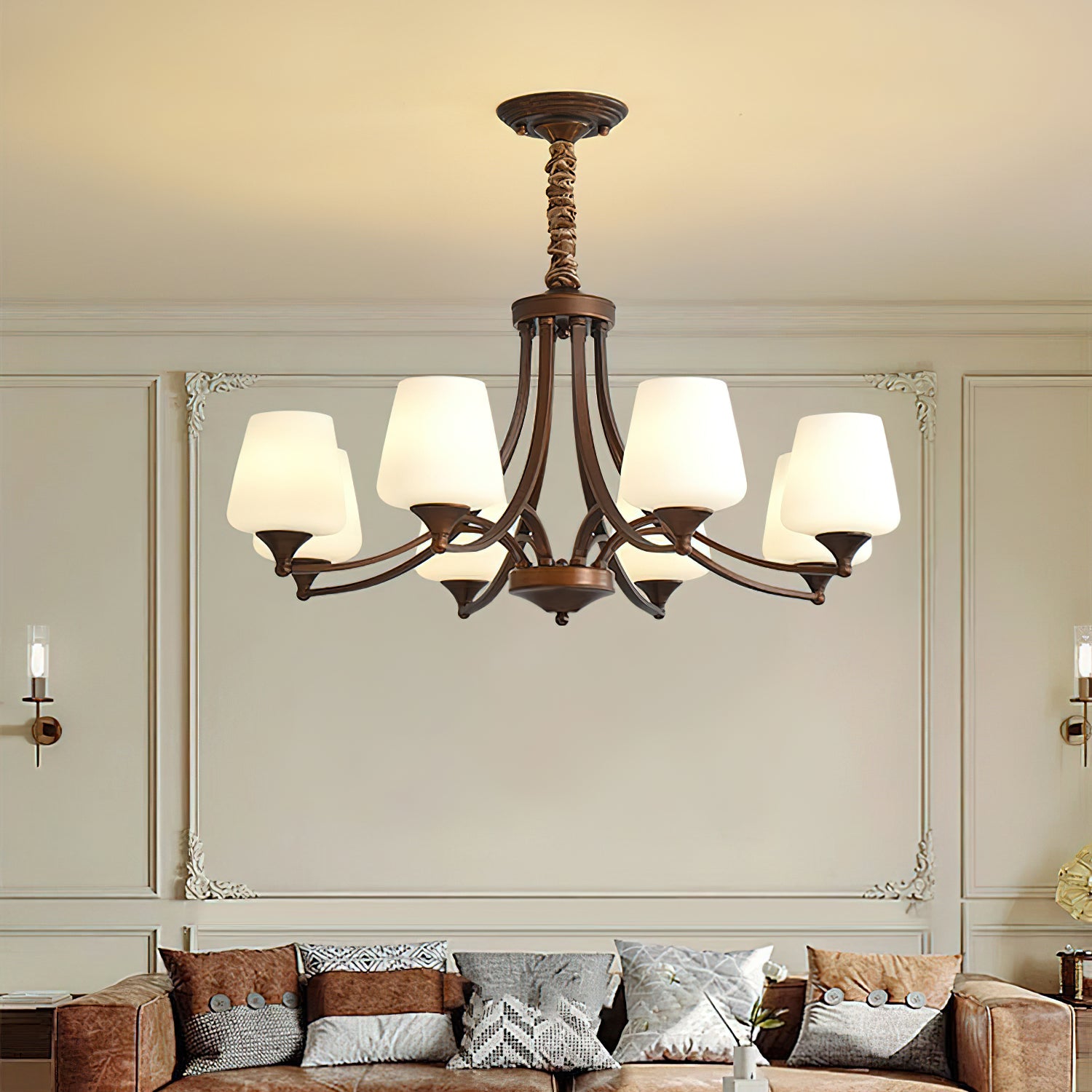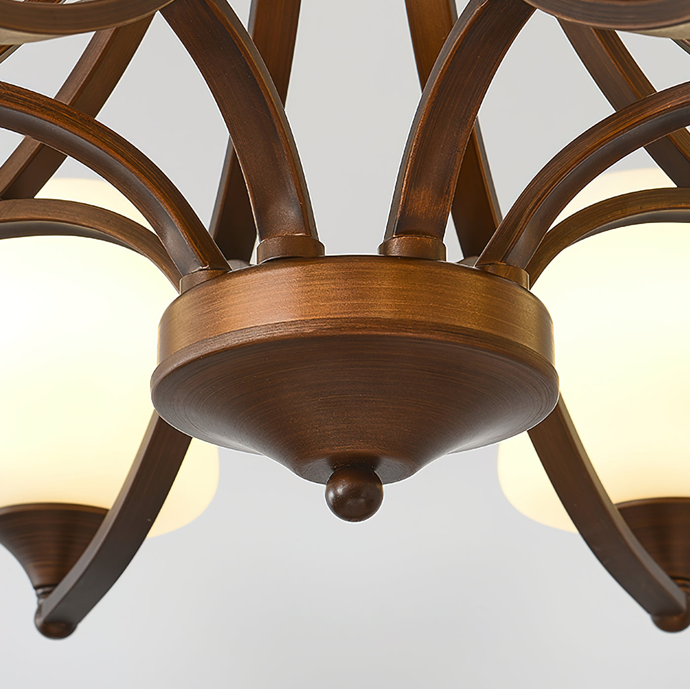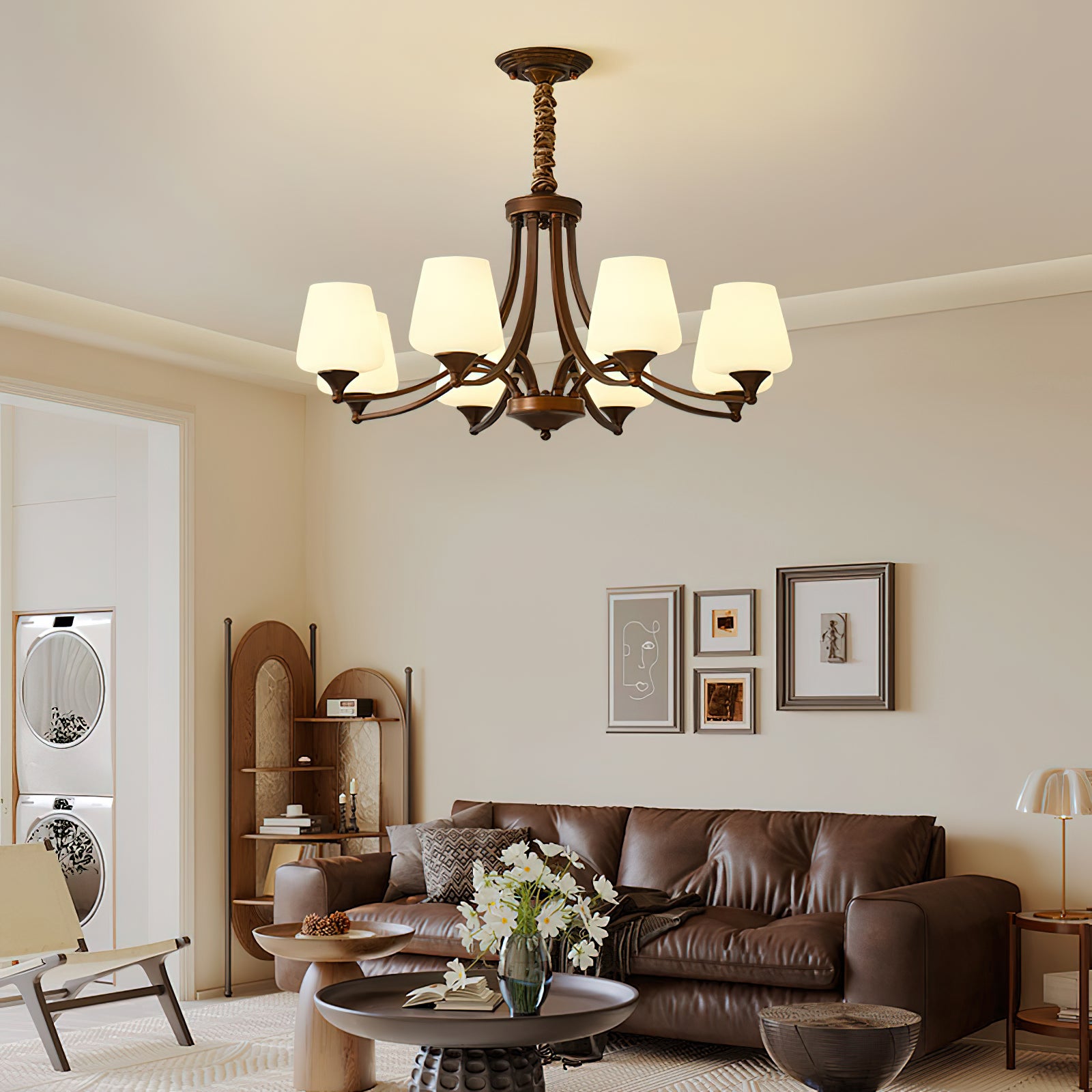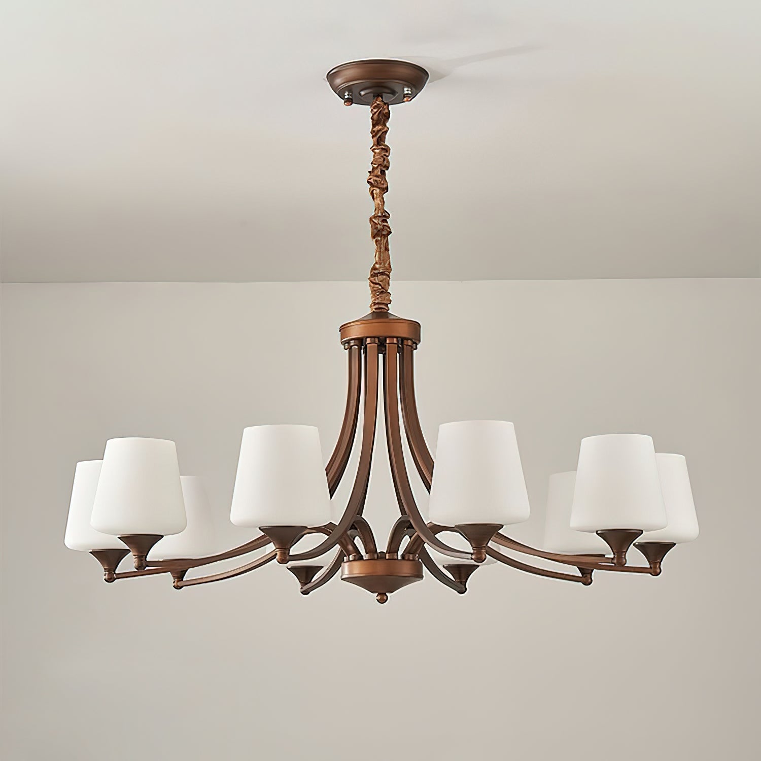 Inspired by the warmth of a sunset, the Adalyn Chandelier by Mooijane features a rich reddish-brown frame paired with frosted glass shades that cast a soft, ambient glow. Blending rustic charm with modern elegance, it’s a perfect centerpiece for both classic and contemporary interiors.