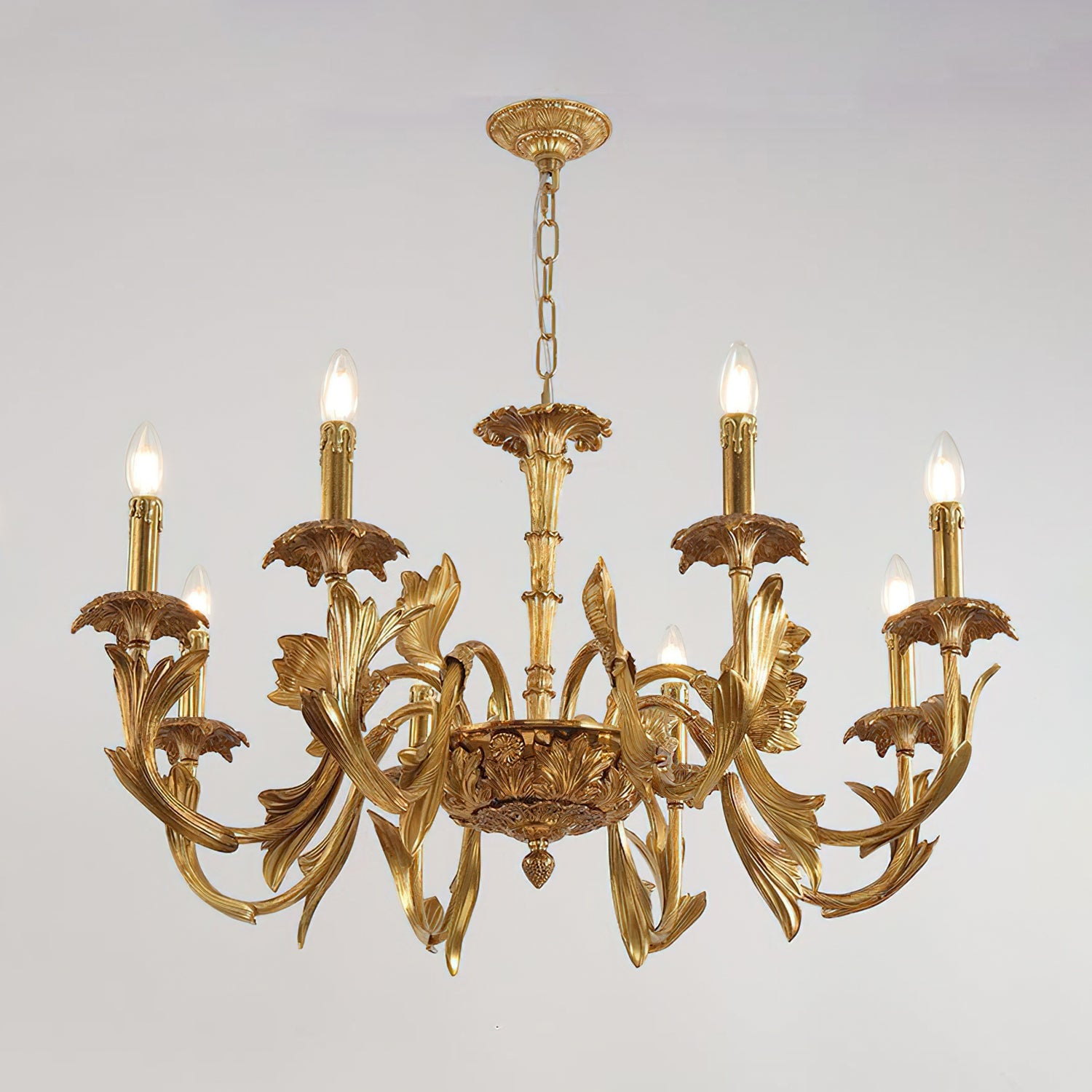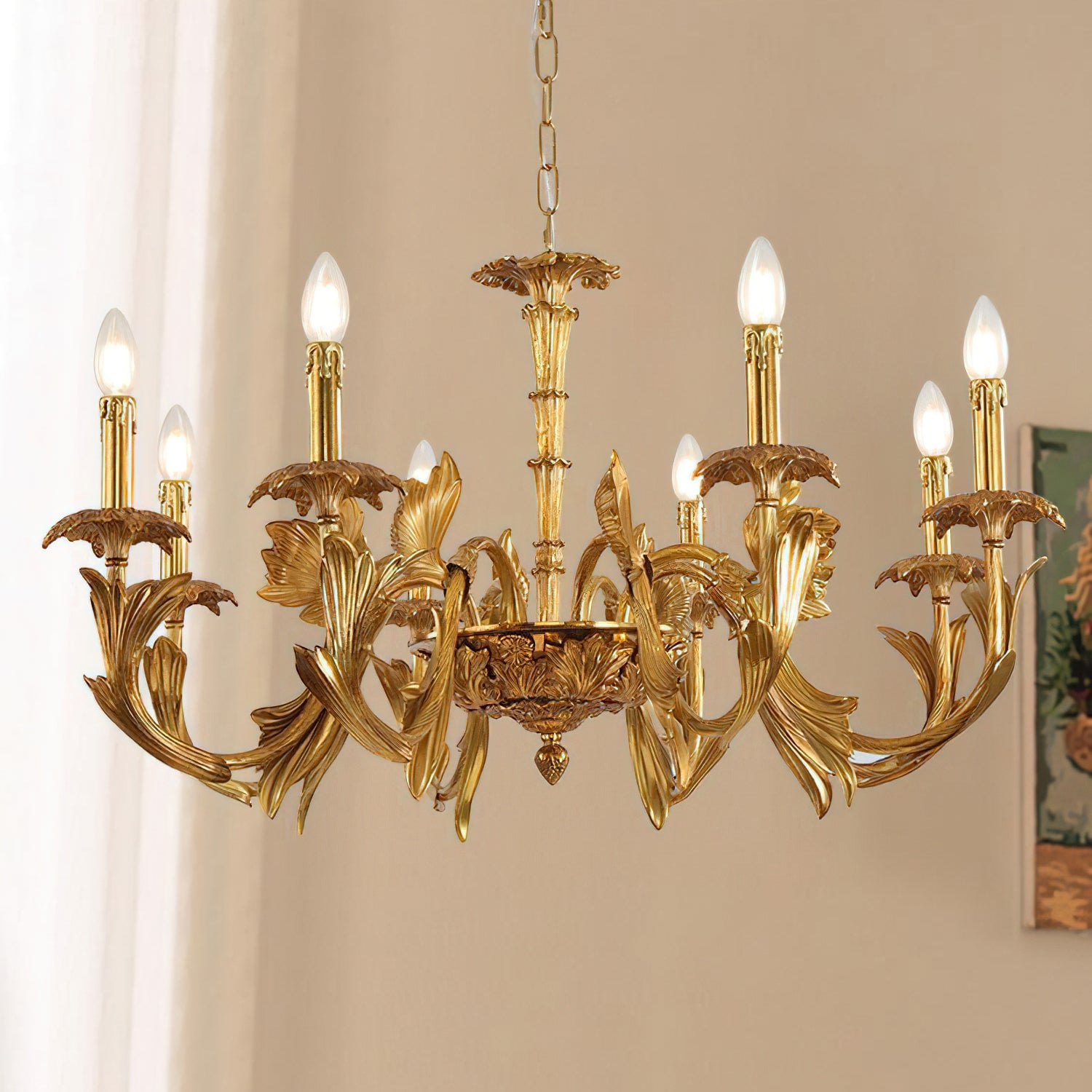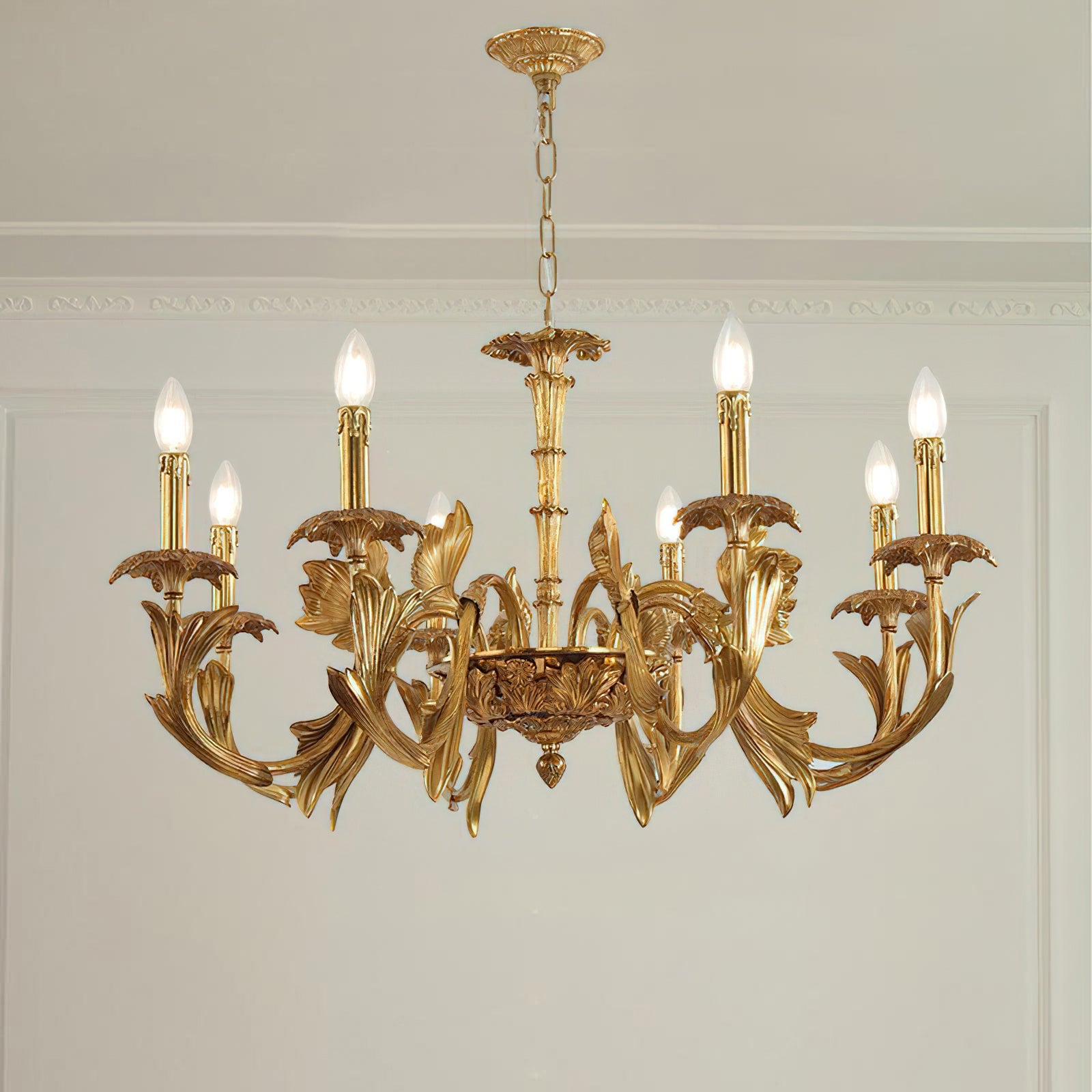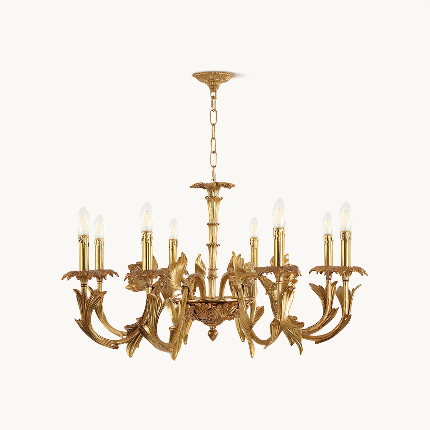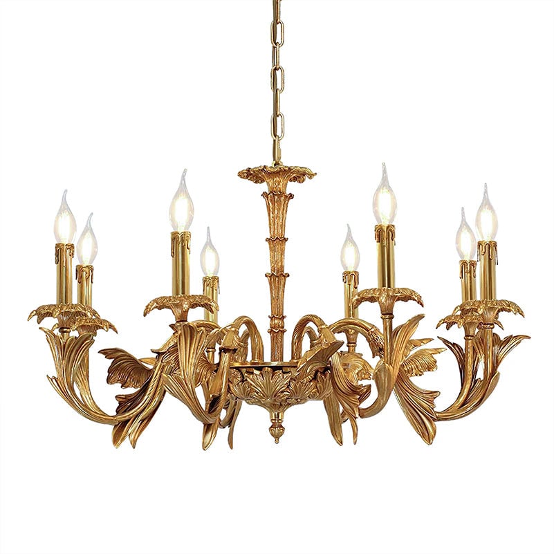 The Adeline Chandelier by Mooijane showcases classical grandeur and exquisite craftsmanship. Finished in rich gold, its sculptural arms feature delicate leaf motifs inspired by baroque artistry. Candle-style lights cast a warm, radiant glow, enhancing the chandelier’s regal character. Perfect for dining rooms, grand foyers, or formal living spaces, this timeless piece brings an aura of elegance and sophistication to any interior.