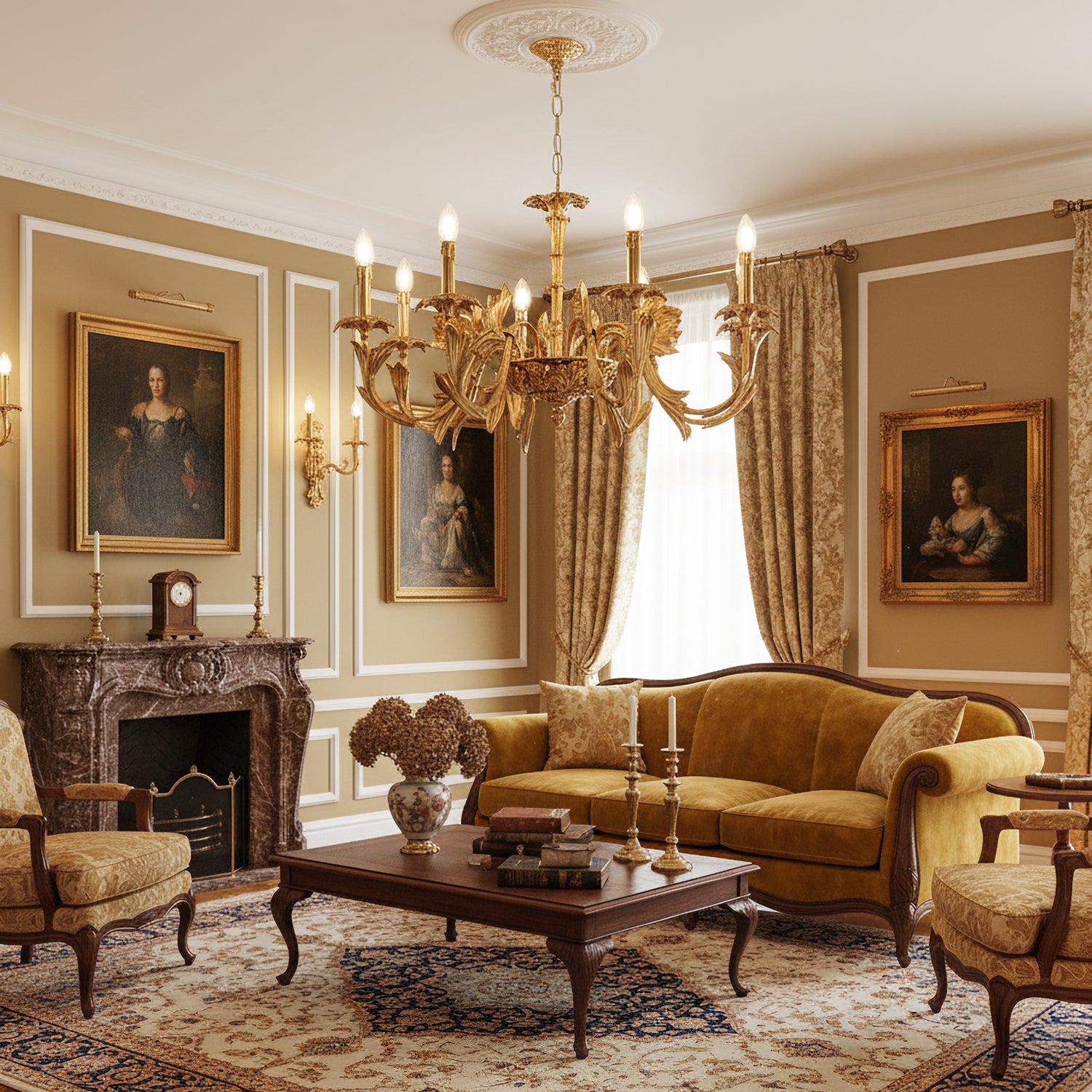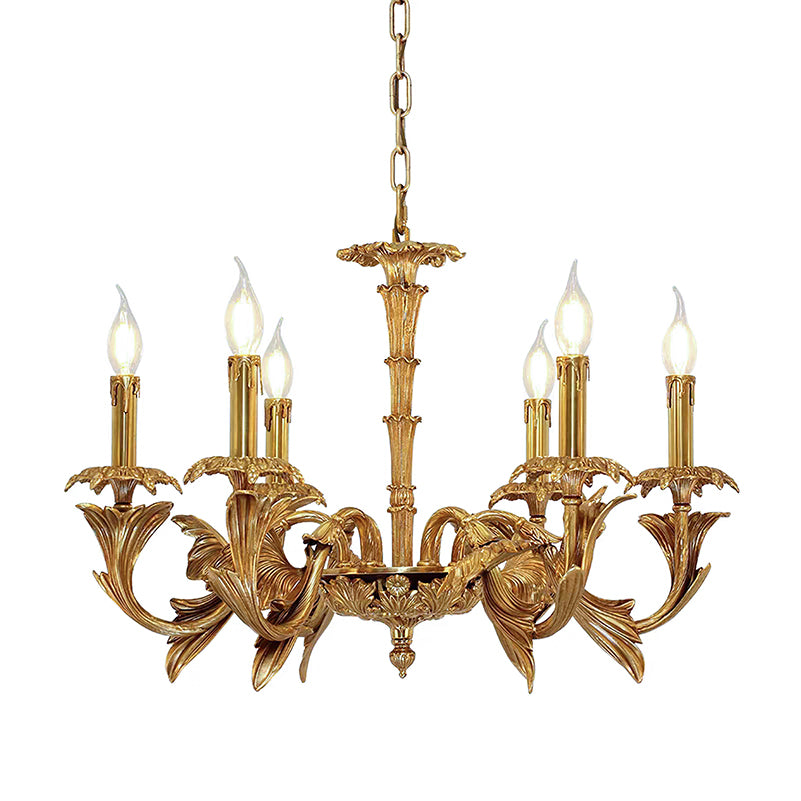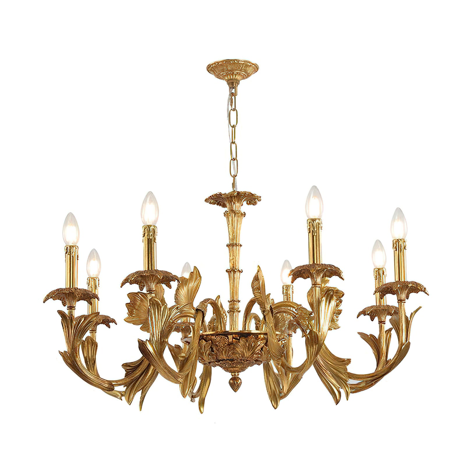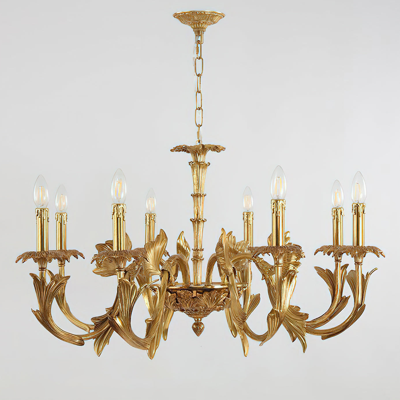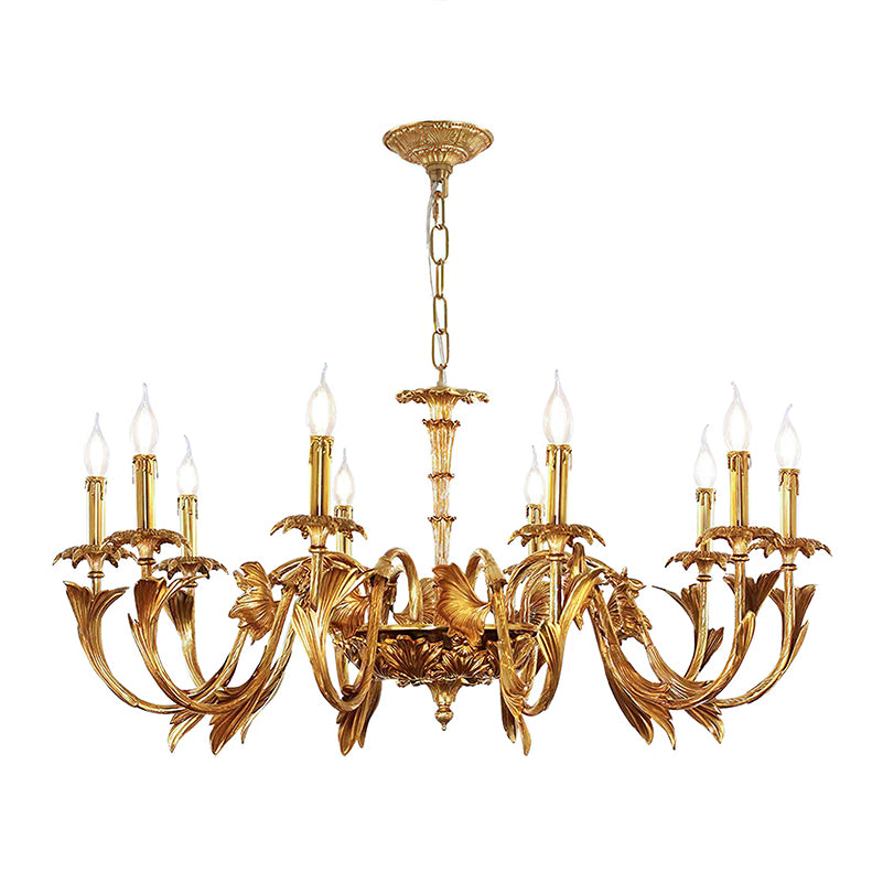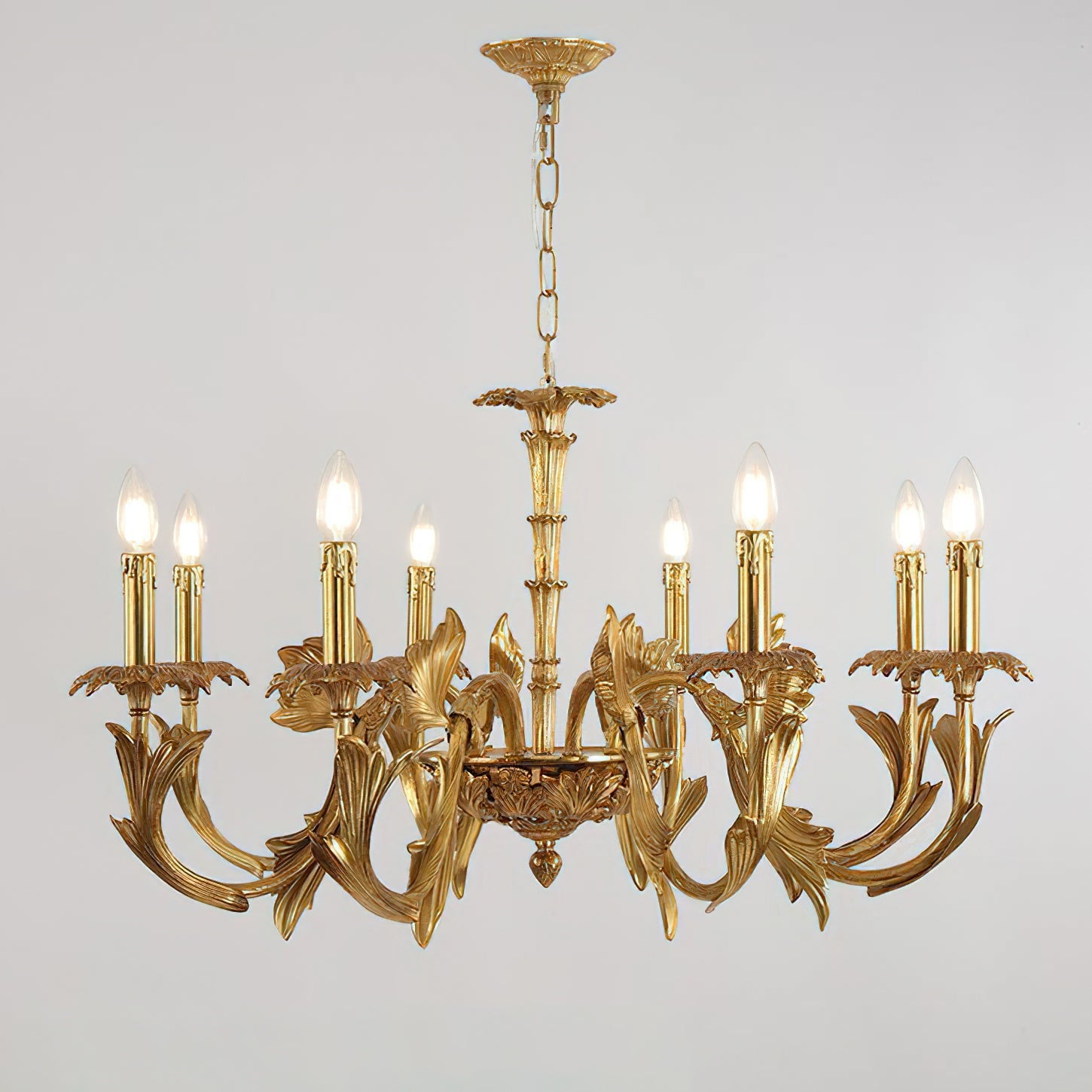 The Adeline Chandelier by Mooijane showcases classical grandeur and exquisite craftsmanship. Finished in rich gold, its sculptural arms feature delicate leaf motifs inspired by baroque artistry. Candle-style lights cast a warm, radiant glow, enhancing the chandelier’s regal character. Perfect for dining rooms, grand foyers, or formal living spaces, this timeless piece brings an aura of elegance and sophistication to any interior.