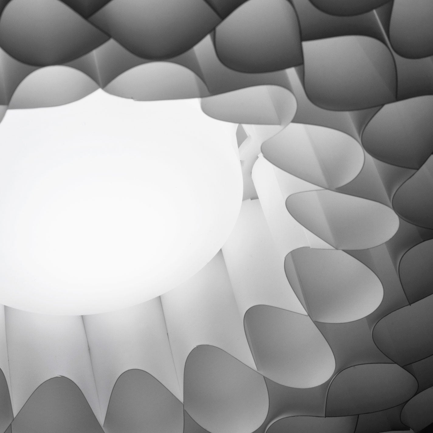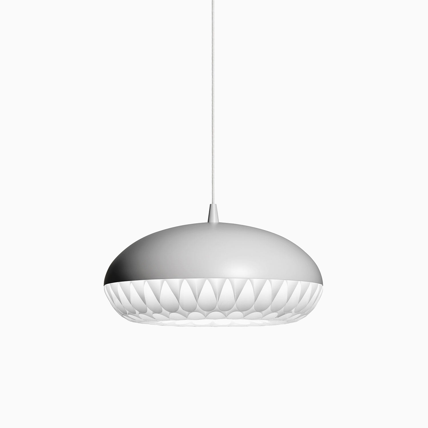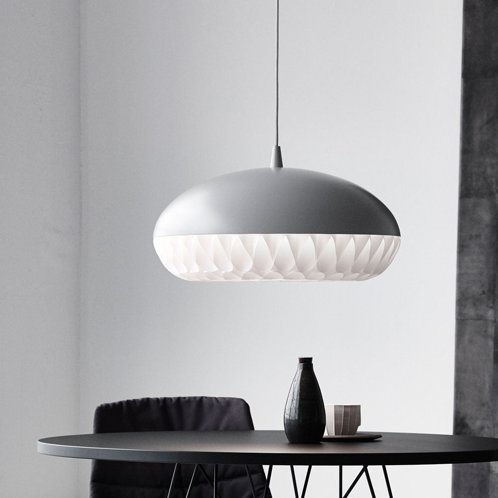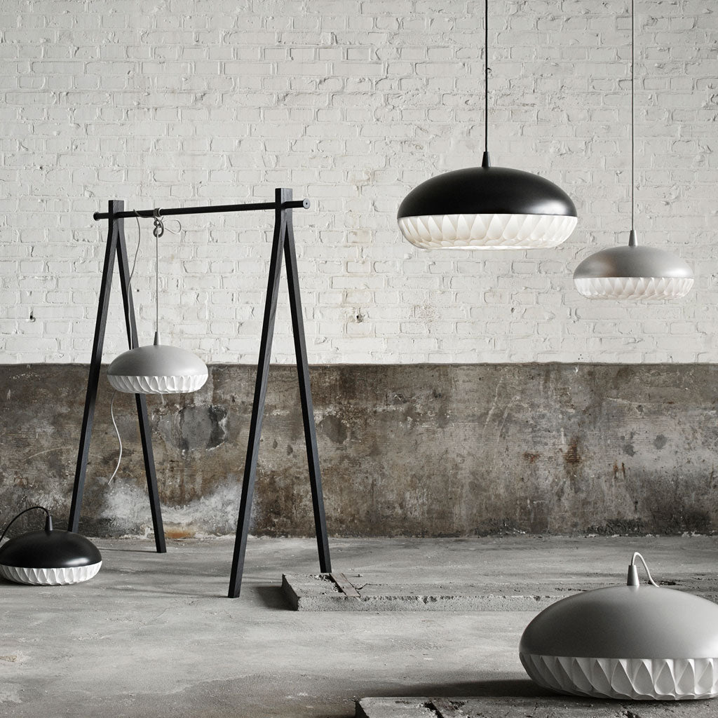 Aeon is a series of beautiful, harmonious, and striking pendants. This is the first pendant in history to take full advantage of the luminous qualities of metal and polypropylene in a single design. The simple upper shade ensures plenty of light downwards, while the lower shade in polypropylene illuminates and diffuses the light. The gauzy lower shade consists of 8 long bands carefully woven together to create round openings, allowing the light to stream through unhindered.