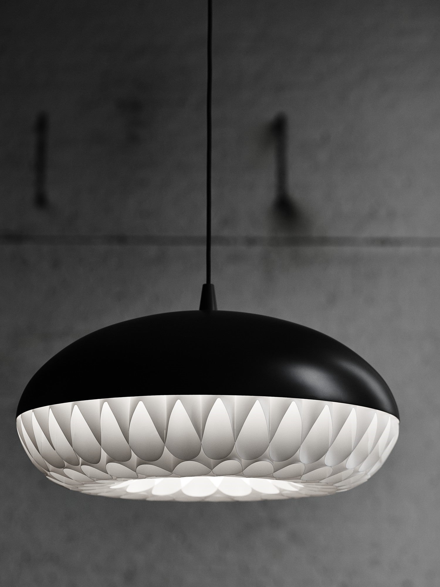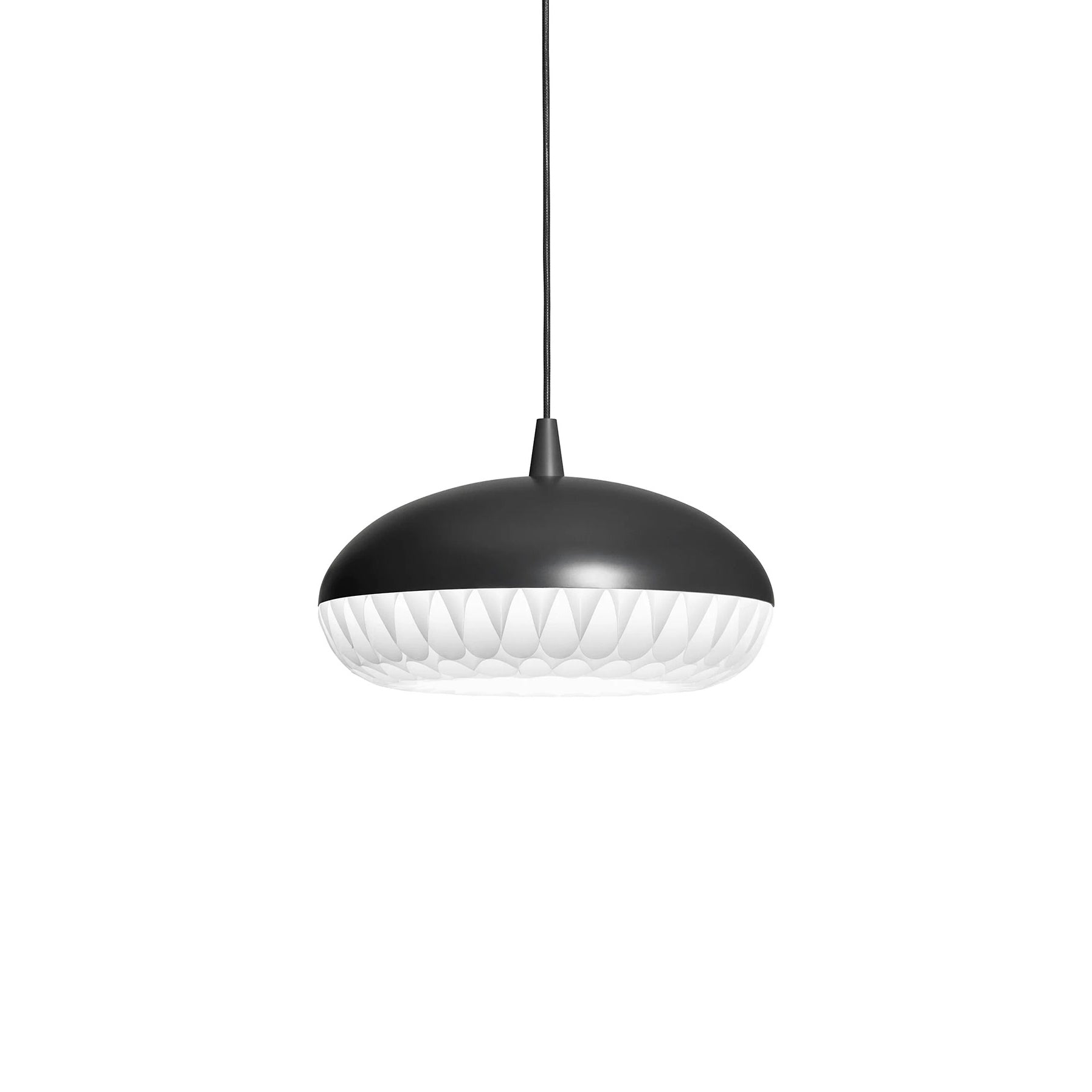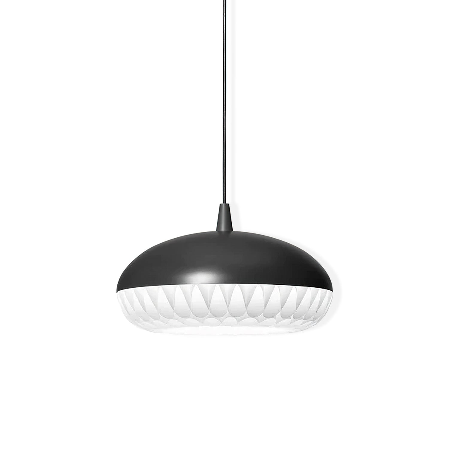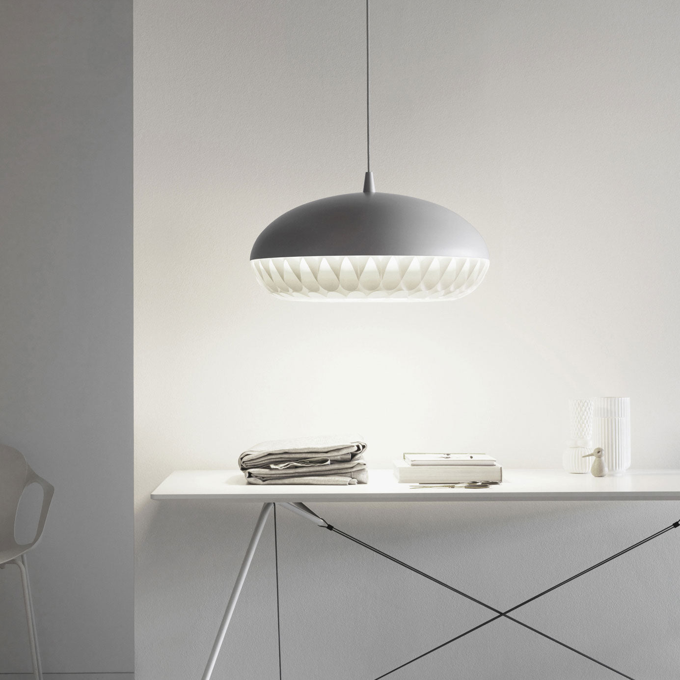 Aeon is a series of beautiful, harmonious, and striking pendants. This is the first pendant in history to take full advantage of the luminous qualities of metal and polypropylene in a single design. The simple upper shade ensures plenty of light downwards, while the lower shade in polypropylene illuminates and diffuses the light. The gauzy lower shade consists of 8 long bands carefully woven together to create round openings, allowing the light to stream through unhindered.