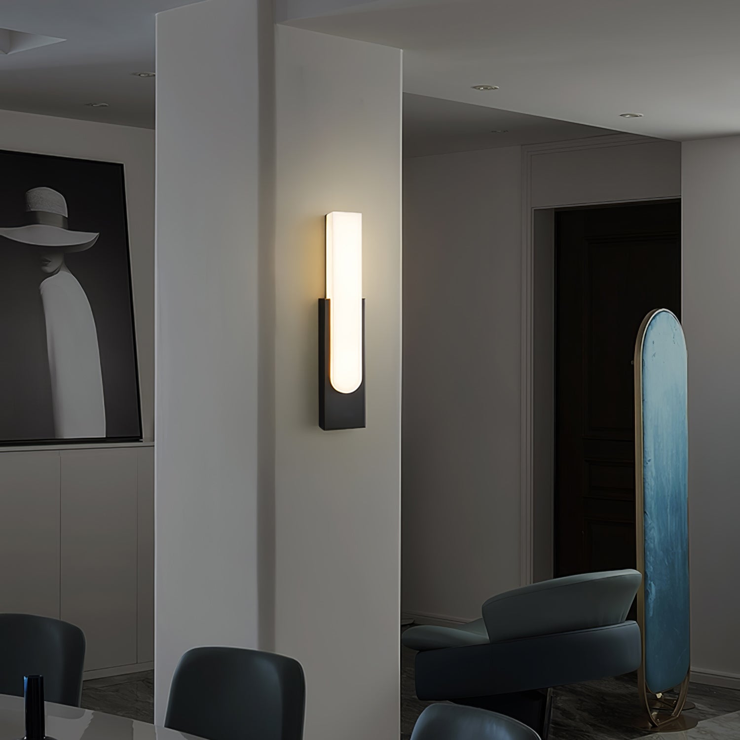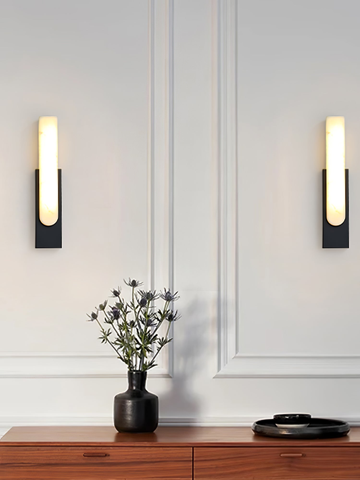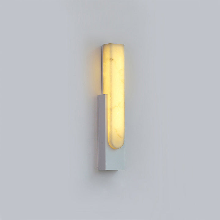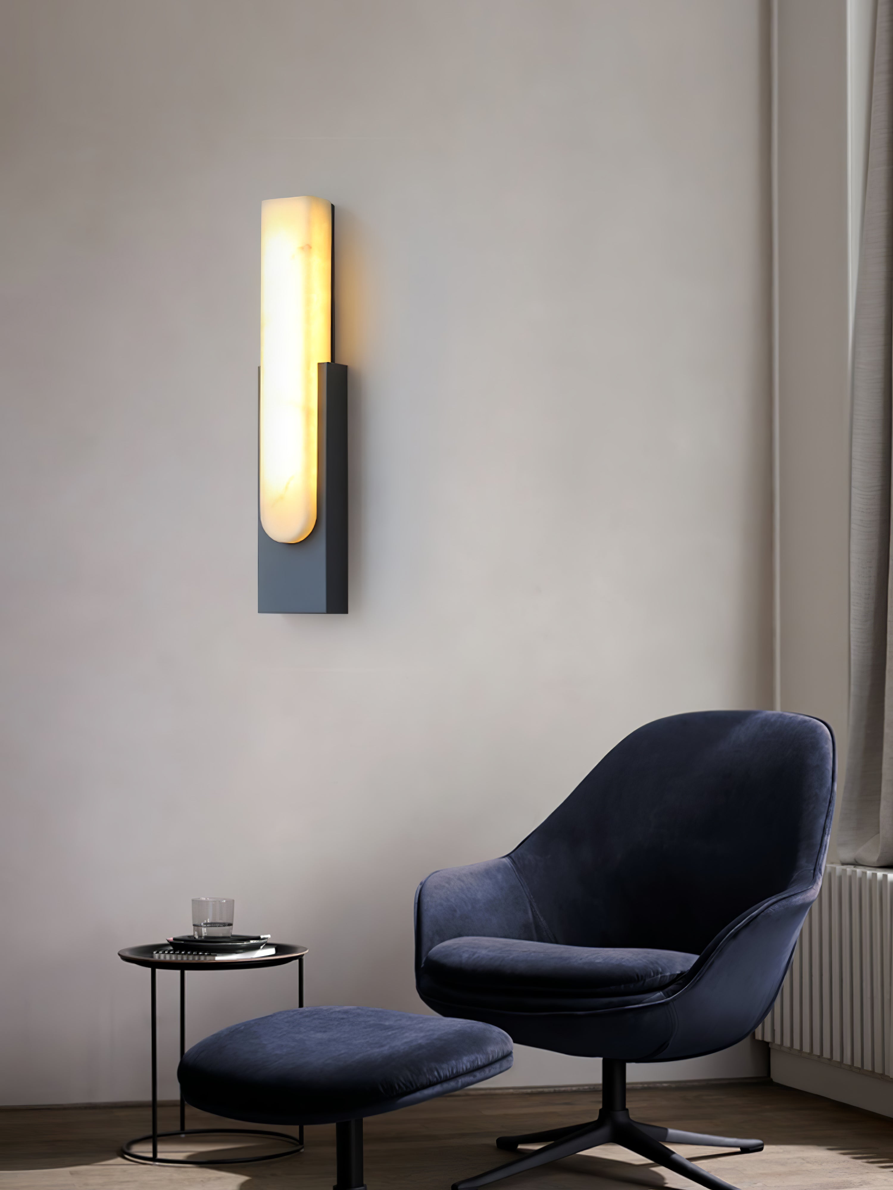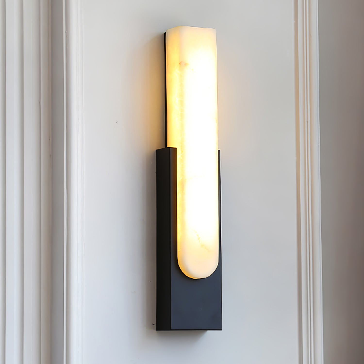This sublimely modern light marries the purity of the brass base and the warmth of alabaster, a rare stone that makes each Agatha sconce unique. When illuminated, its inherent natural translucence comes alive, revealing veins distinct to each light.