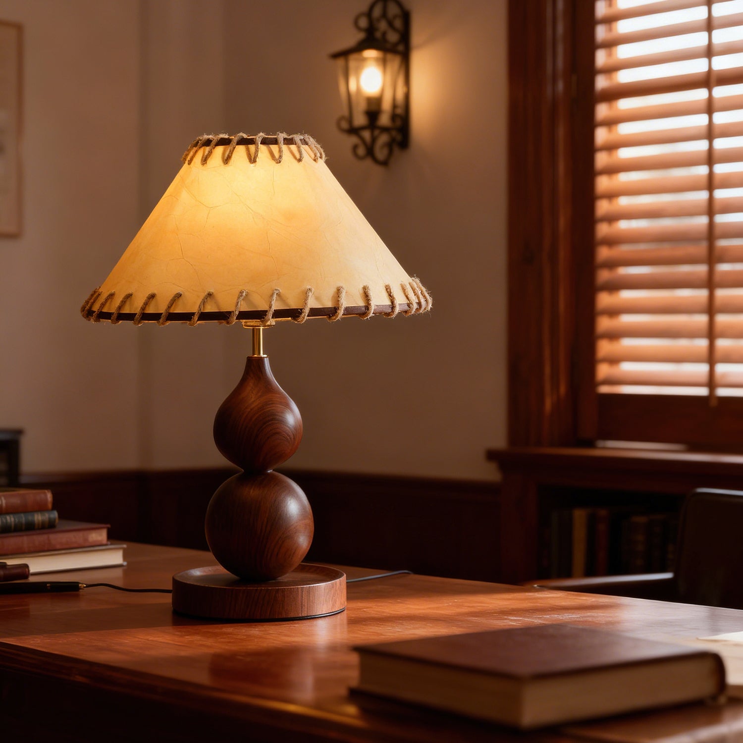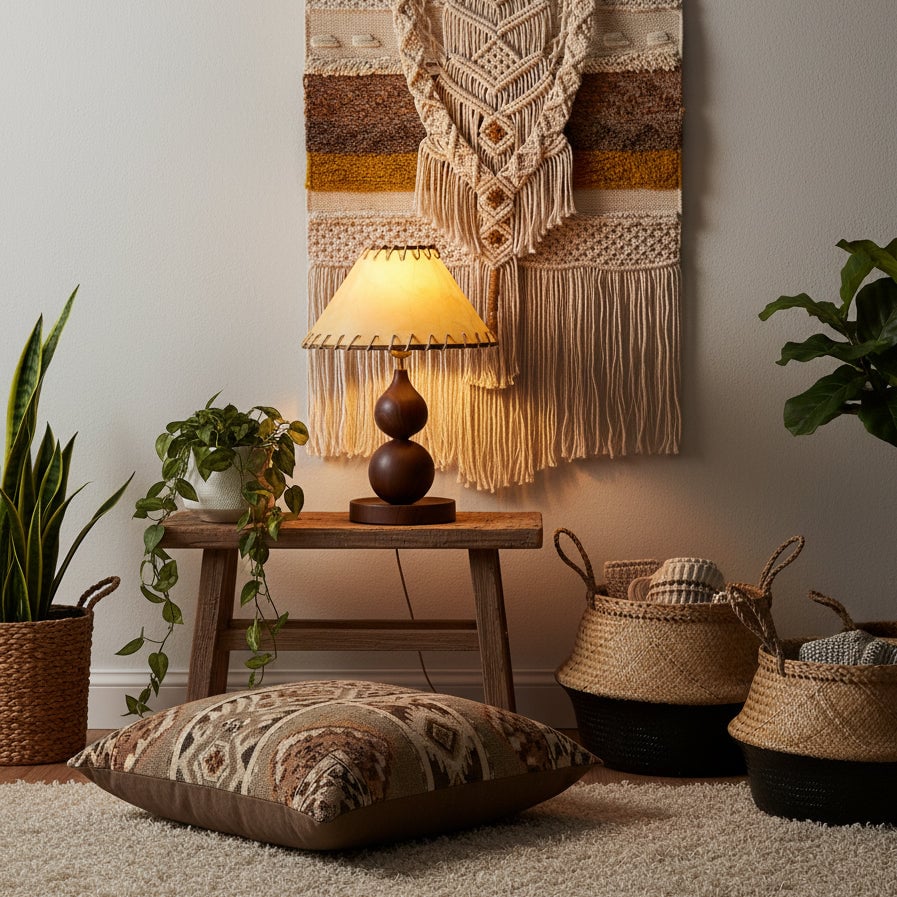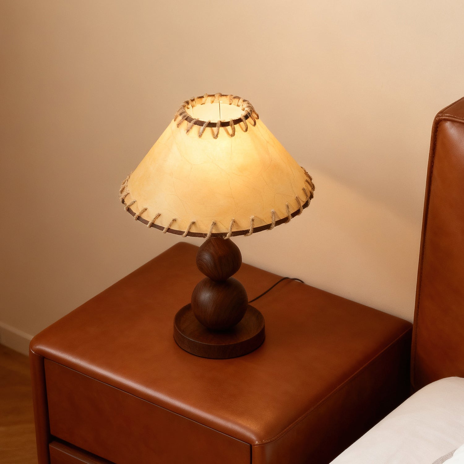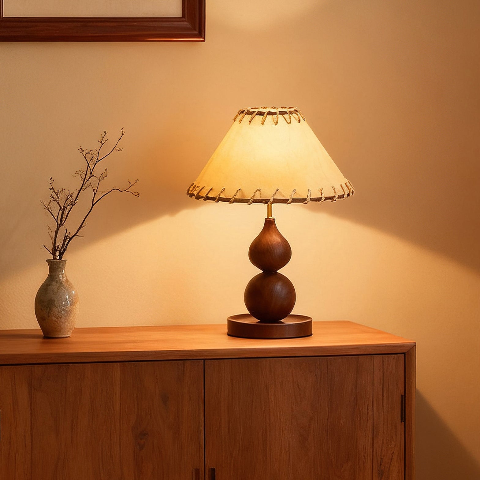 The Aikoz Table Lamp from Mooijane features a sculptural double-sphere wood-grain base paired with a classic tapered fabric shade. Its rounded wooden profile adds natural warmth, while the shade softly diffuses light, creating a calming, modern ambiance. Compact and versatile, it’s ideal for nightstands, side tables, desks, or entryway cabinets, providing both functional illumination and elegant style.