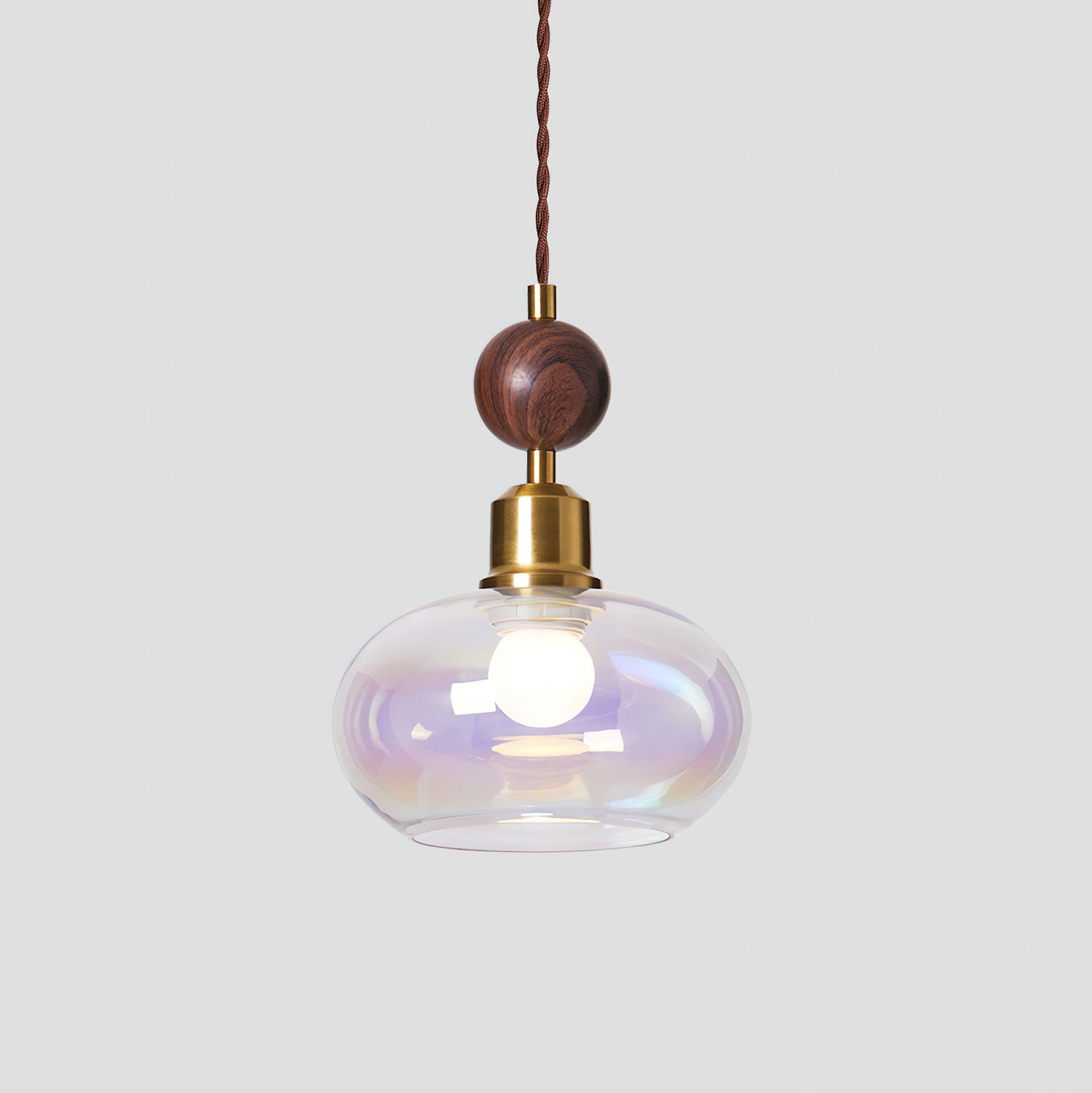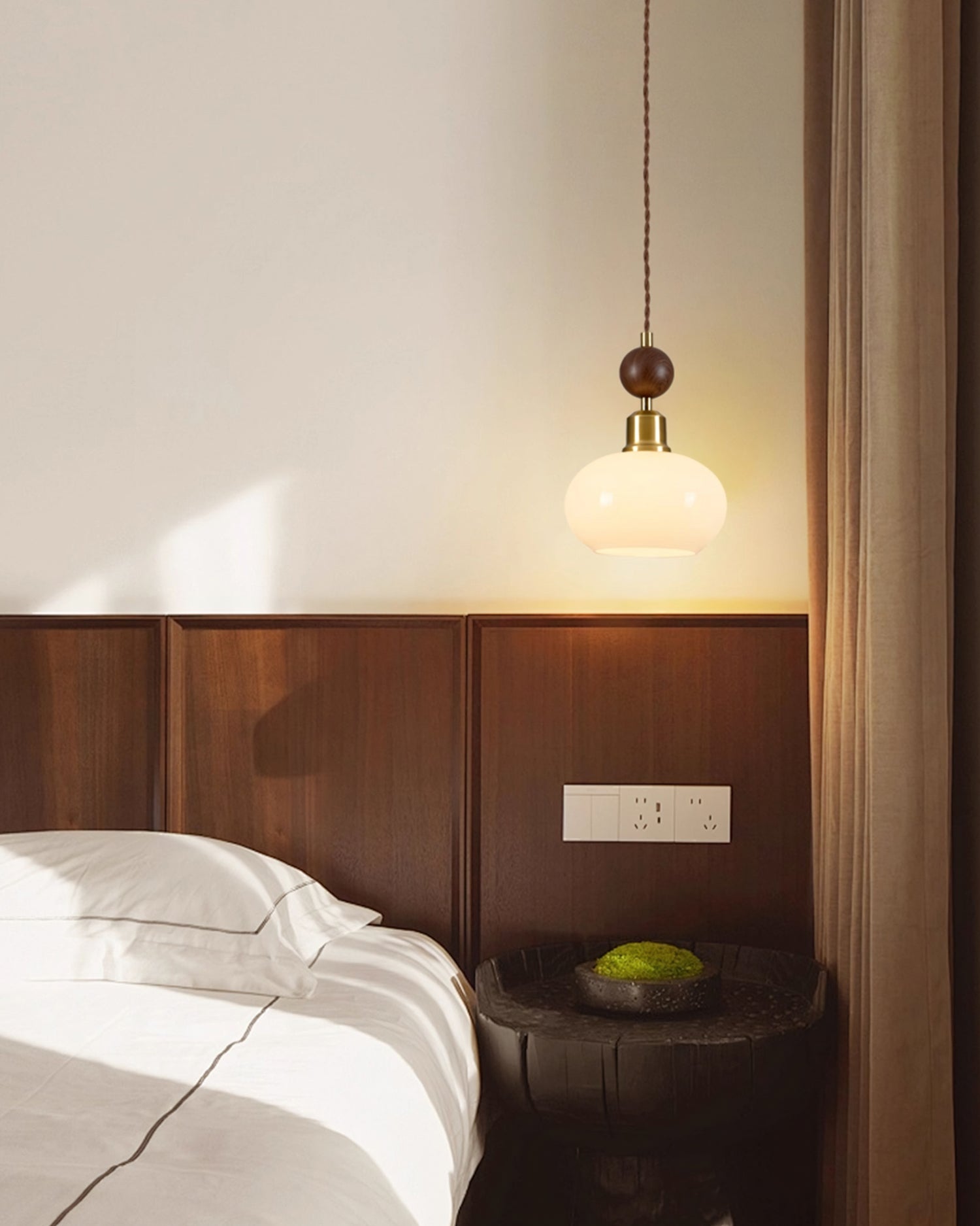 The Aitan Pendant Lamp by Mooijane combines a rounded glass shade with warm wood and sleek metal accents, blending modern simplicity with vintage charm. When illuminated, the glass emits a soft, even glow that creates a cozy, inviting ambiance. When unlit, its refined form and natural textures add style and depth to any space.