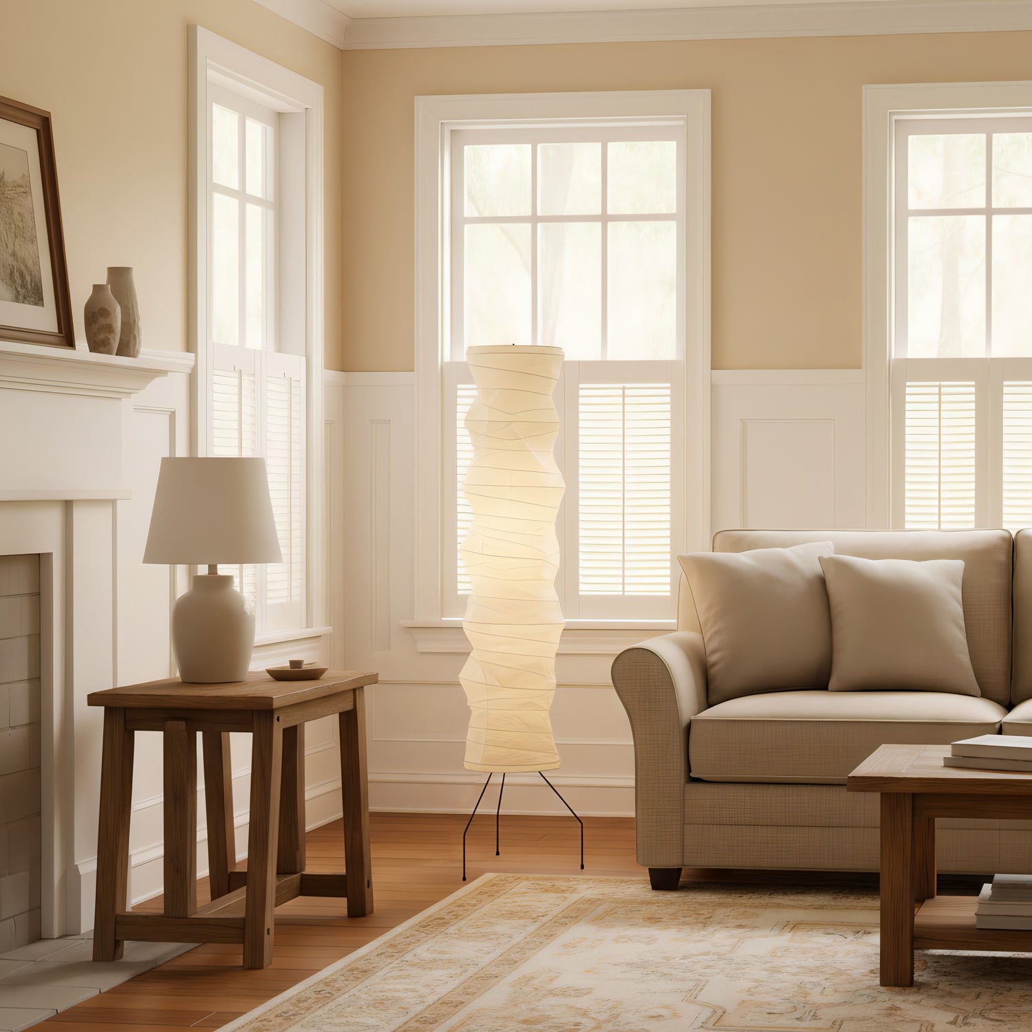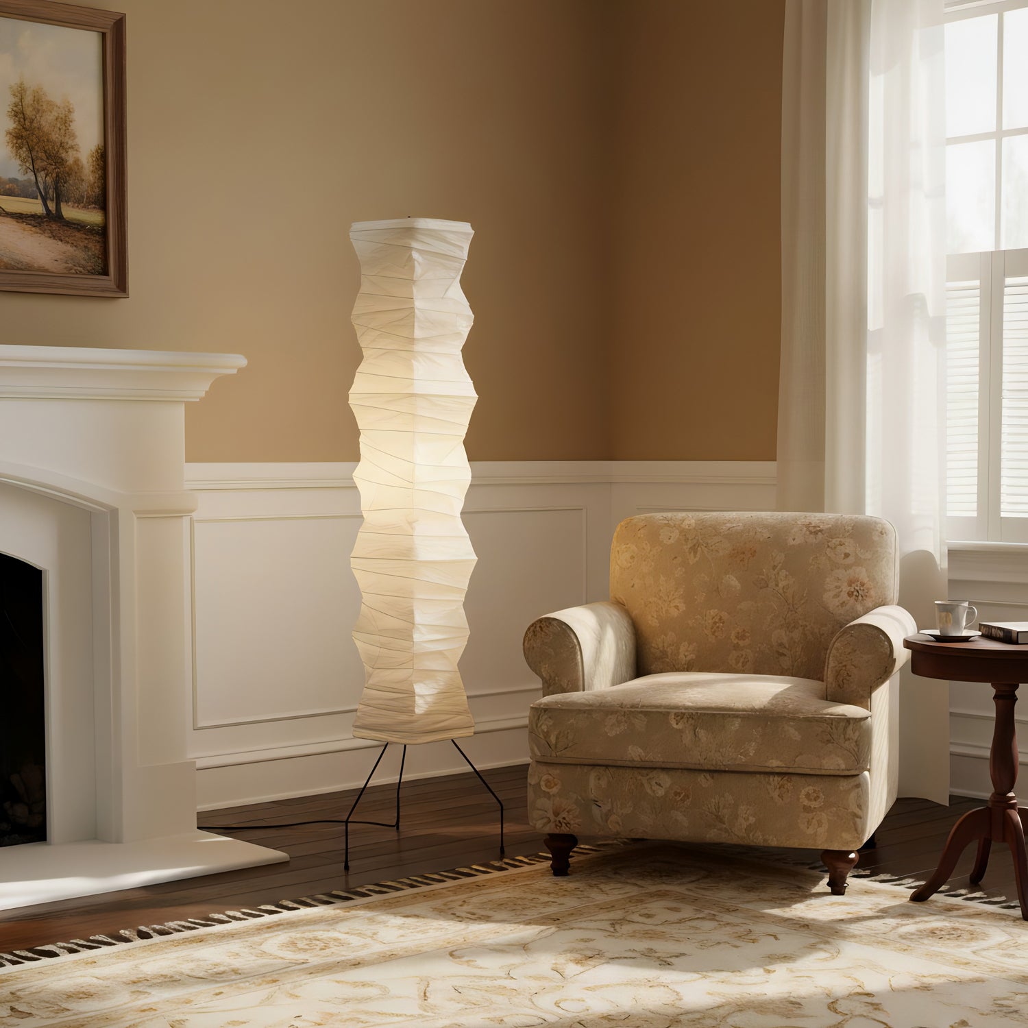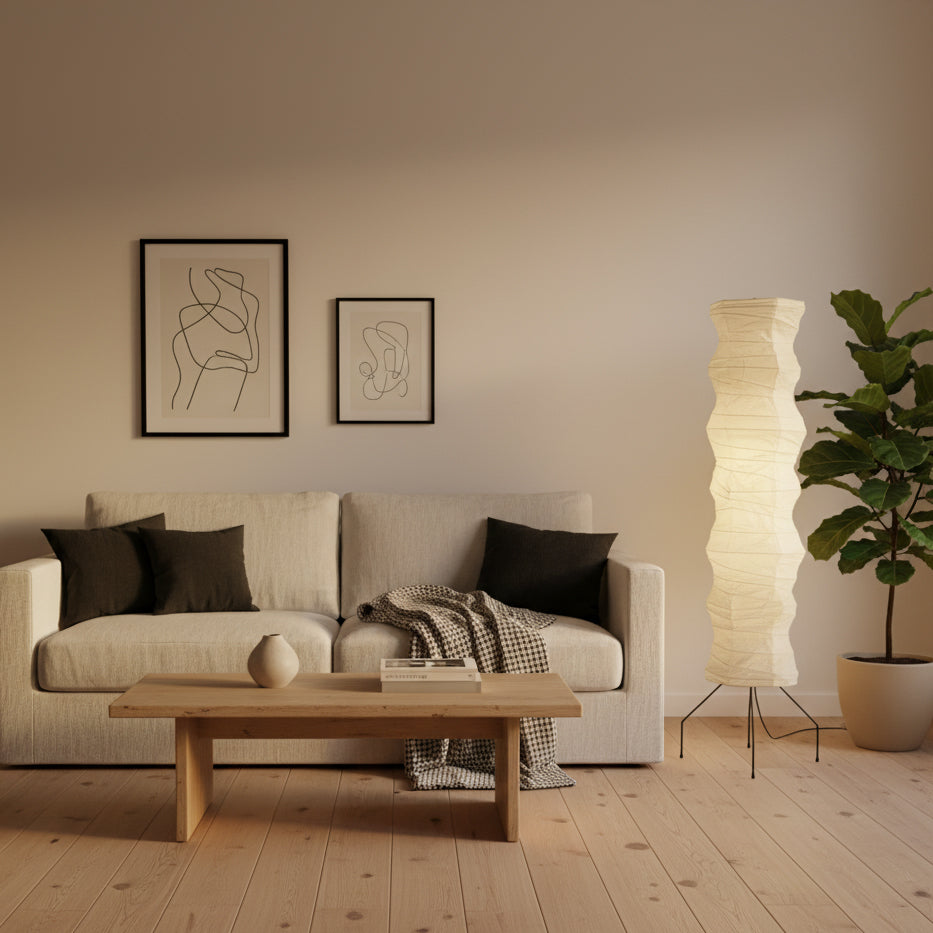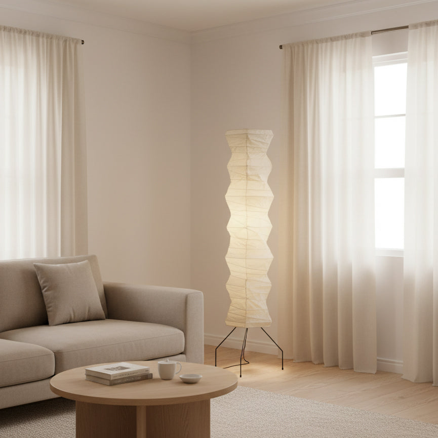 He took the design of these traditional lanterns for the occasion to create light sculptures made of wood and paper on his own. For the Akari Floor Lamp, the designer uses paper from the mulberry tree, because it softens the light, making it gentle and spreading it evenly.