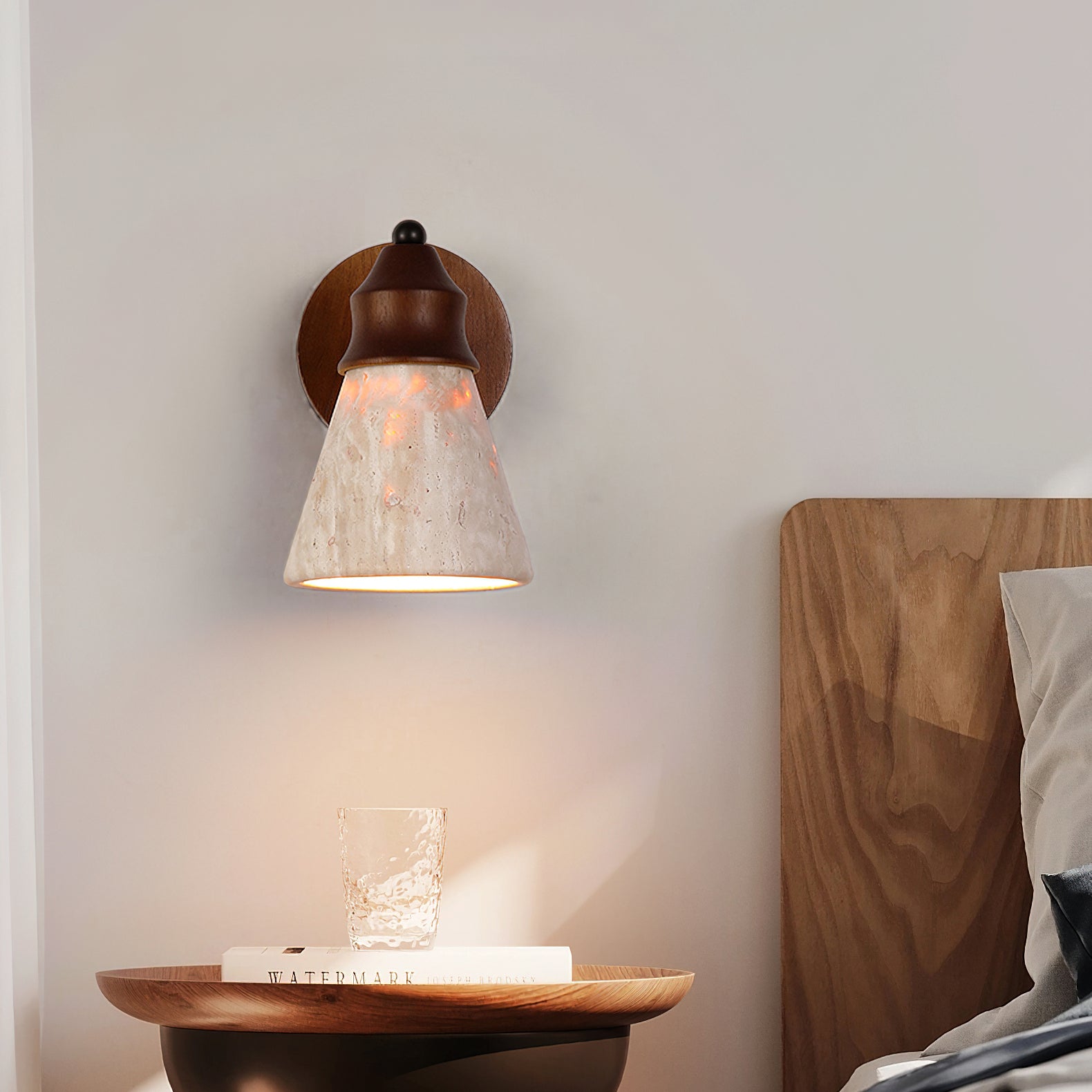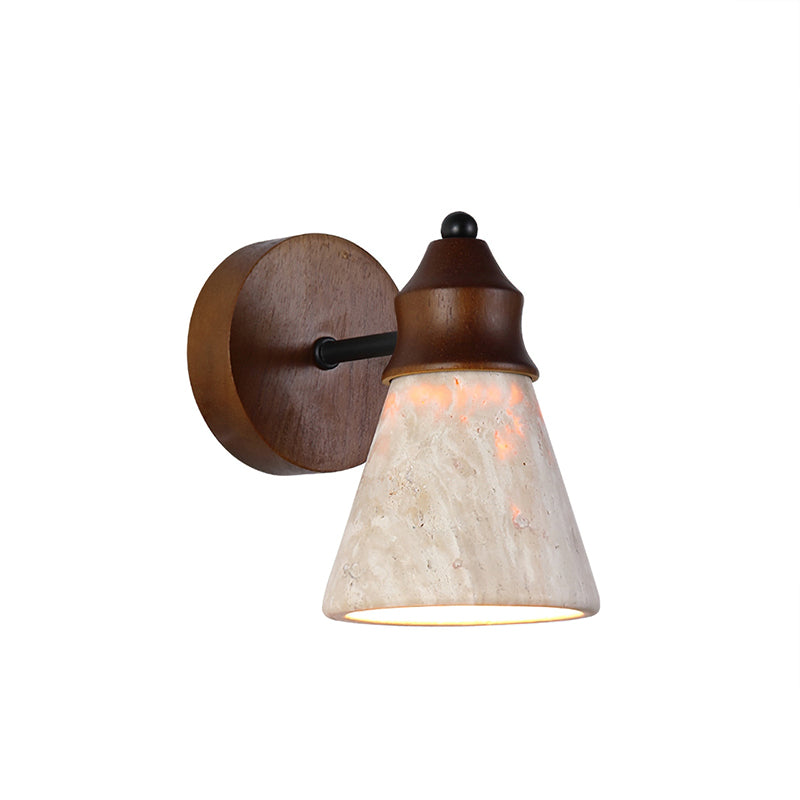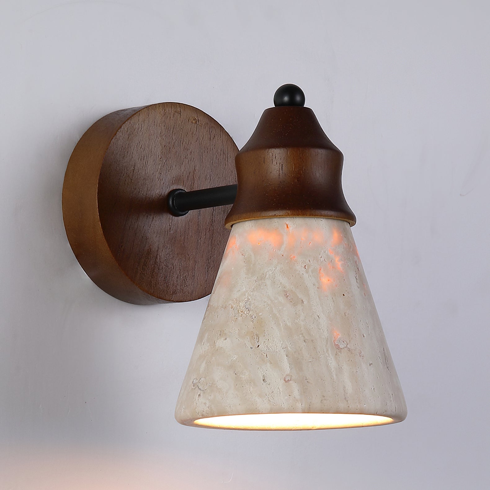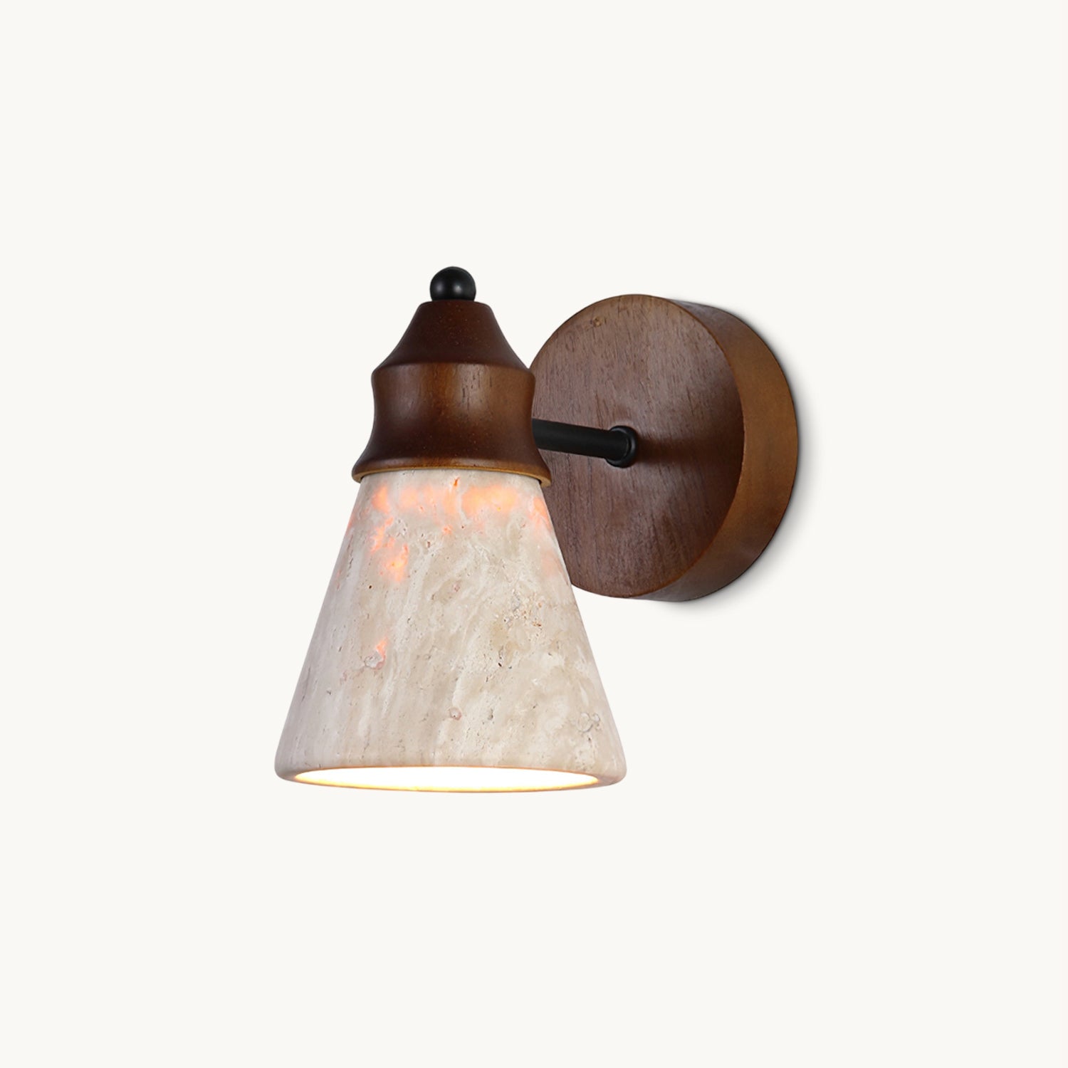 The Alagusmo Wall Lamp by Mooijane combines creamy travertine, solid wood, and matte black metal in a balanced, sculptural form. Its conical stone shade showcases natural veining and diffuses a soft, ambient glow. A warm wood accent adds organic character, while the slim metal arm brings modern contrast. Perfect for bedrooms, hallways, or reading nooks, Alagusmo offers an elegant blend of nature and contemporary design.