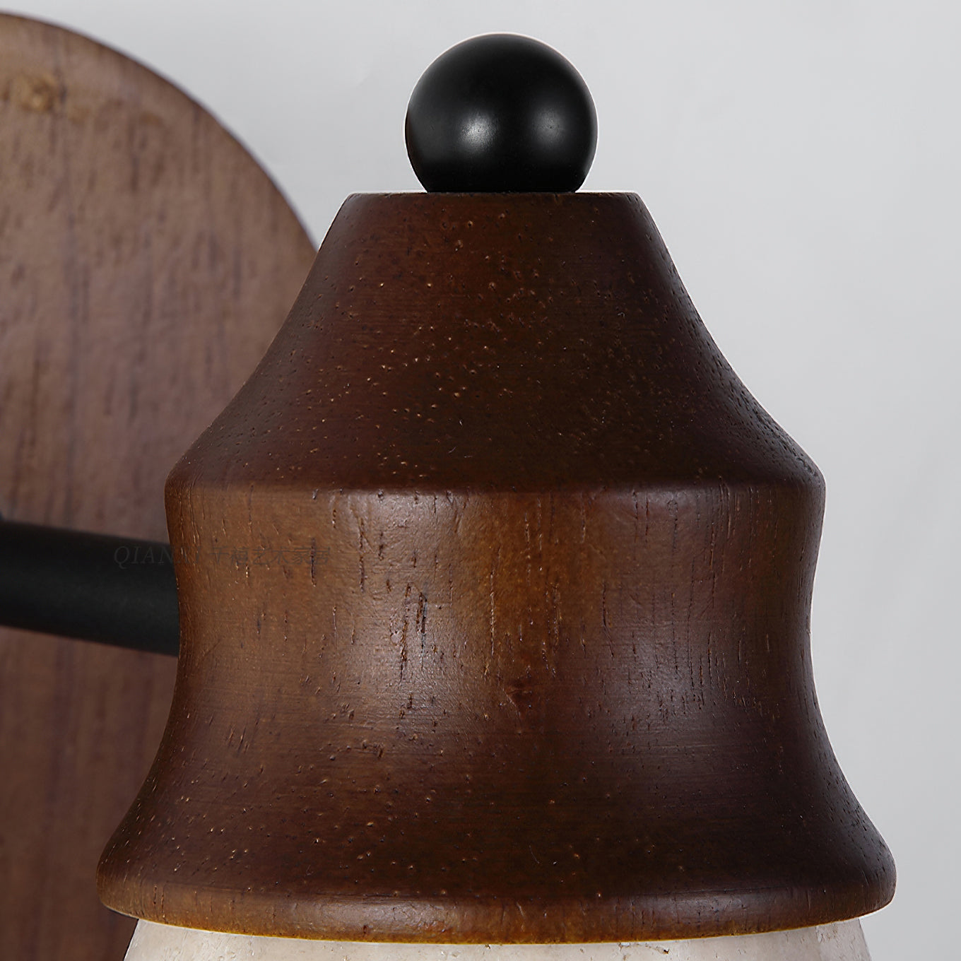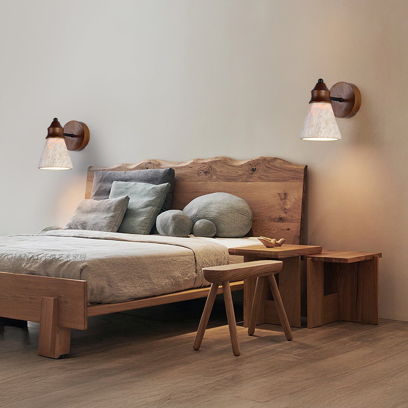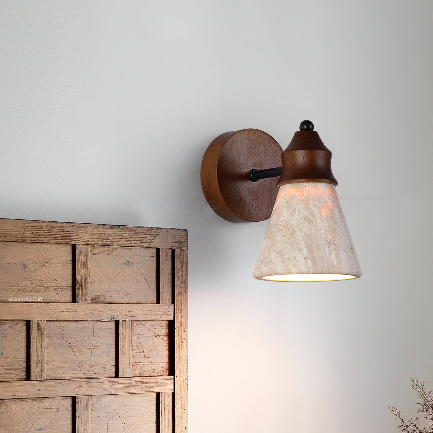 The Alagusmo Wall Lamp by Mooijane combines creamy travertine, solid wood, and matte black metal in a balanced, sculptural form. Its conical stone shade showcases natural veining and diffuses a soft, ambient glow. A warm wood accent adds organic character, while the slim metal arm brings modern contrast. Perfect for bedrooms, hallways, or reading nooks, Alagusmo offers an elegant blend of nature and contemporary design.