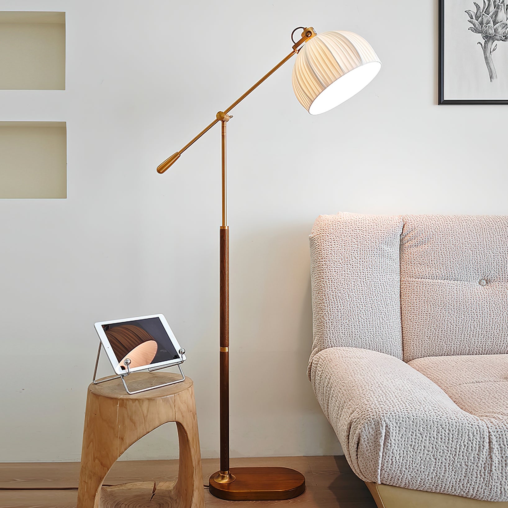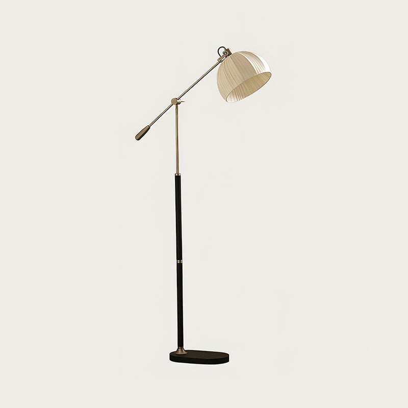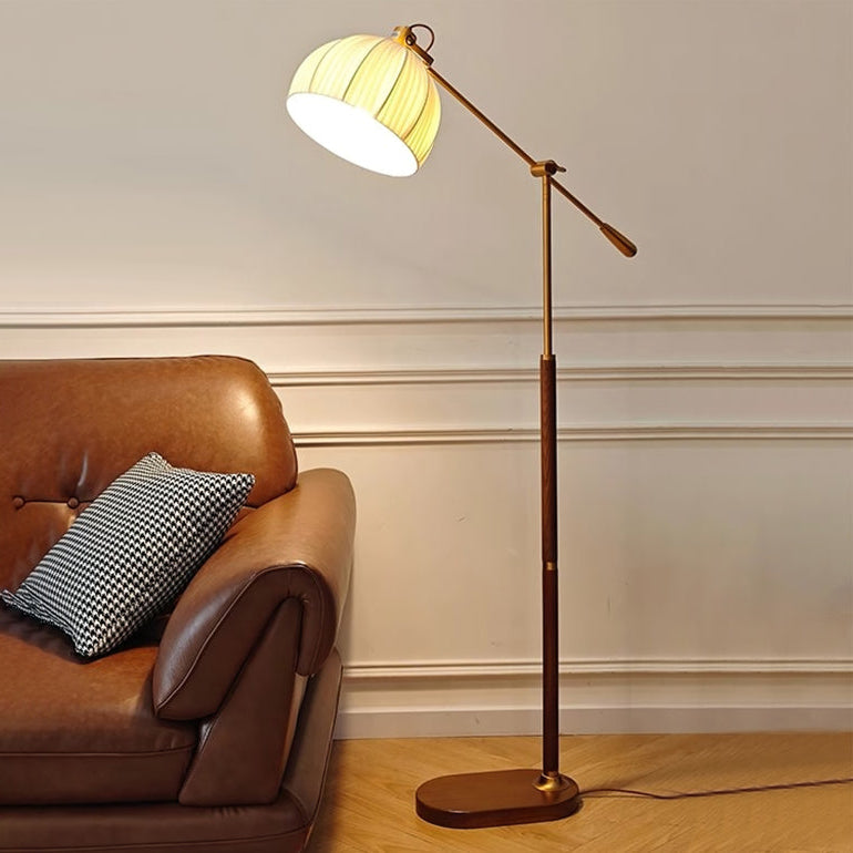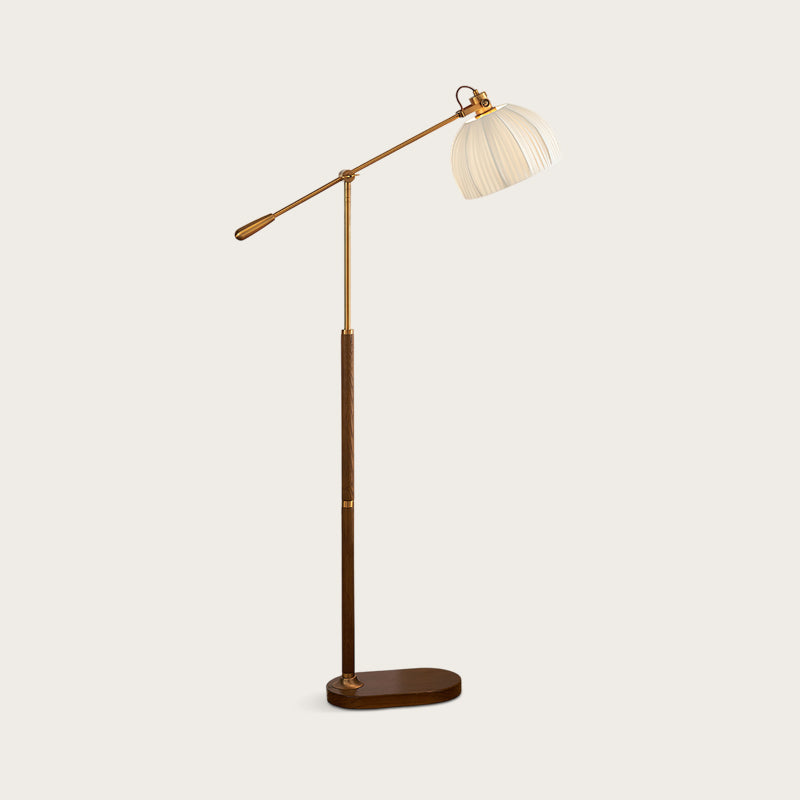 Introducing the Alaric Floor Lamp from Mooijane. Featuring a sleek, adjustable arm and metallic finish with wooden accents, this lamp adds an industrial touch to any space. The dome-shaped shade in pleated fabric gently diffuses light for a cozy ambiance, perfect for reading or lounging in style.