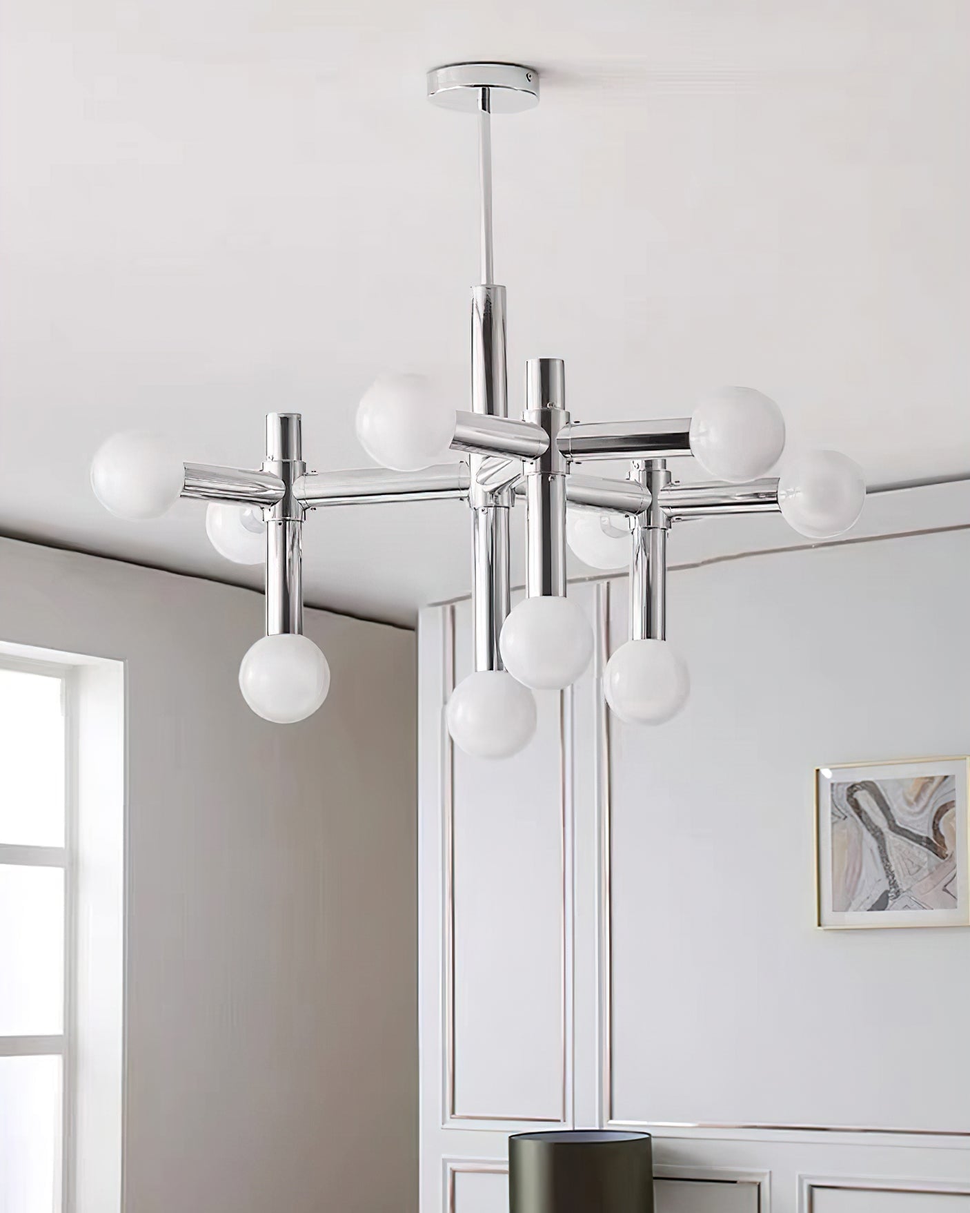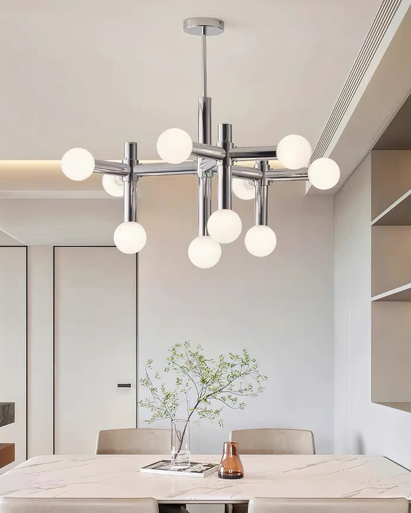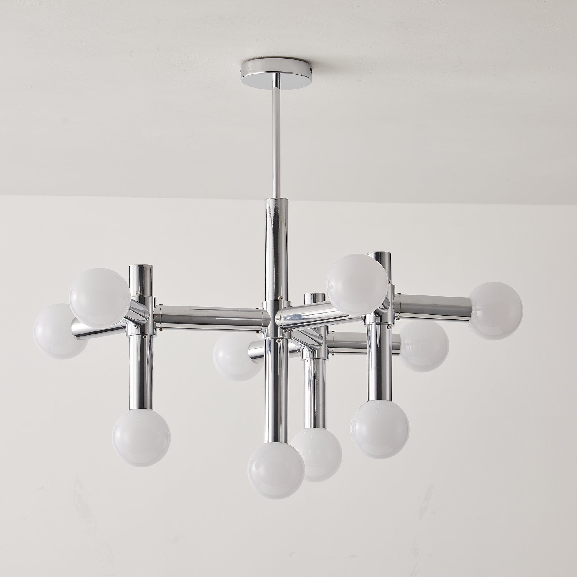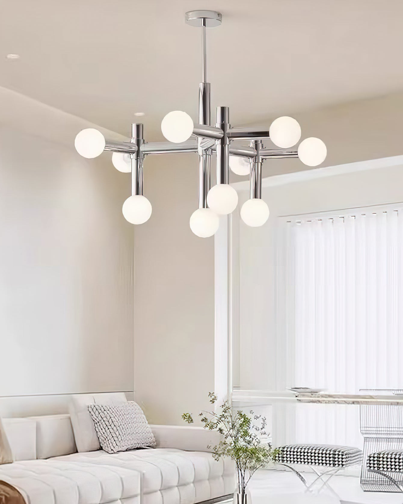 Elevate your home with the Alcobendas Network Chandelier. Its flexible design, chrome finish, and 10 lights create a minimalist yet glamorous look. The cozy glow adds an inviting feel, while the modern and eye-catching style complements your decor. Indulge in luxury and style with this exclusive statement piece.
