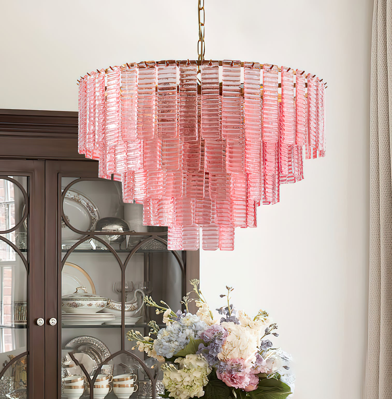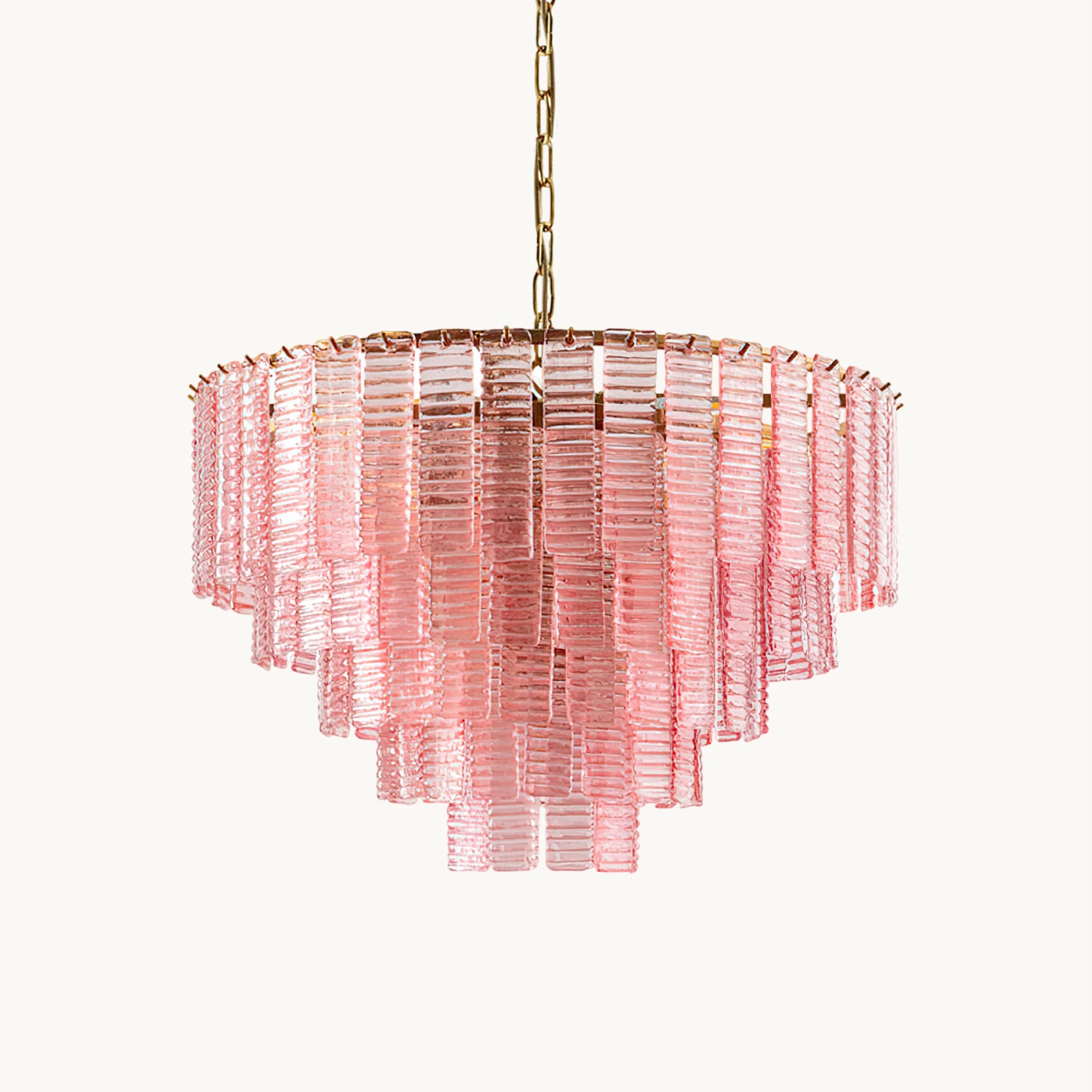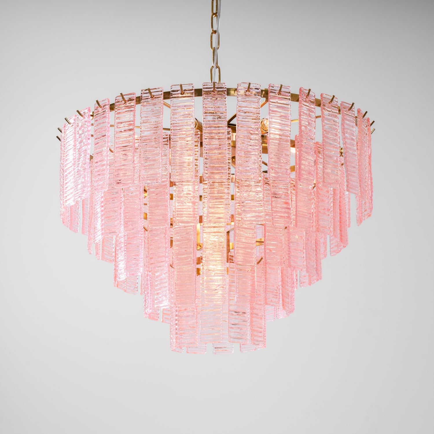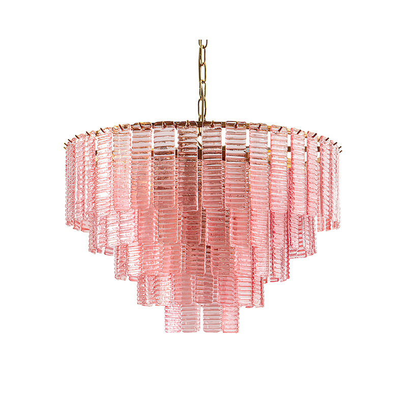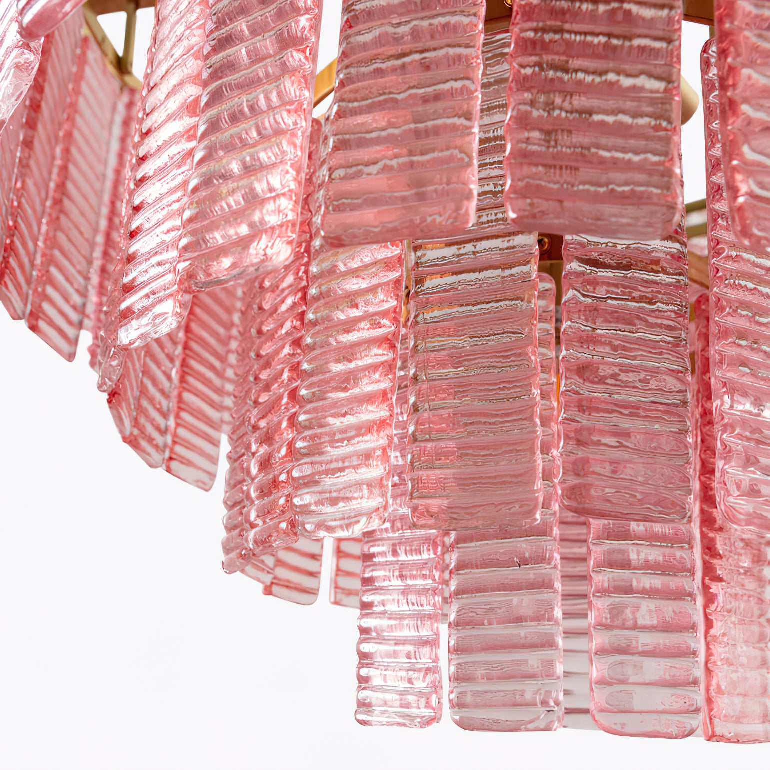 Indulge in luxury and artistry with the Amaro Murano Chandelier, exclusively from Mooijane. With its tiered formation of pink glass panels and metal accents, this vintage-inspired chandelier captivates with an enchanting play of light and shadow. Elevate your space with its timeless glamour and sophistication.