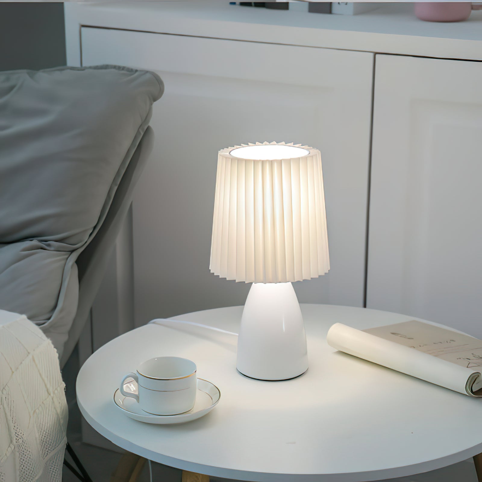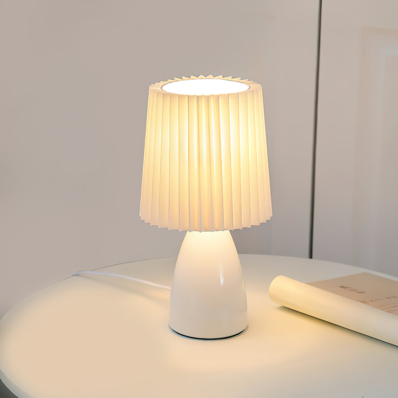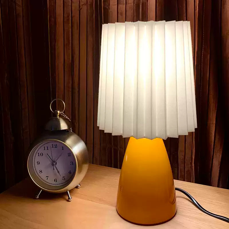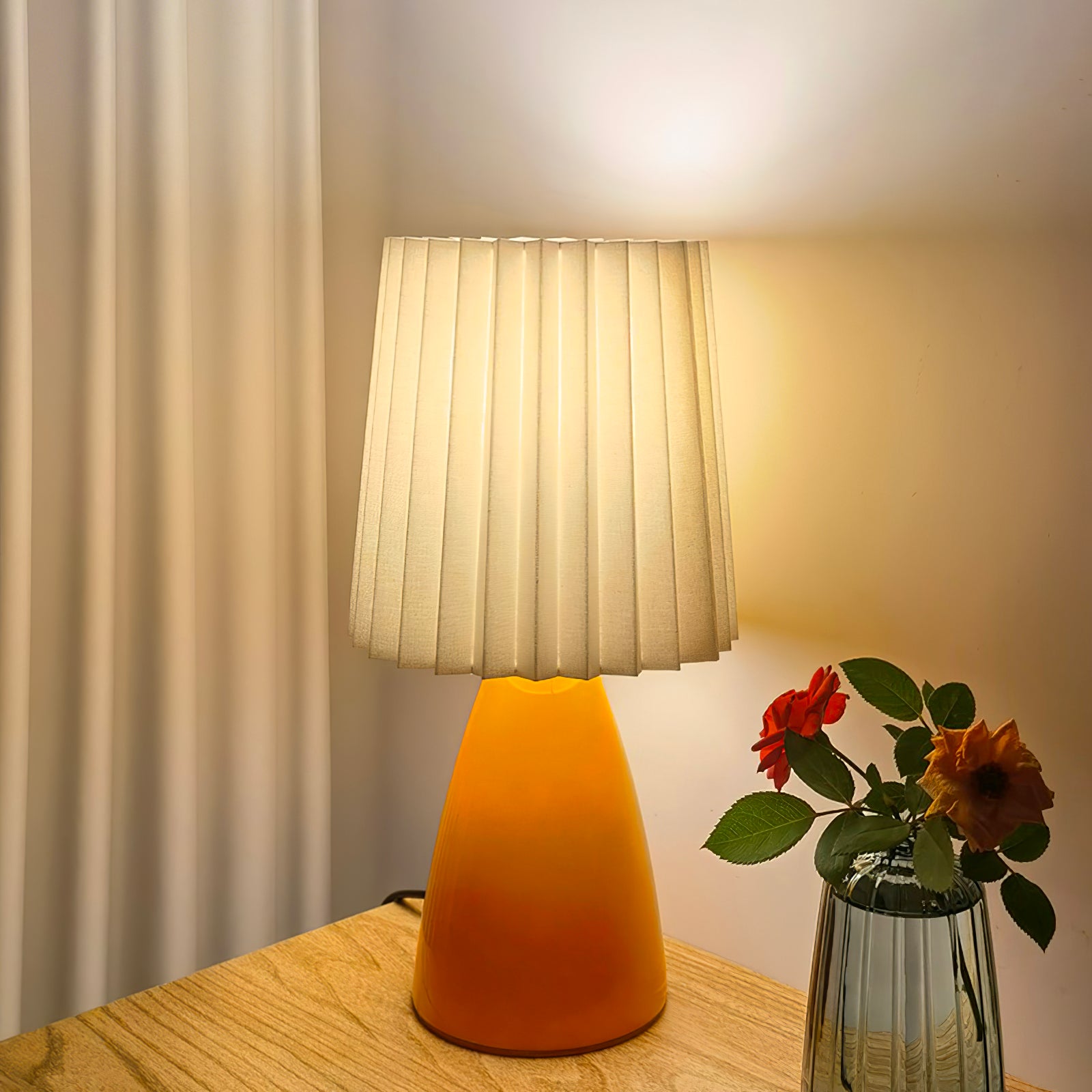 The Amber Glow Pleated Shade Table Lamp brings warmth and elegance to any room with its charming design and inviting colors. The lamp features a glossy amber-colored base with a smooth, rounded shape that adds a vibrant yet soothing pop of color to your decor. Topping the base is a pleated shade in a soft, neutral tone, which diffuses light beautifully, casting a warm and gentle glow around the space.