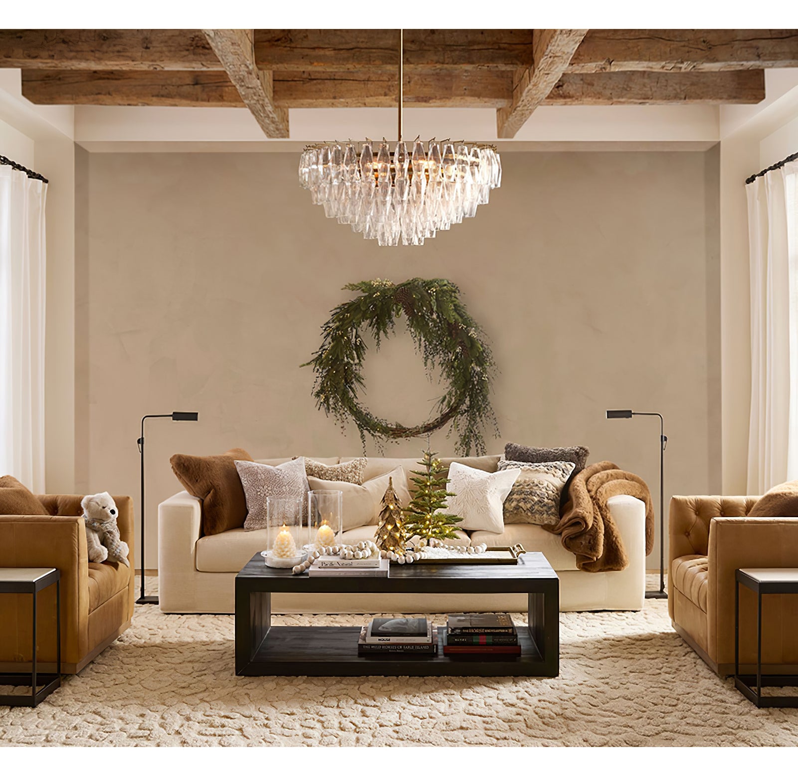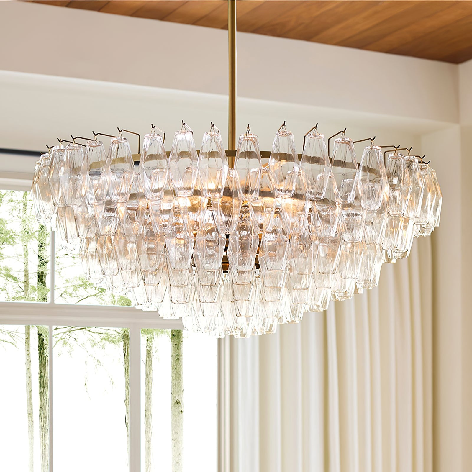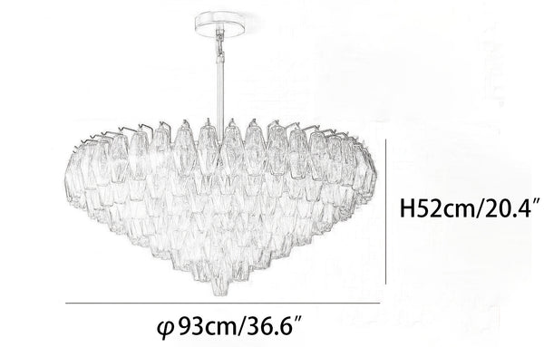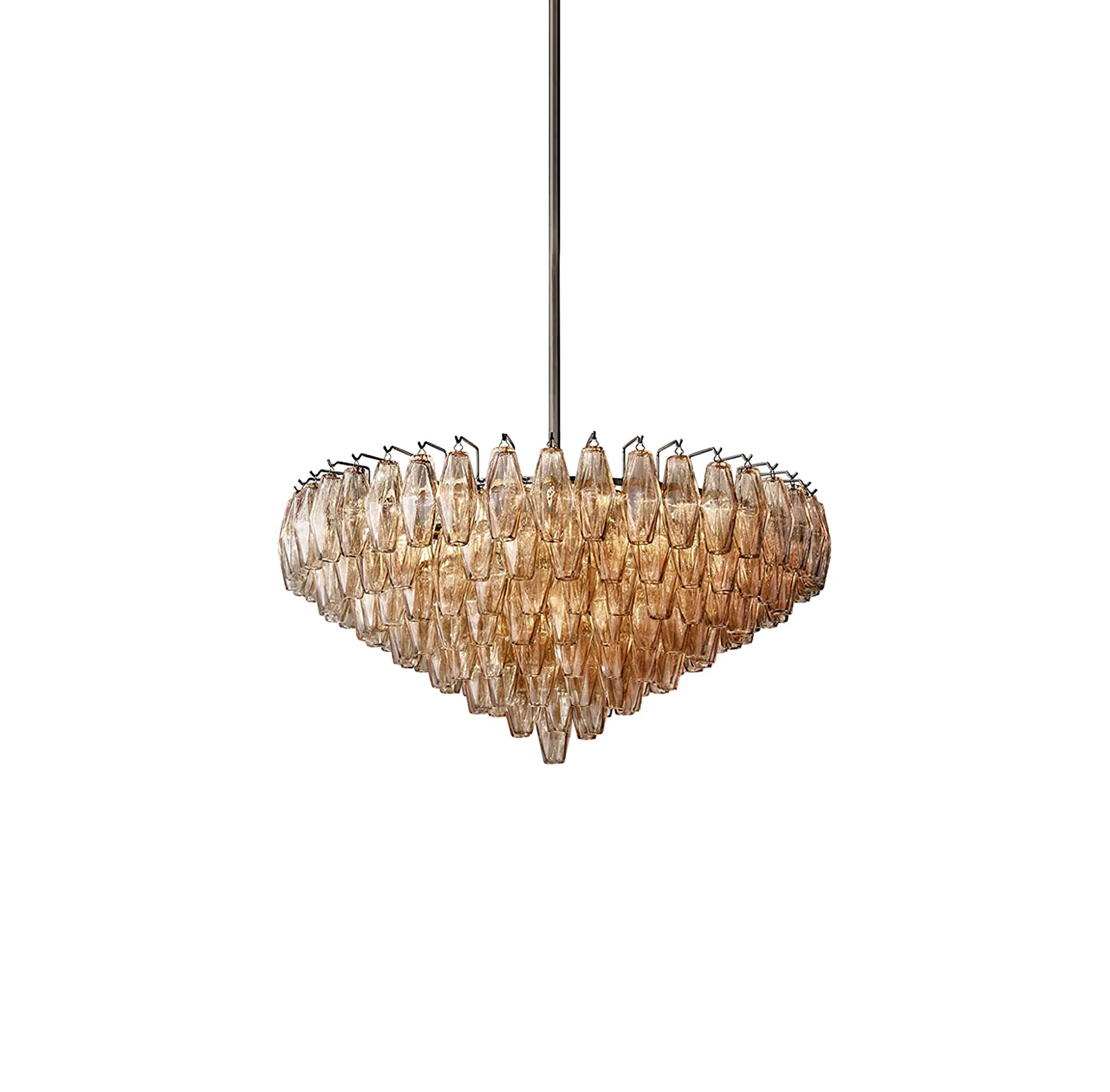 The Amber Murano Glass Round Chandelier captures timeless elegance with its striking design. Crafted with dozens of hand-blown glass polyhedra, each delicately suspended from a tiered steel frame, this chandelier creates a dazzling interplay of light and shadow. The faceted amber glass elements reflect and refract light beautifully, transforming any space into a warm and inviting setting.