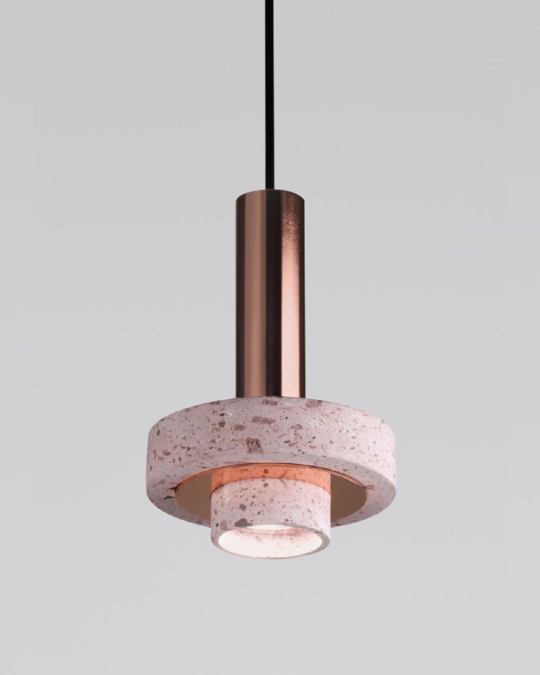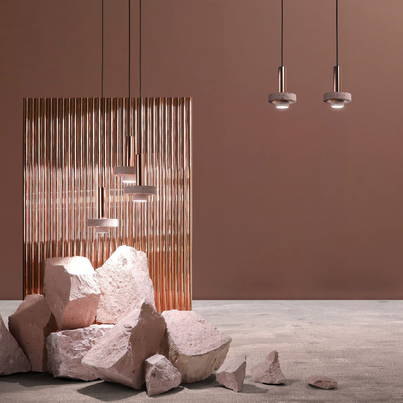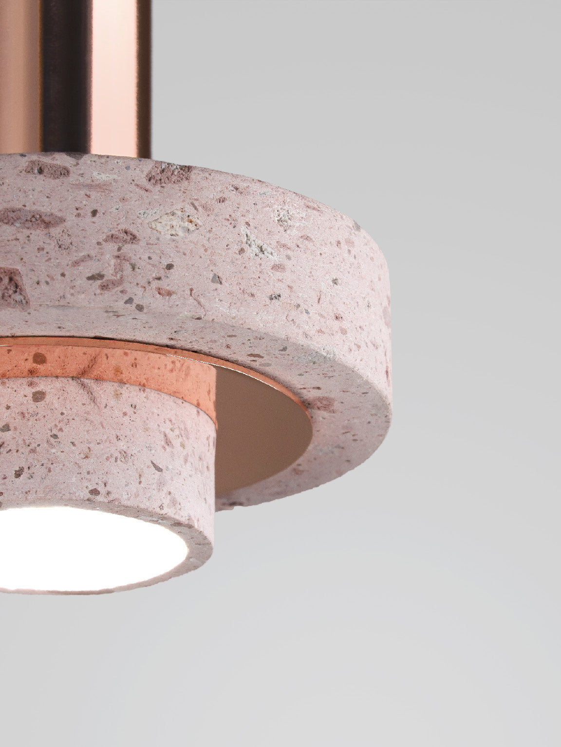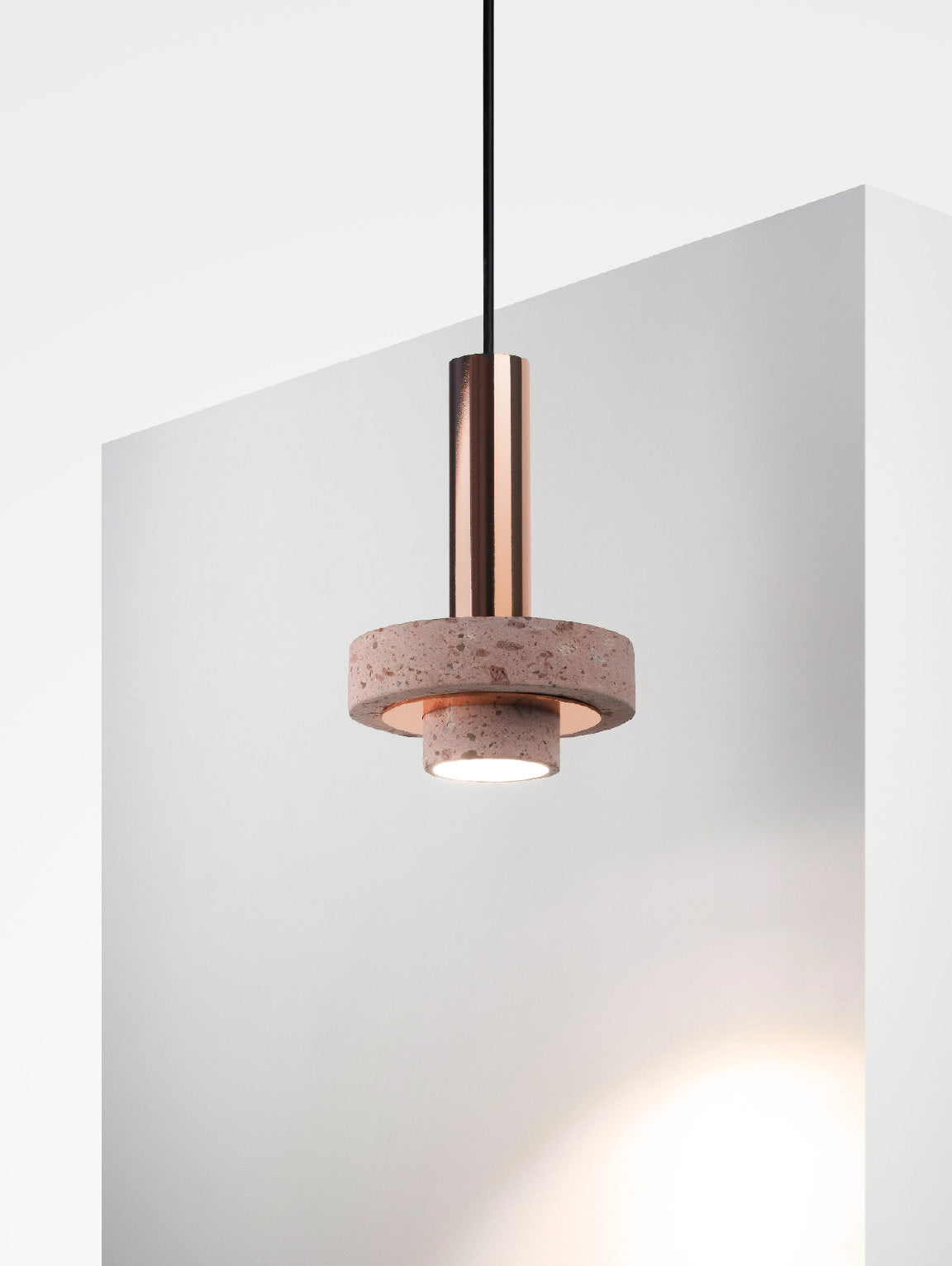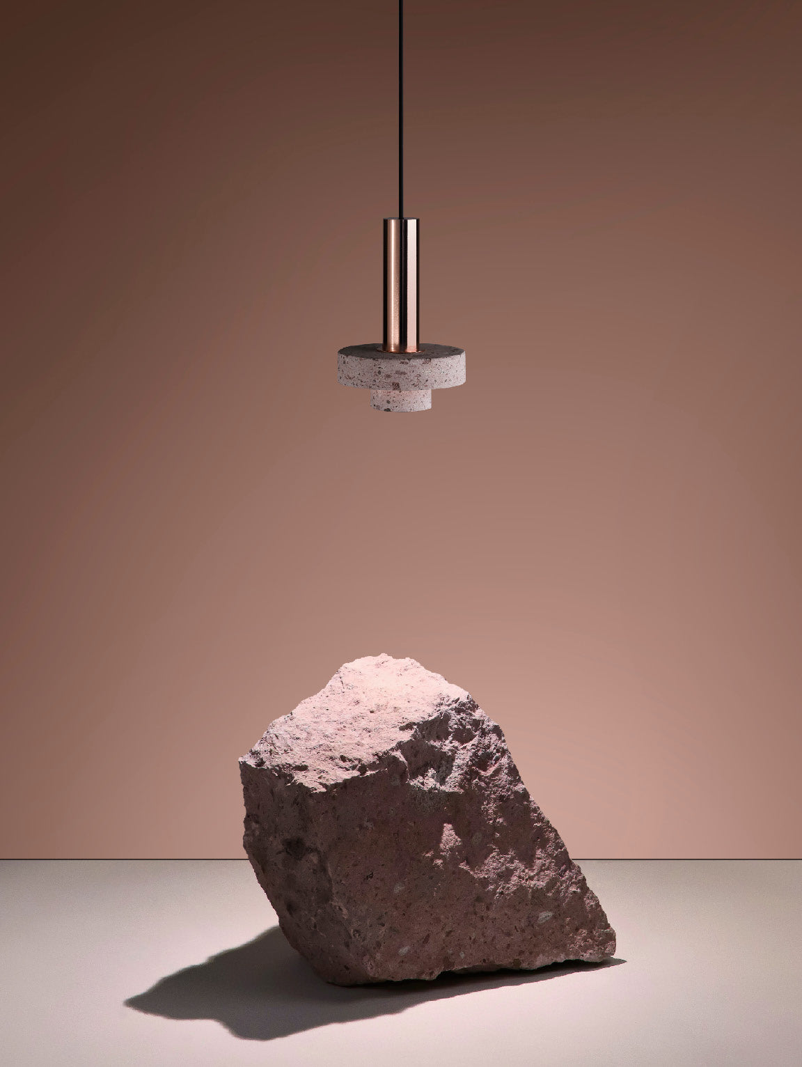 Ambra pendant´s timeless geometrical form speaks to us about architecture. Characterful and with strong lines, it is simply shaped and elegant. The proportions play with gravity, overlapping both materials. It becomes the center of attention with its warm and vibrant light. The unquestionable rich aesthetic of brushed copper and the stunning volcanic rock texture becomes a sculpture of light.