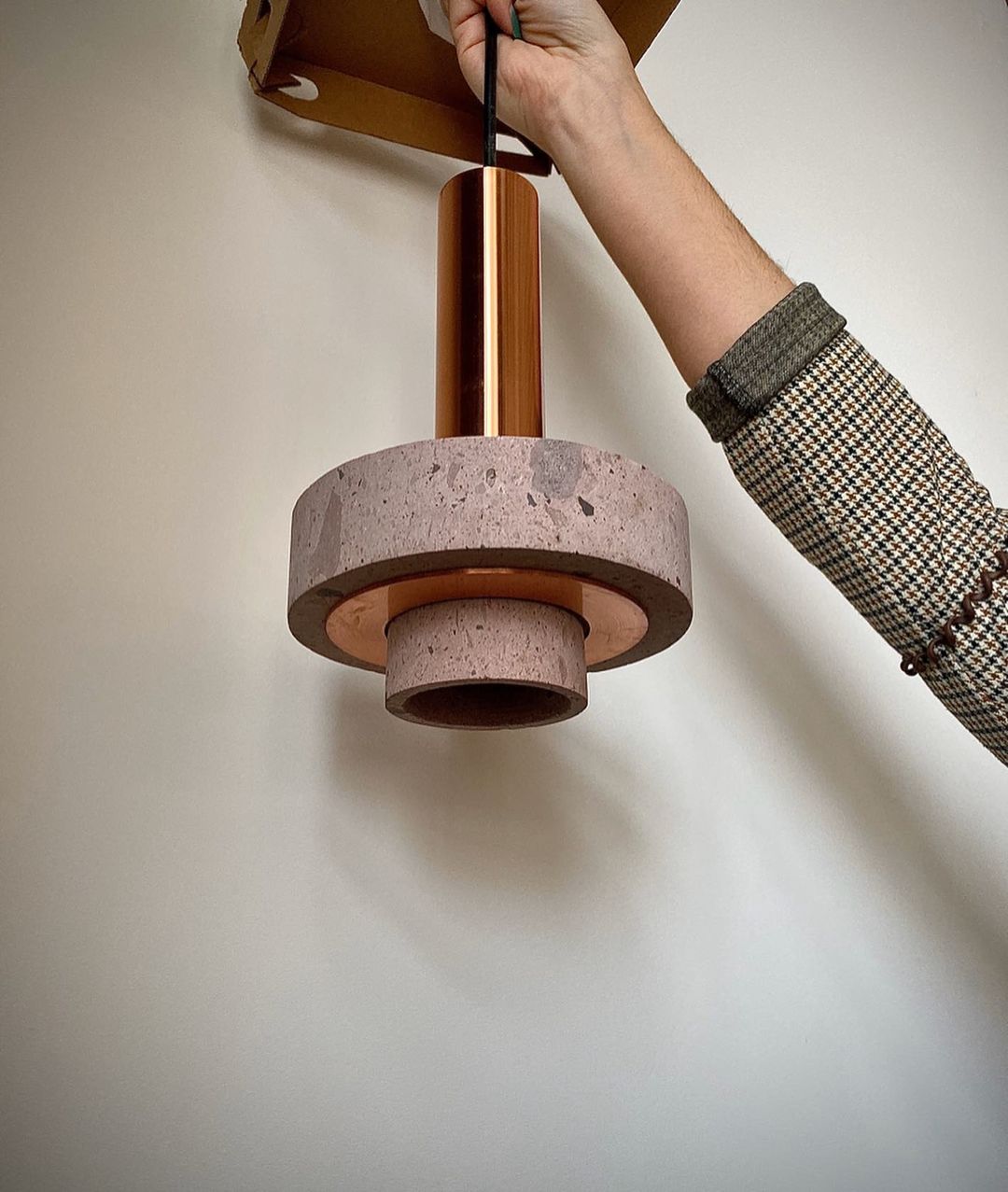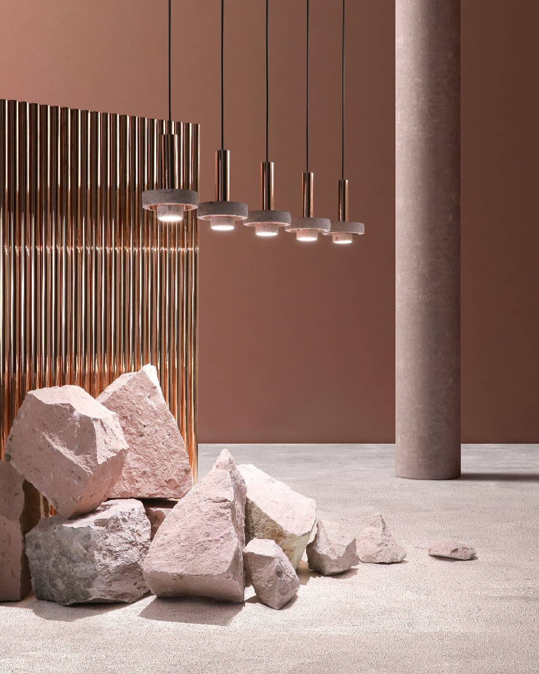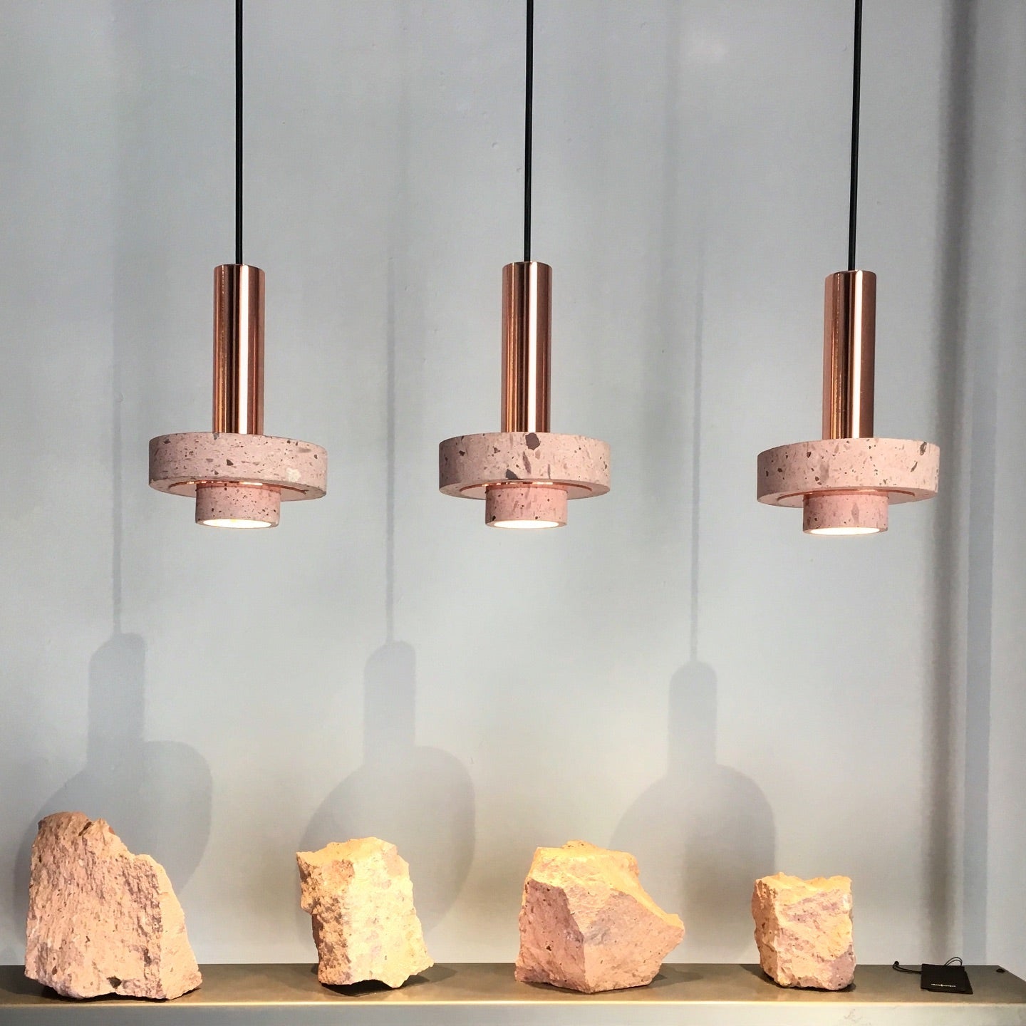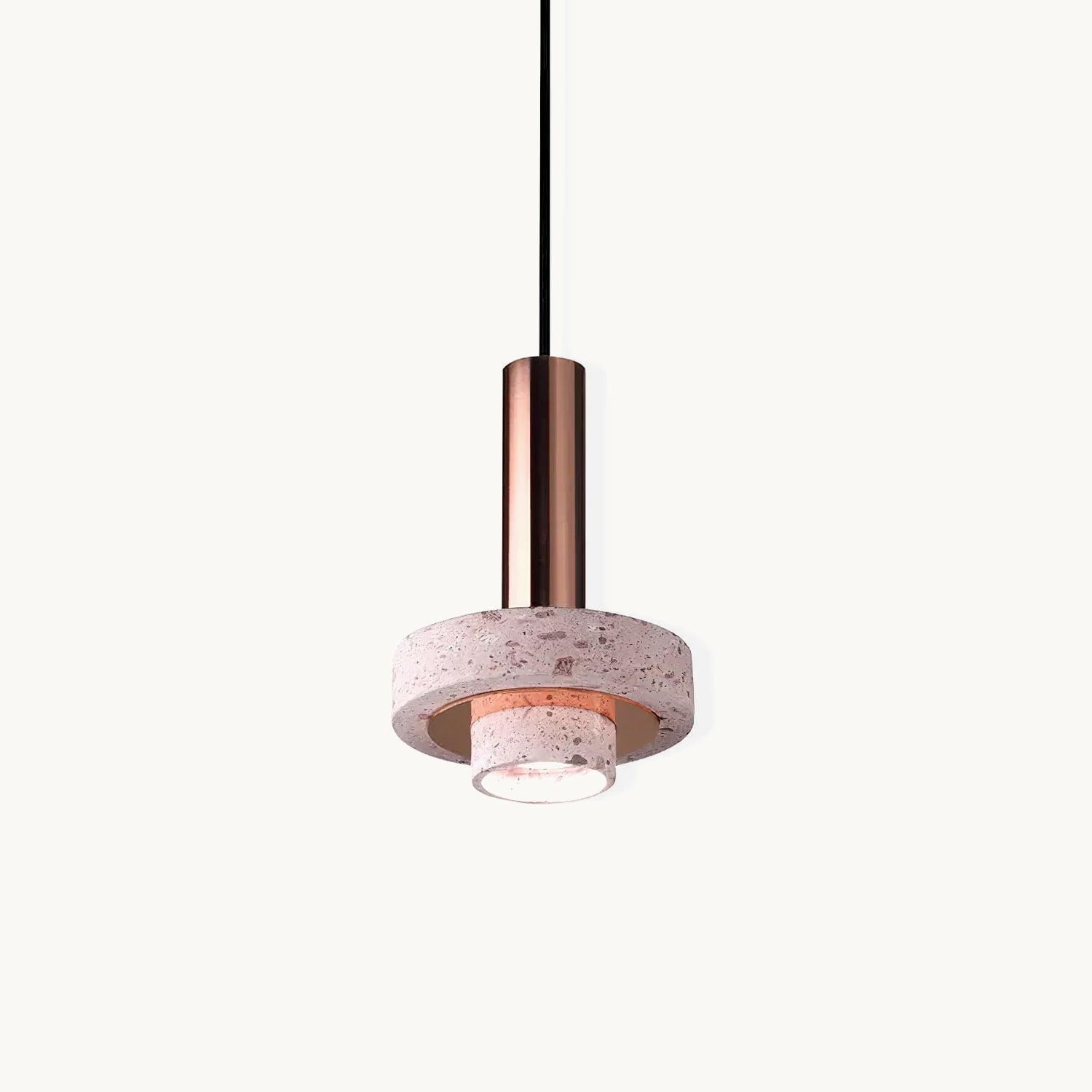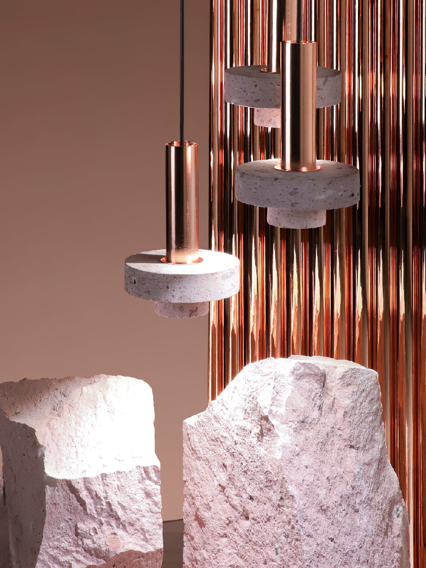 Ambra pendant´s timeless geometrical form speaks to us about architecture. Characterful and with strong lines, it is simply shaped and elegant. The proportions play with gravity, overlapping both materials. It becomes the center of attention with its warm and vibrant light. The unquestionable rich aesthetic of brushed copper and the stunning volcanic rock texture becomes a sculpture of light.