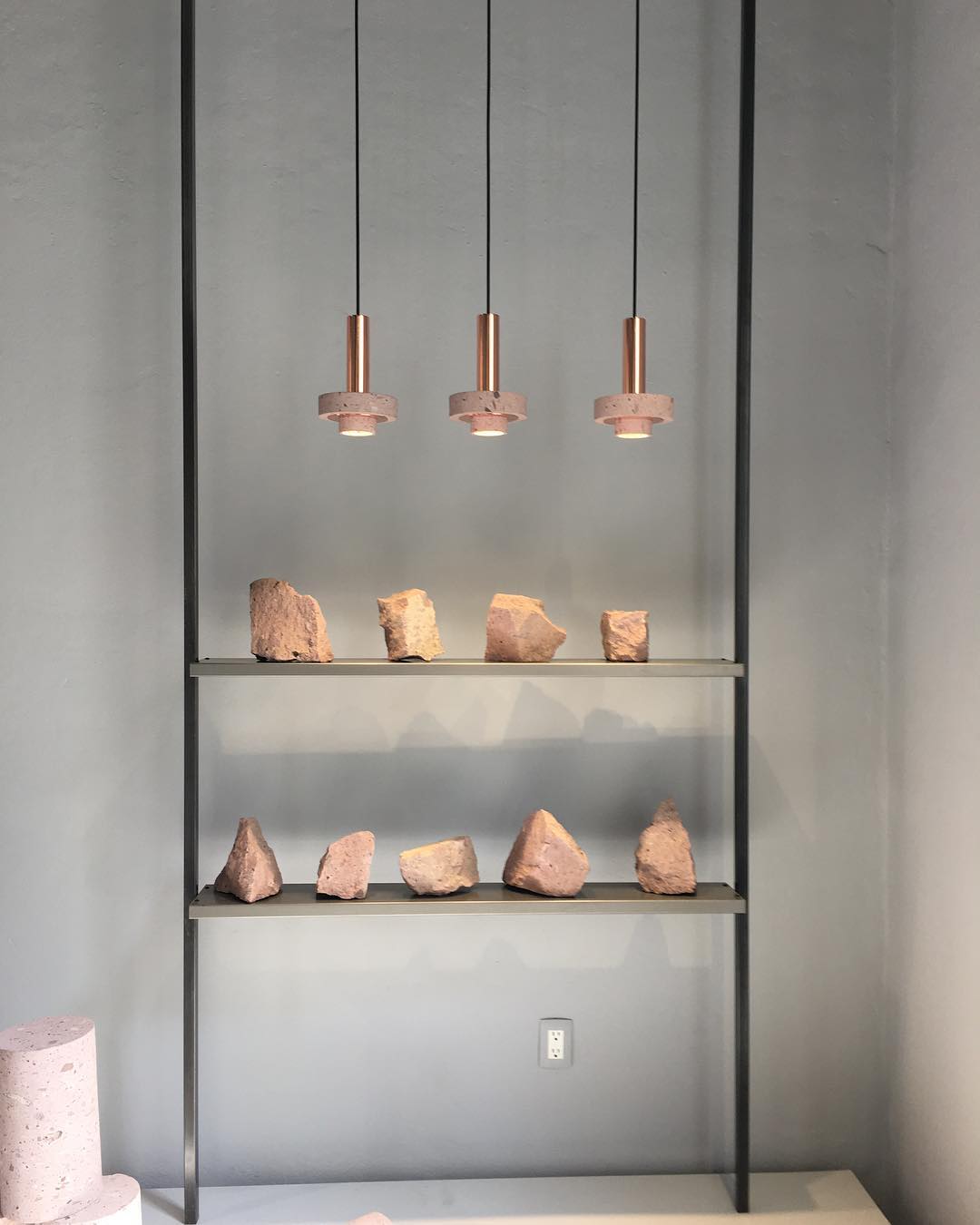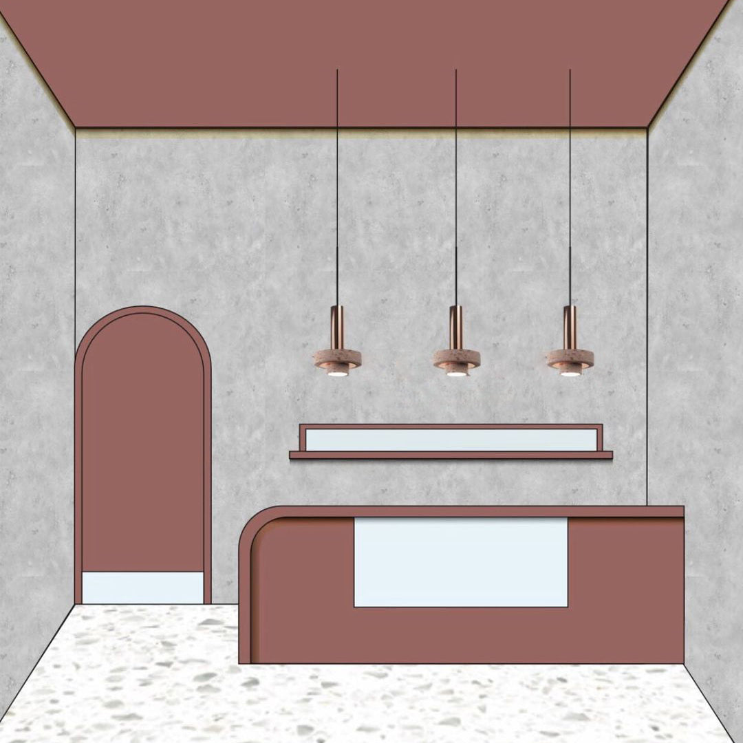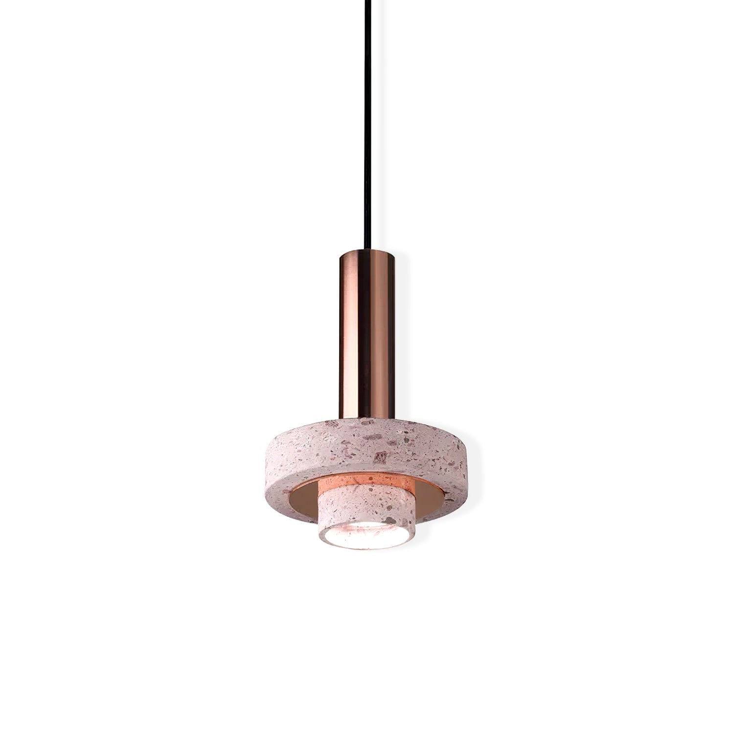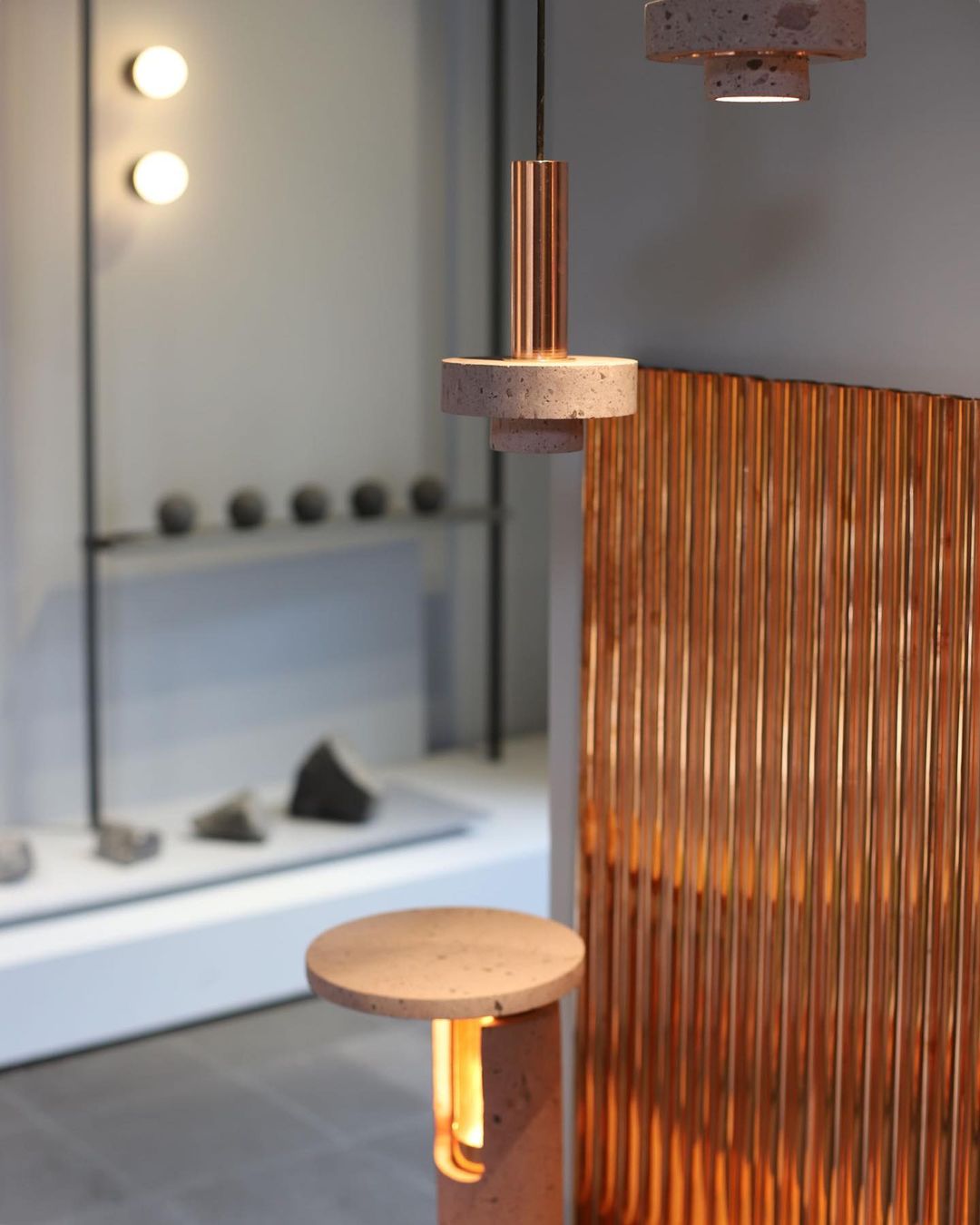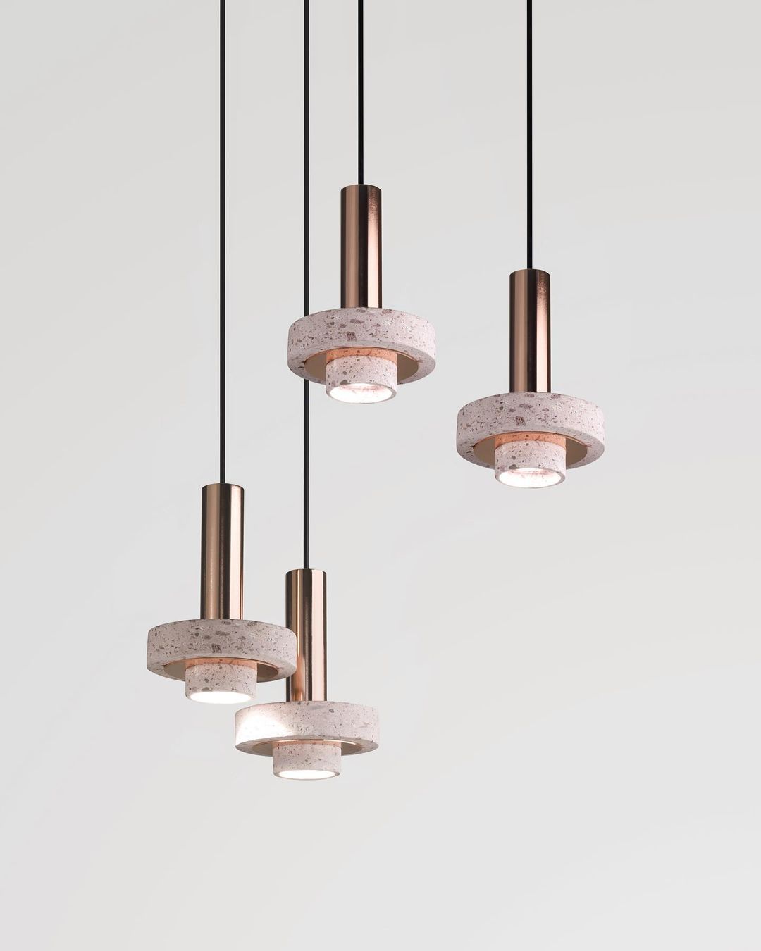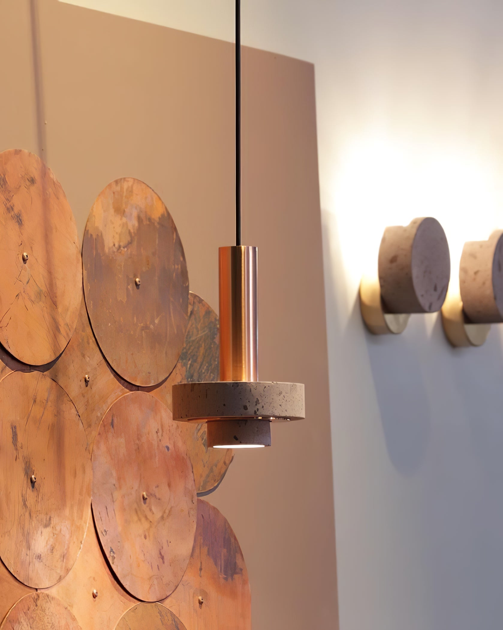 Ambra pendant´s timeless geometrical form speaks to us about architecture. Characterful and with strong lines, it is simply shaped and elegant. The proportions play with gravity, overlapping both materials. It becomes the center of attention with its warm and vibrant light. The unquestionable rich aesthetic of brushed copper and the stunning volcanic rock texture becomes a sculpture of light.
