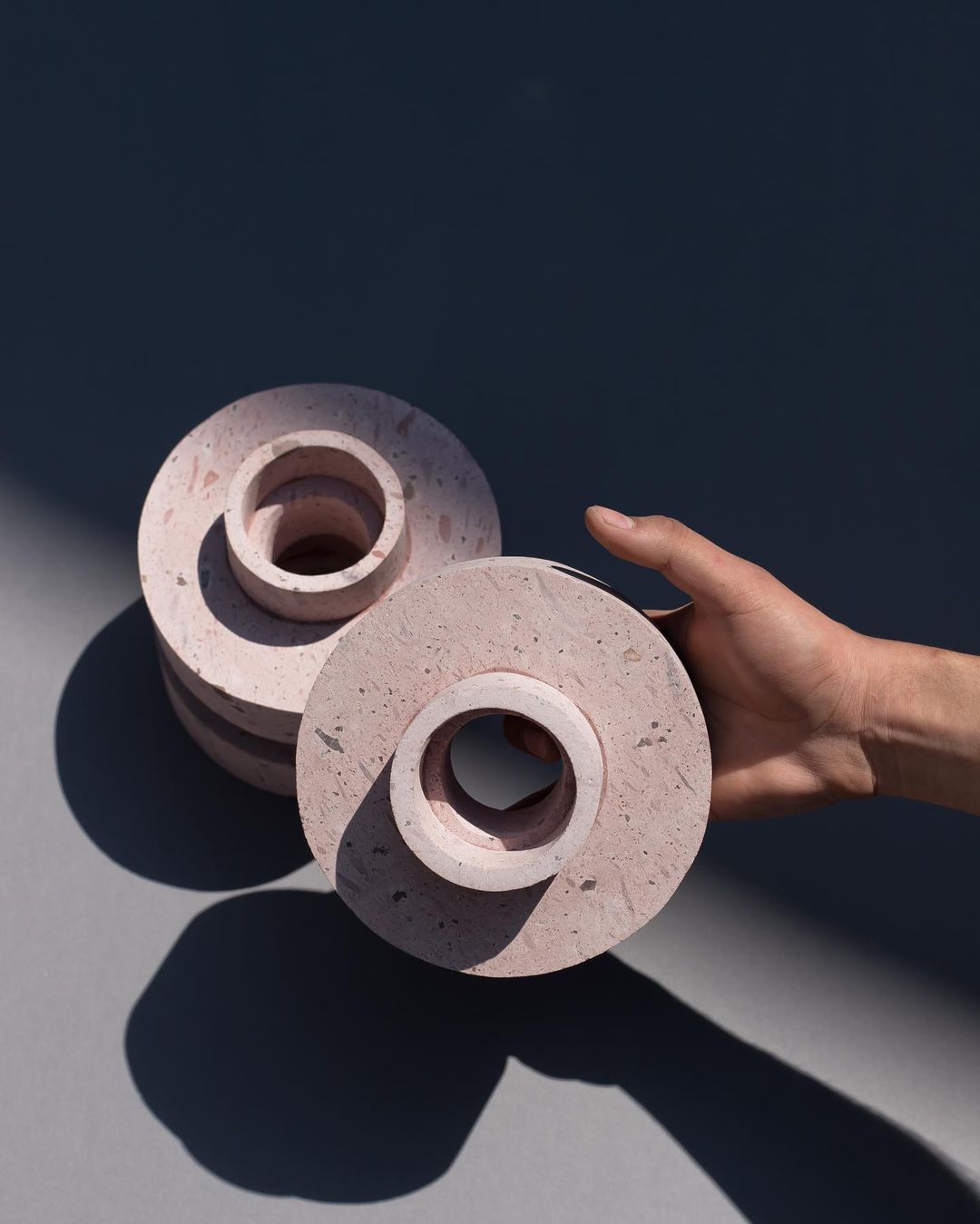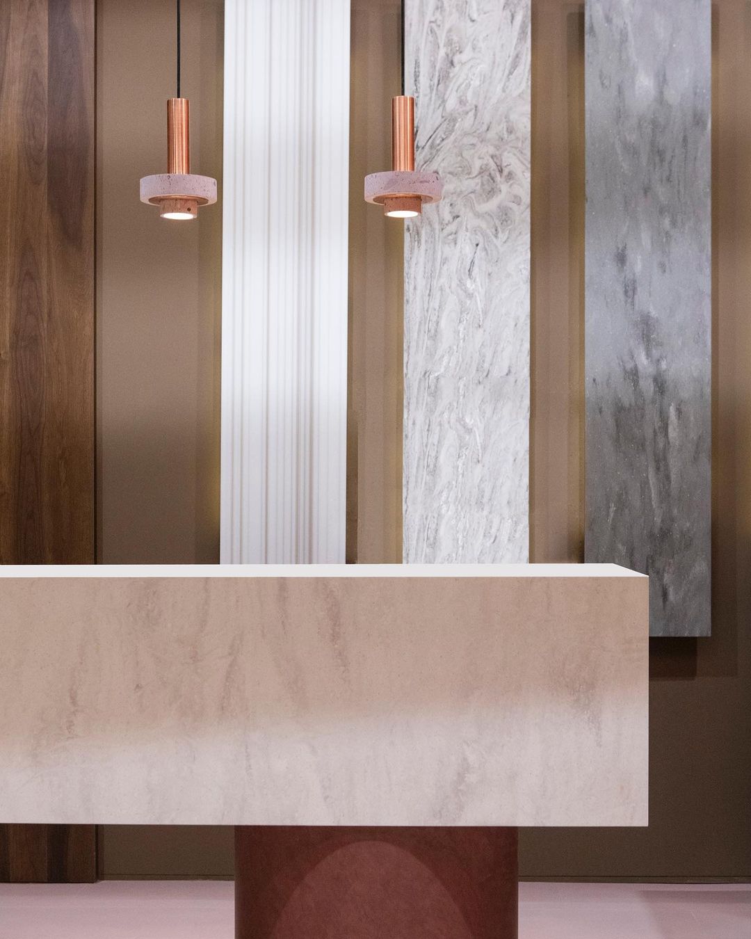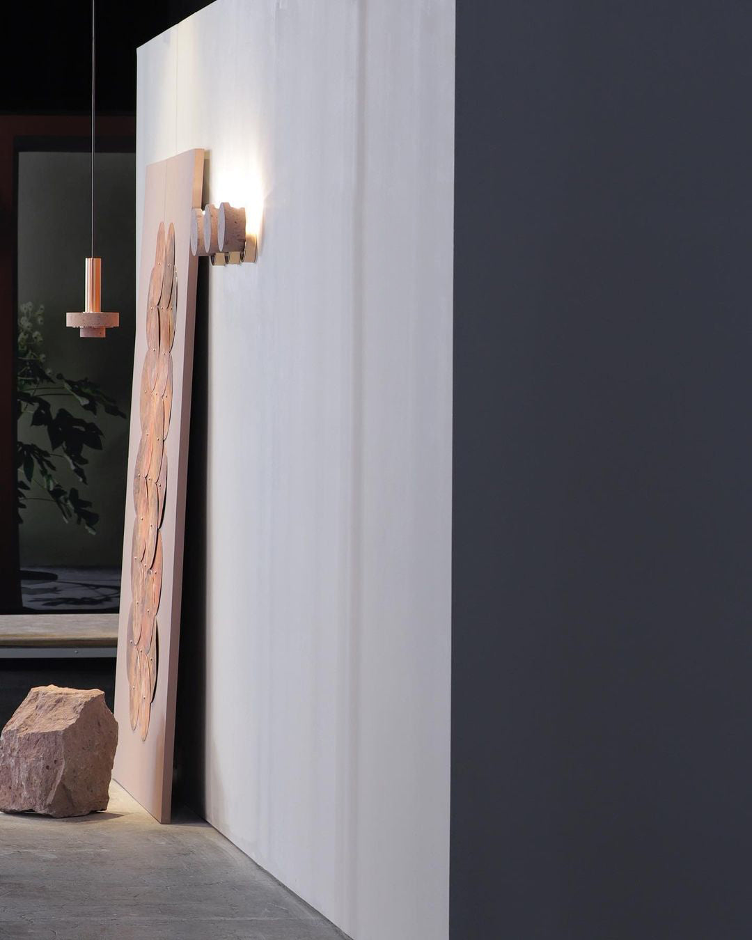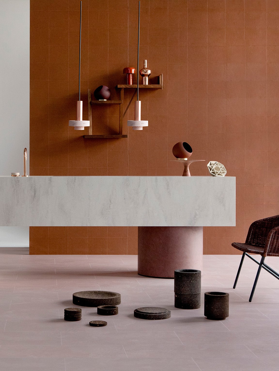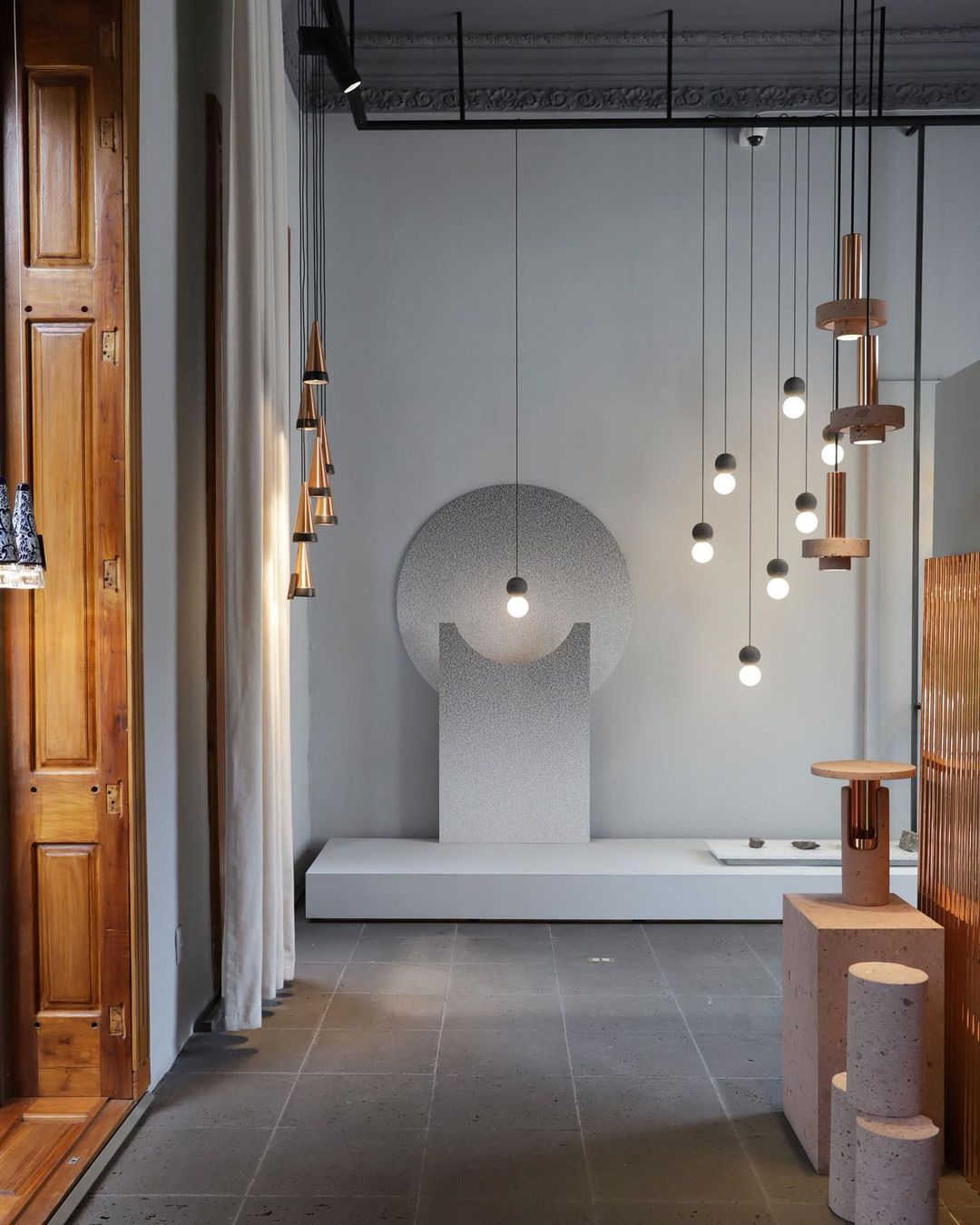 Ambra pendant´s timeless geometrical form speaks to us about architecture. Characterful and with strong lines, it is simply shaped and elegant. The proportions play with gravity, overlapping both materials. It becomes the center of attention with its warm and vibrant light. The unquestionable rich aesthetic of brushed copper and the stunning volcanic rock texture becomes a sculpture of light.