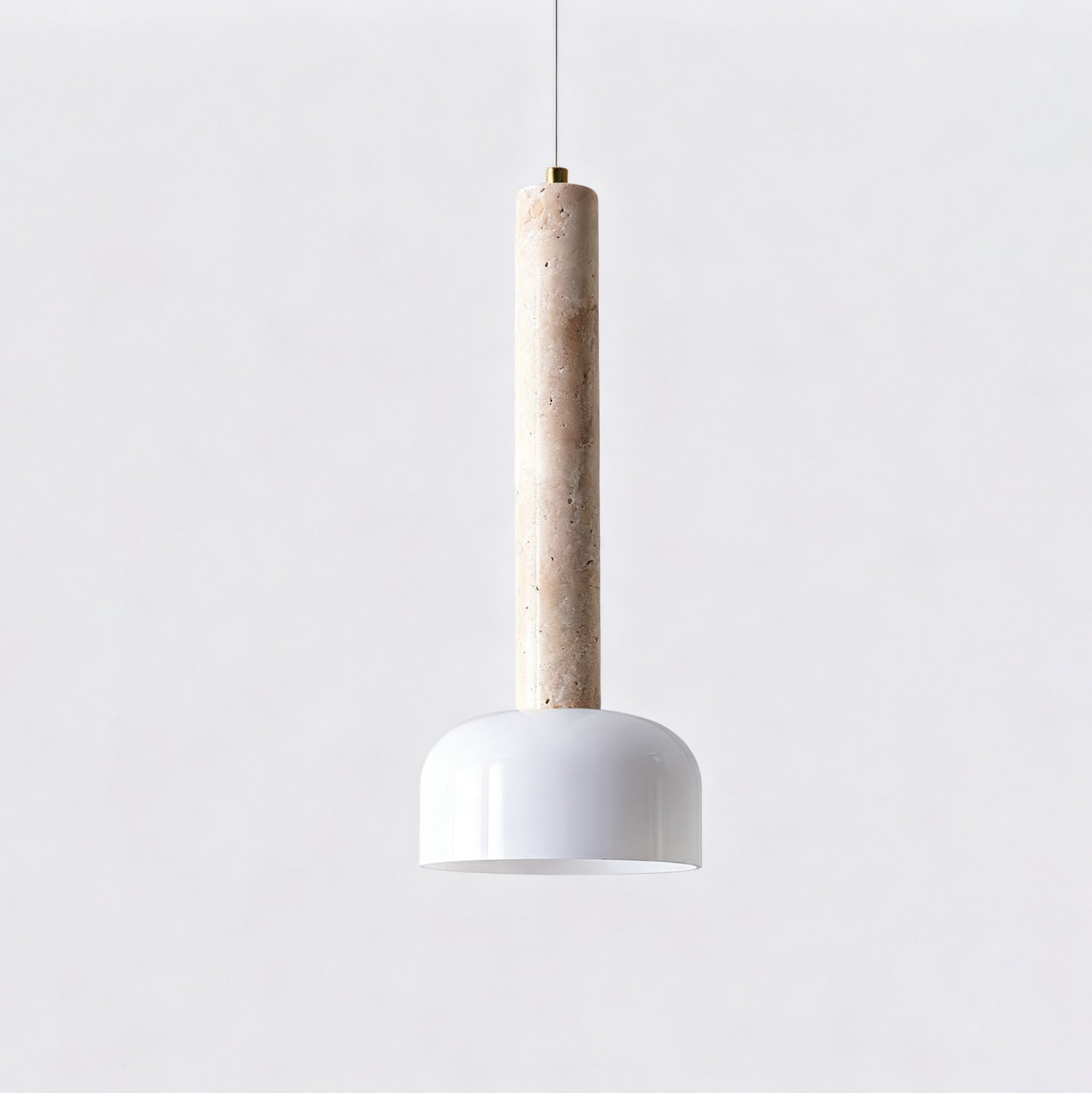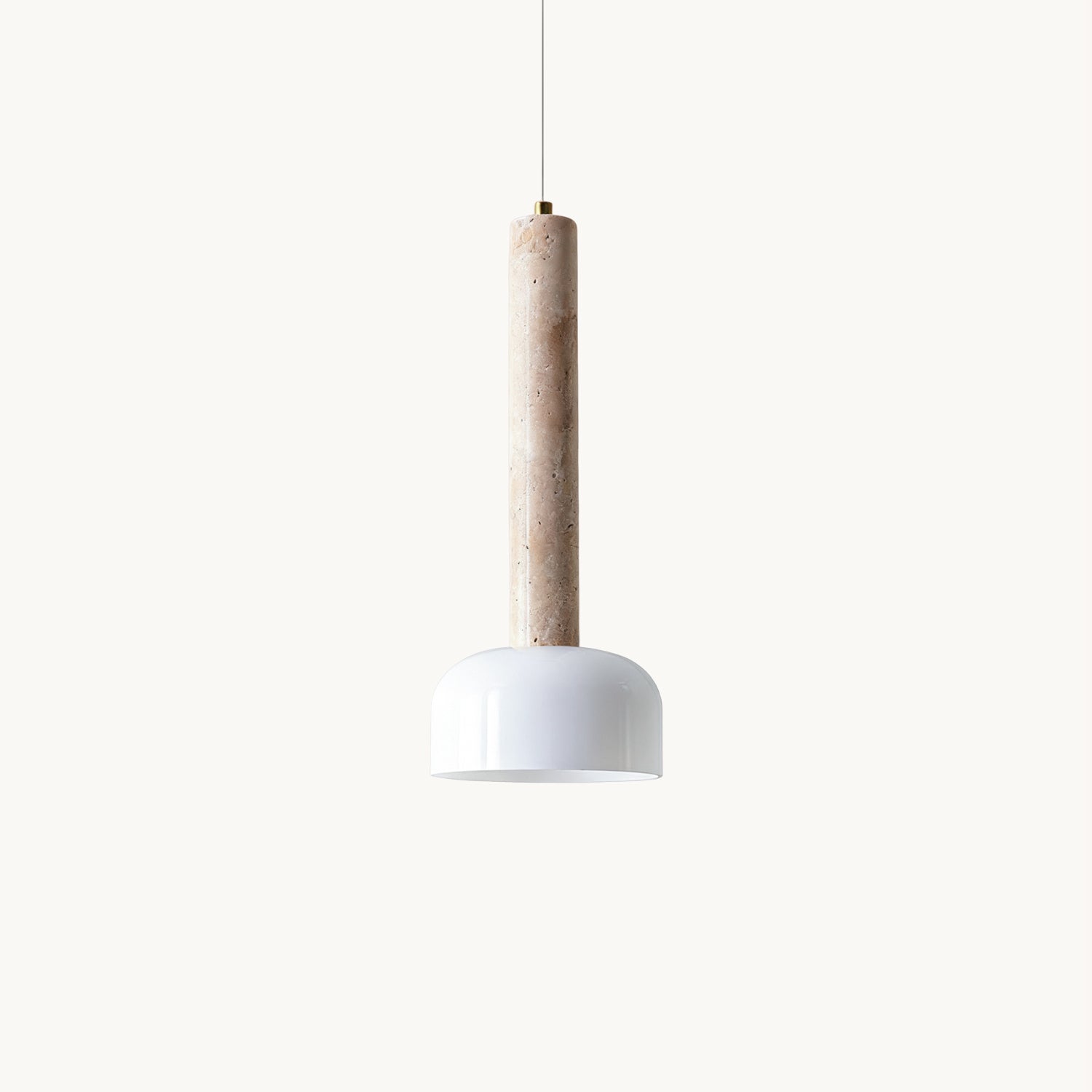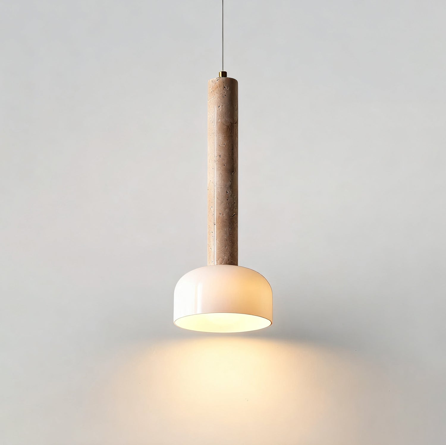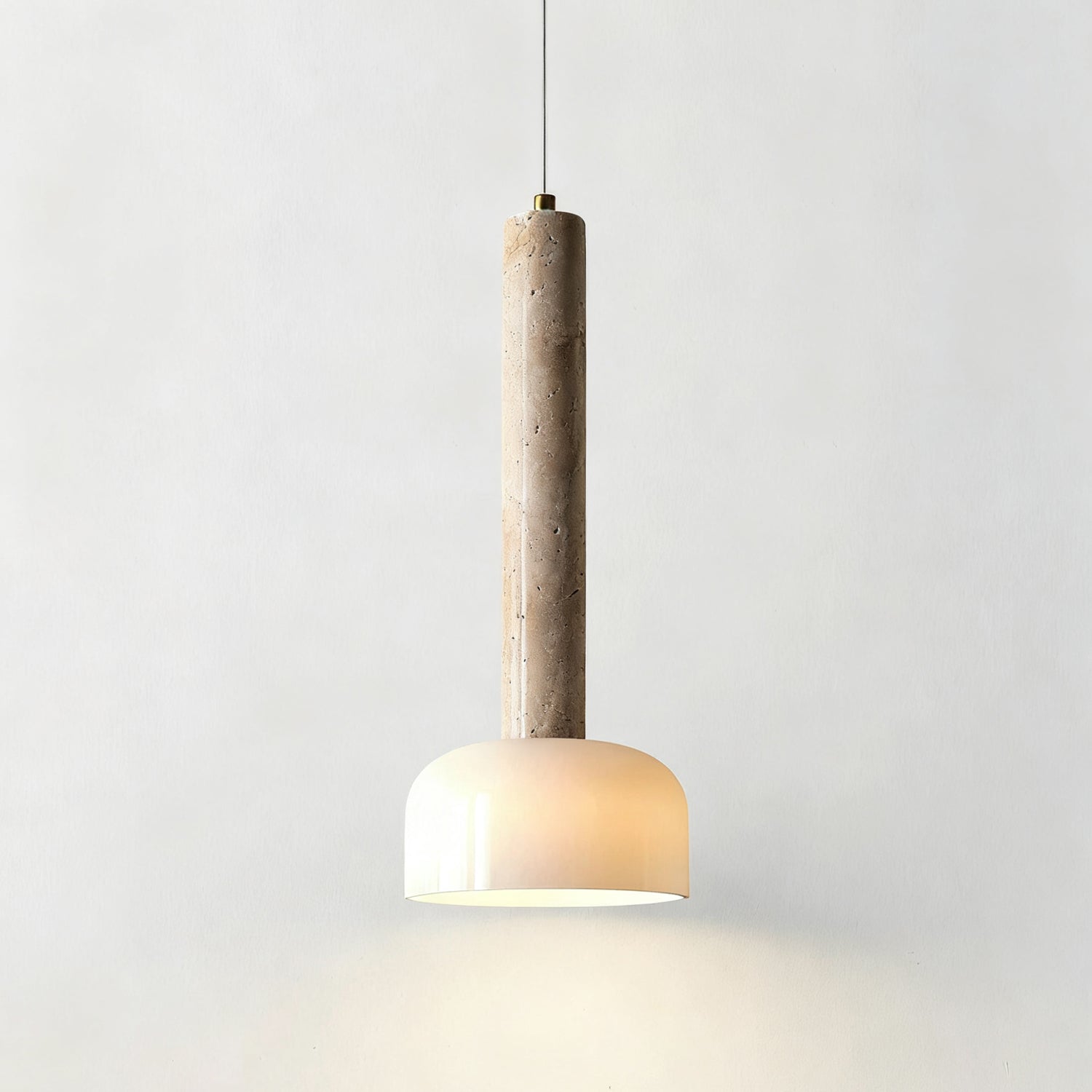 The Angelia Travertine Pendant Lamp from Mooijane pairs a slender travertine column with a rounded half-dome glass shade for a minimalist, composed design. Crafted from beige travertine, it showcases natural pores and warm sand tones. When illuminated, light is directed downward with a soft ambient spill—perfect over dining tables or kitchen islands. Multiples in a row create a harmonious rhythm, adding calm, layered elegance to any space.