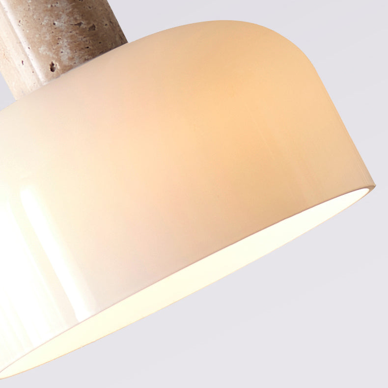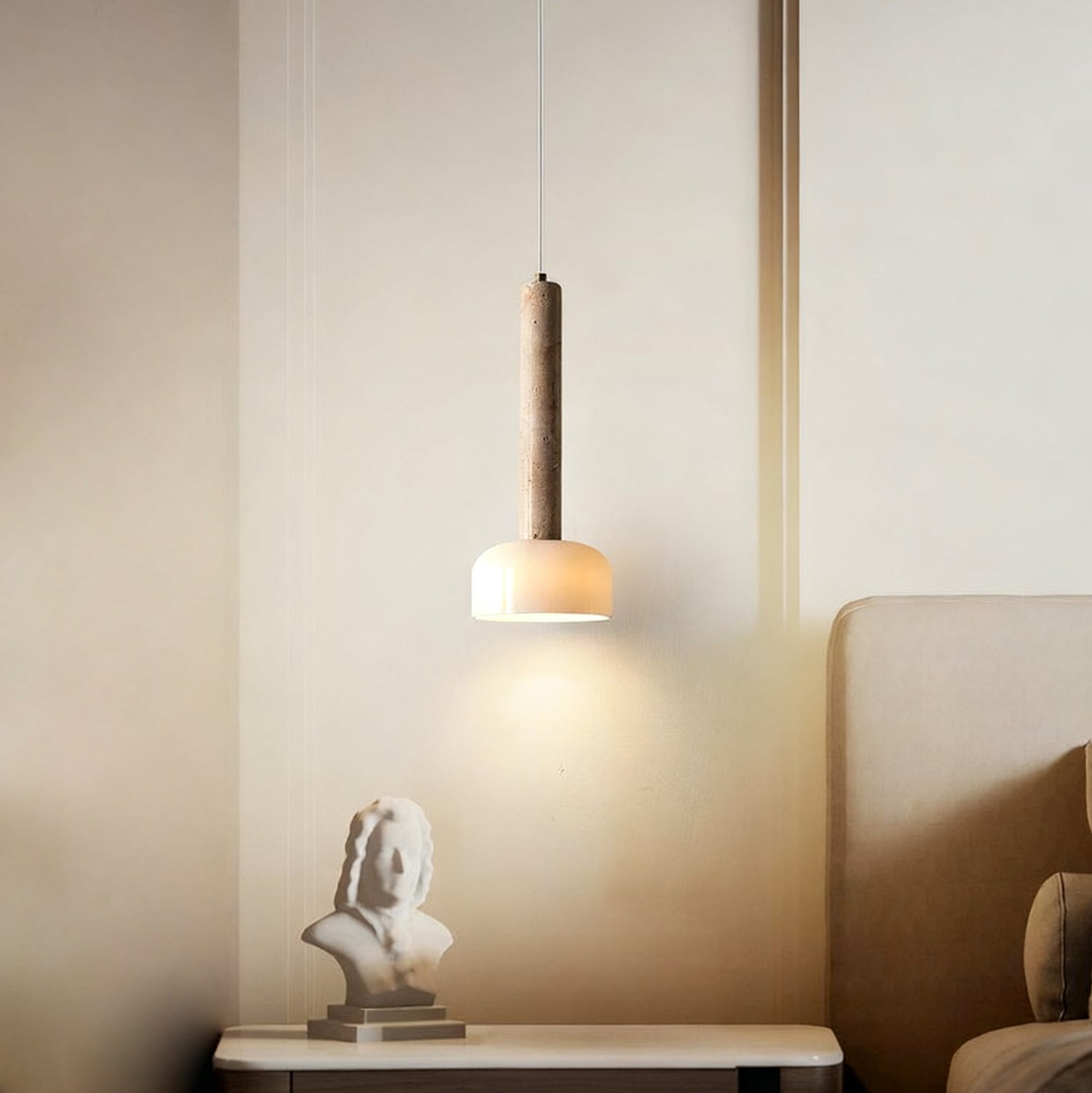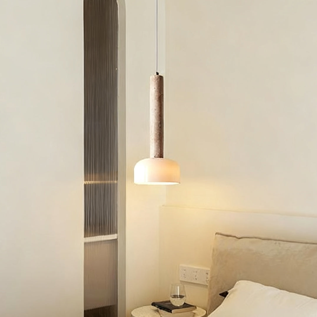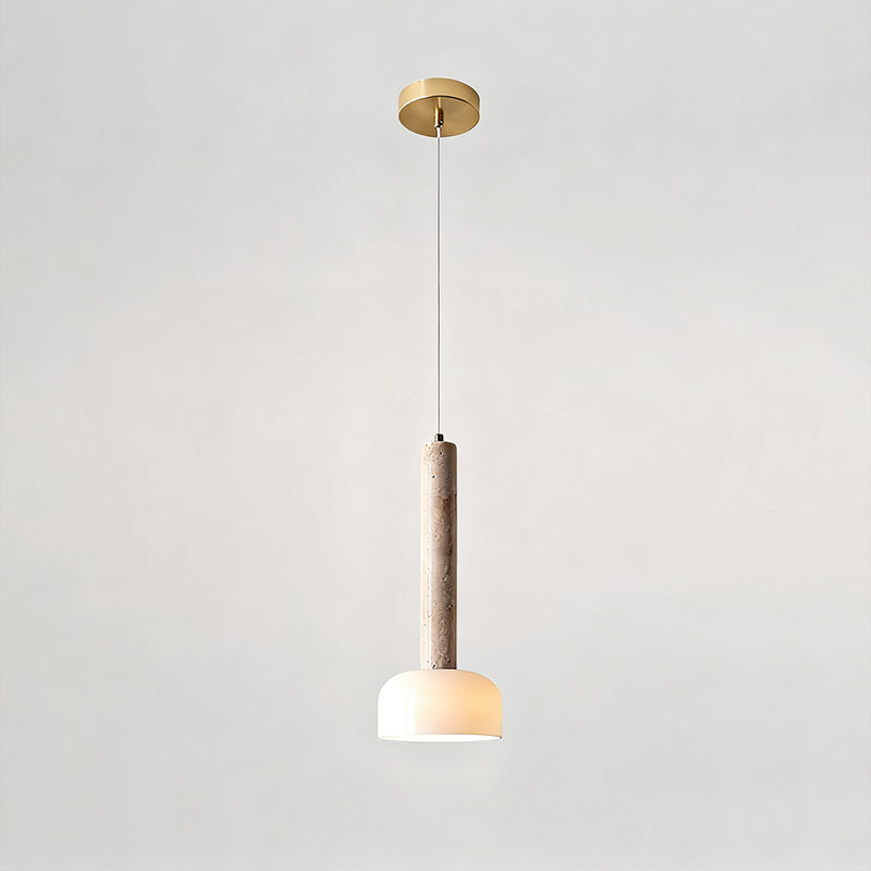 The Angelia Travertine Pendant Lamp from Mooijane pairs a slender travertine column with a rounded half-dome glass shade for a minimalist, composed design. Crafted from beige travertine, it showcases natural pores and warm sand tones. When illuminated, light is directed downward with a soft ambient spill—perfect over dining tables or kitchen islands. Multiples in a row create a harmonious rhythm, adding calm, layered elegance to any space.