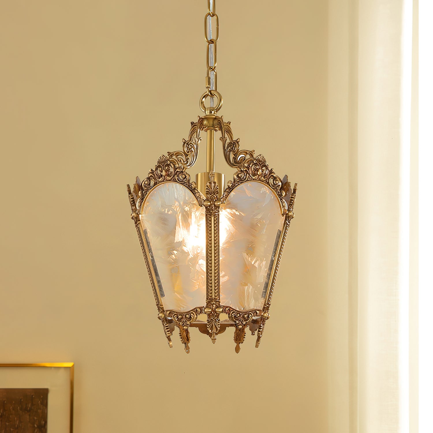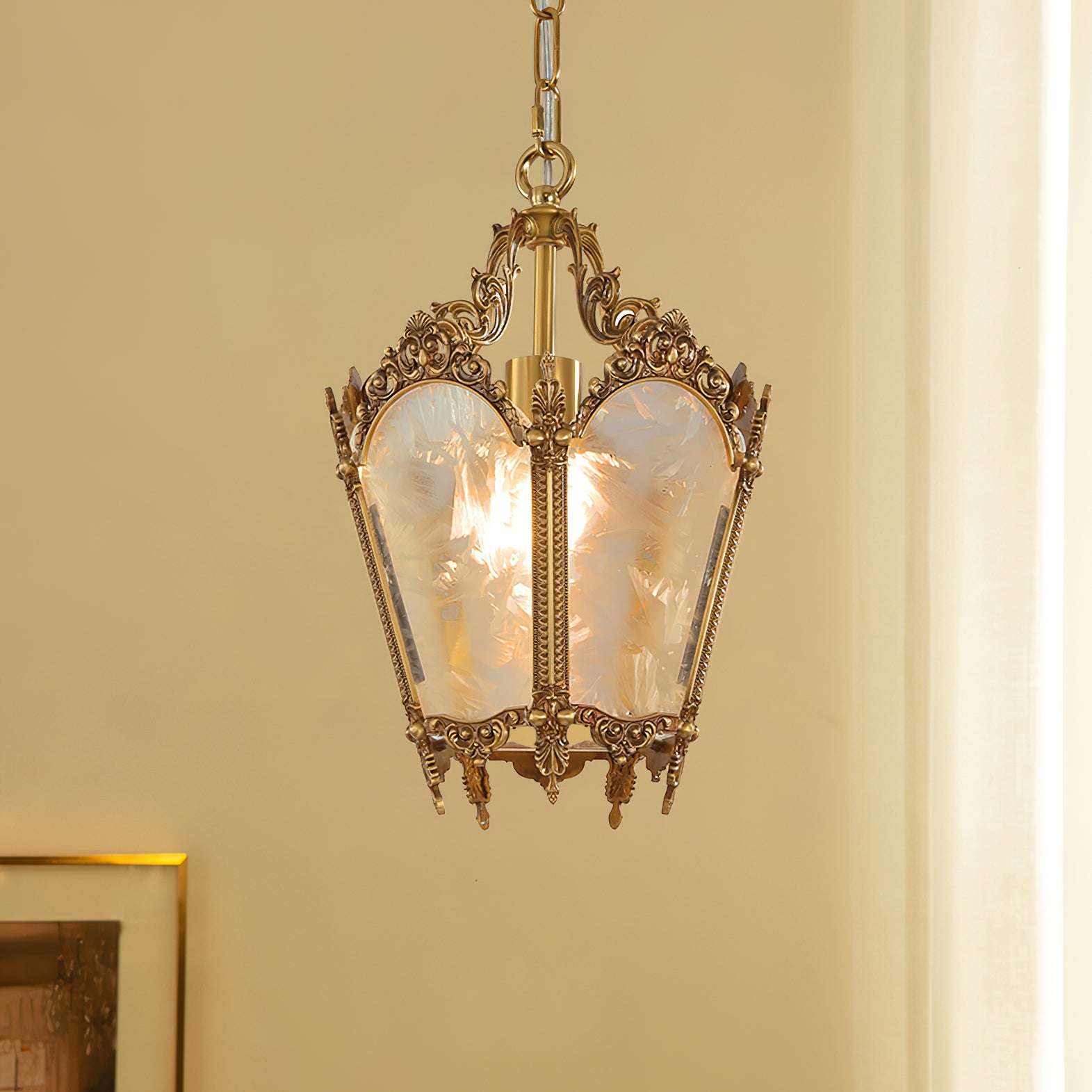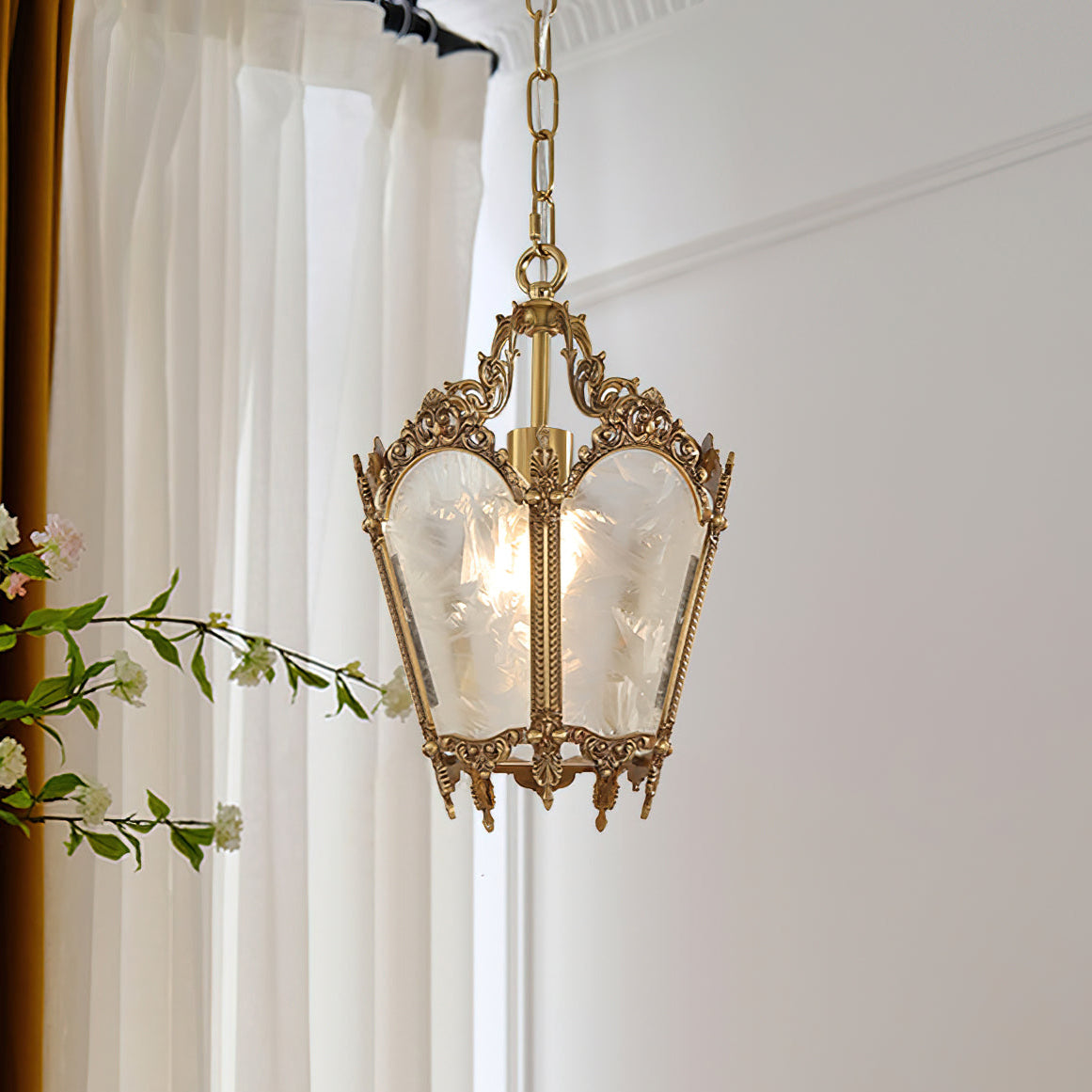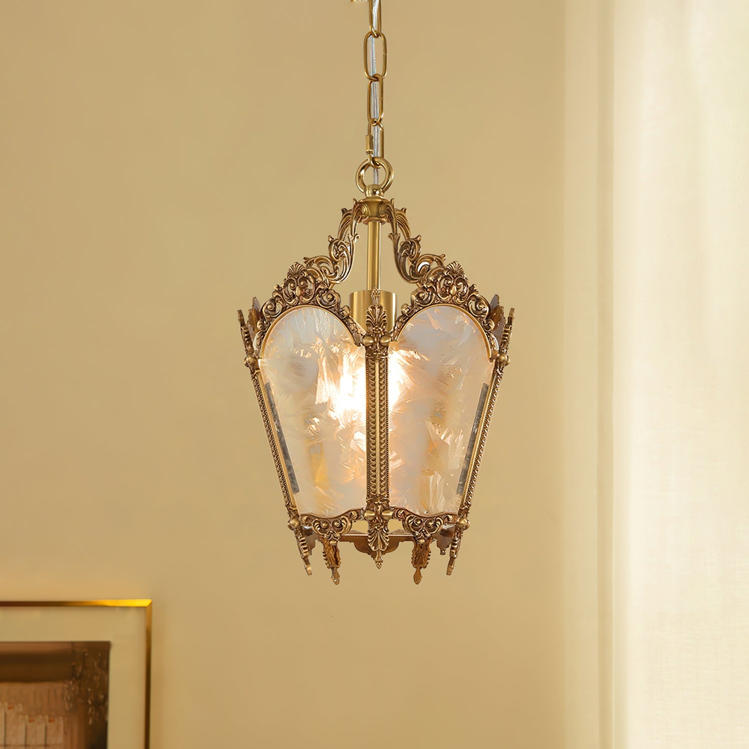 Upgrade your interior with our Antique Lantern Pendant Lamp from Mooijane. The lantern design adds a romantic and mysterious touch, while the delicate ice glass lampshade adds artistic beauty. Illuminate any indoor area with its soft and elegant lighting. Perfect for kitchens, bars, workshops, and more.