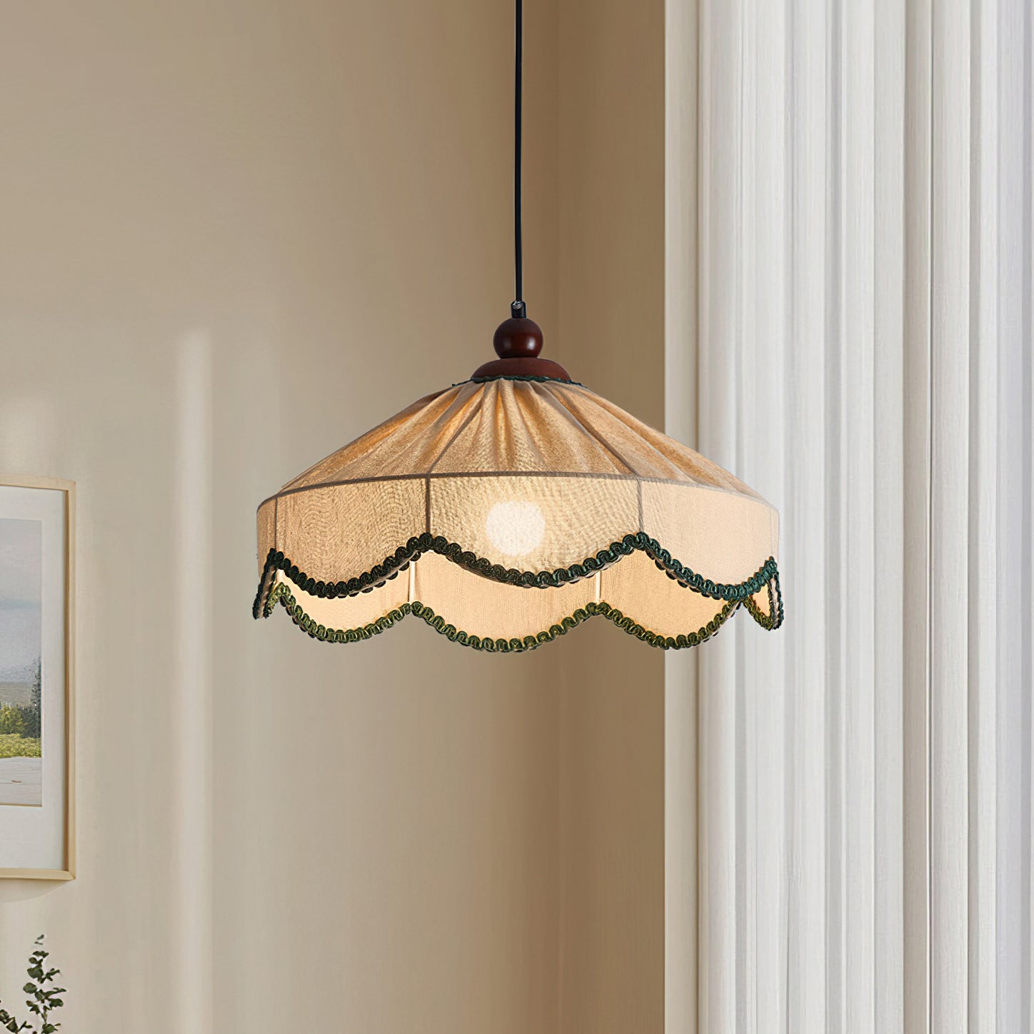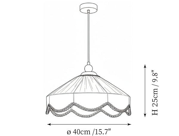 The Araceli Pendant Lamp from Mooijane blends vintage-inspired design with natural wood and soft fabric for a timeless, inviting look. The delicate fabric shade, adorned with scalloped trim, enhances its nostalgic appeal, while the wood top adds warmth and rustic elegance.