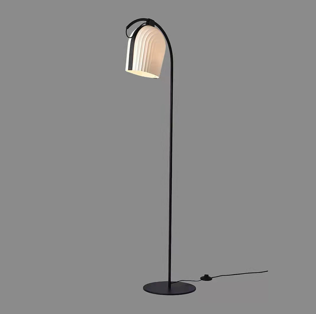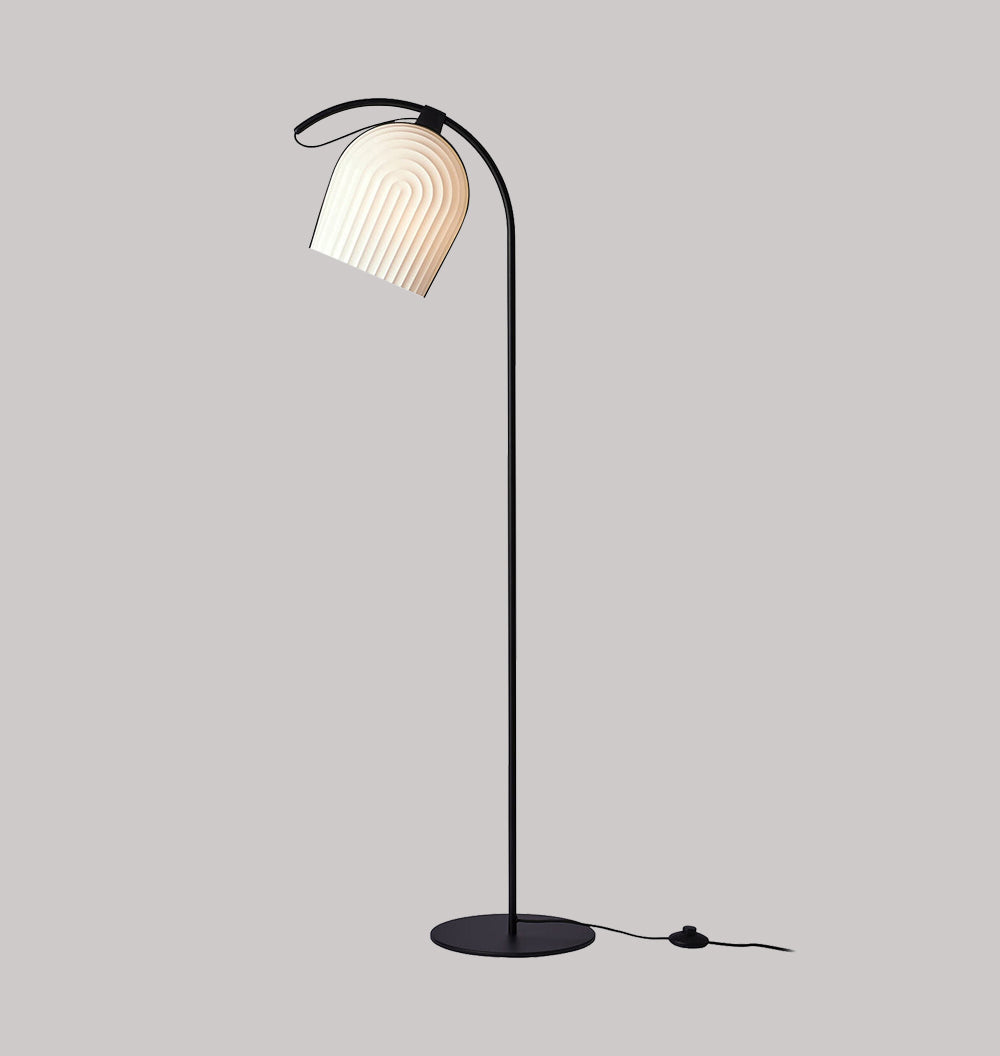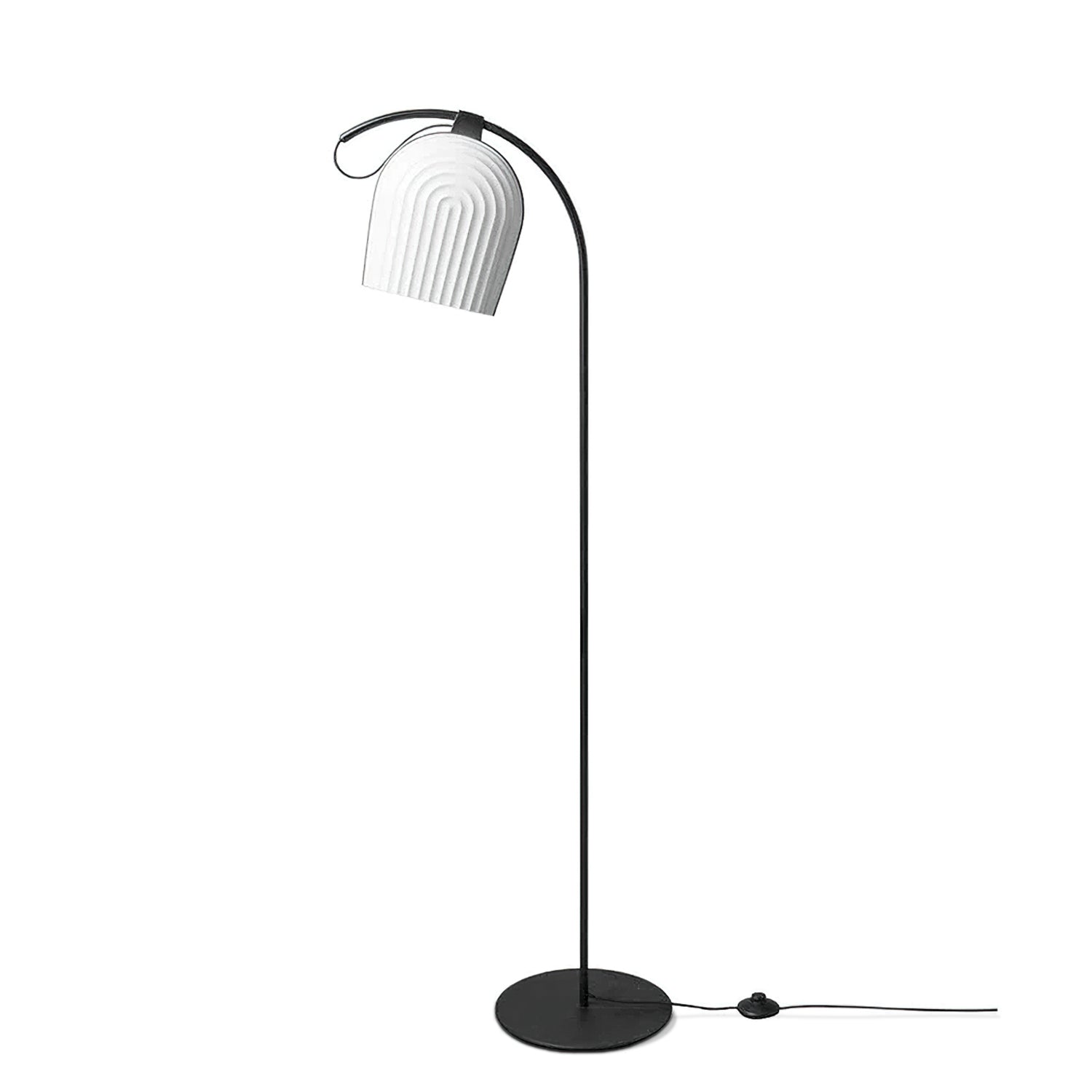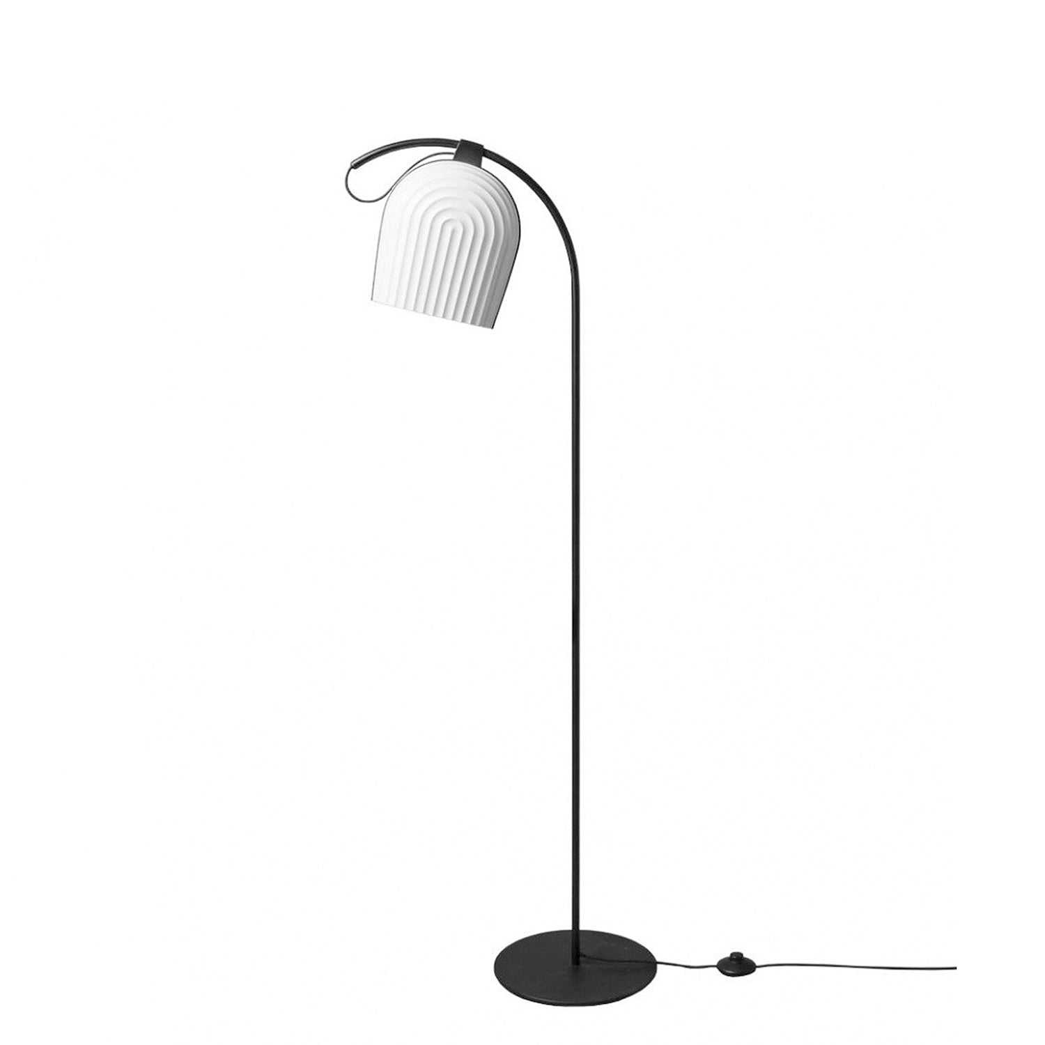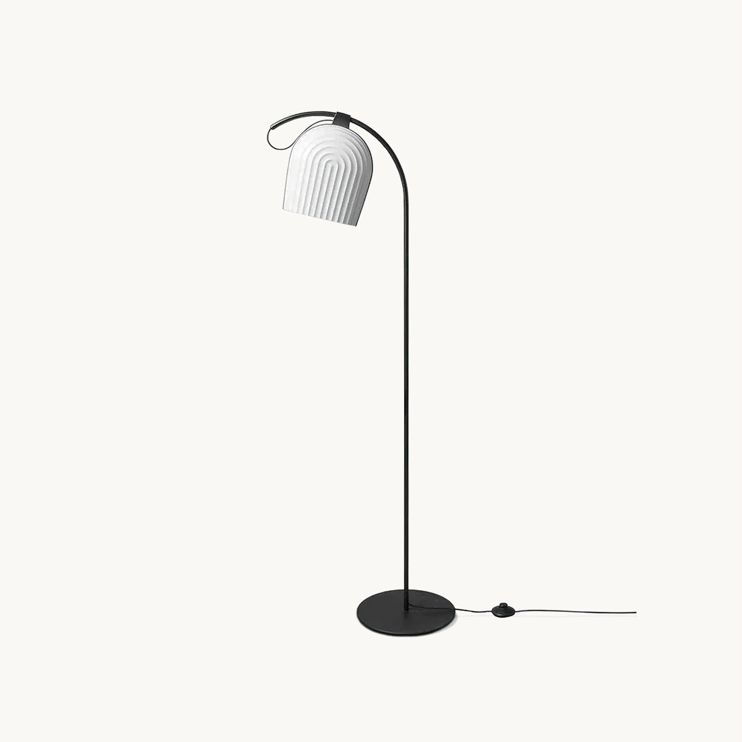 Floor lamp providing diffused light with on / off foot switch on cord. Shade slides back and forth on the arc of the stem to adjust the light to where you need it, while also changing the look of the lamp. Some assembly is required.