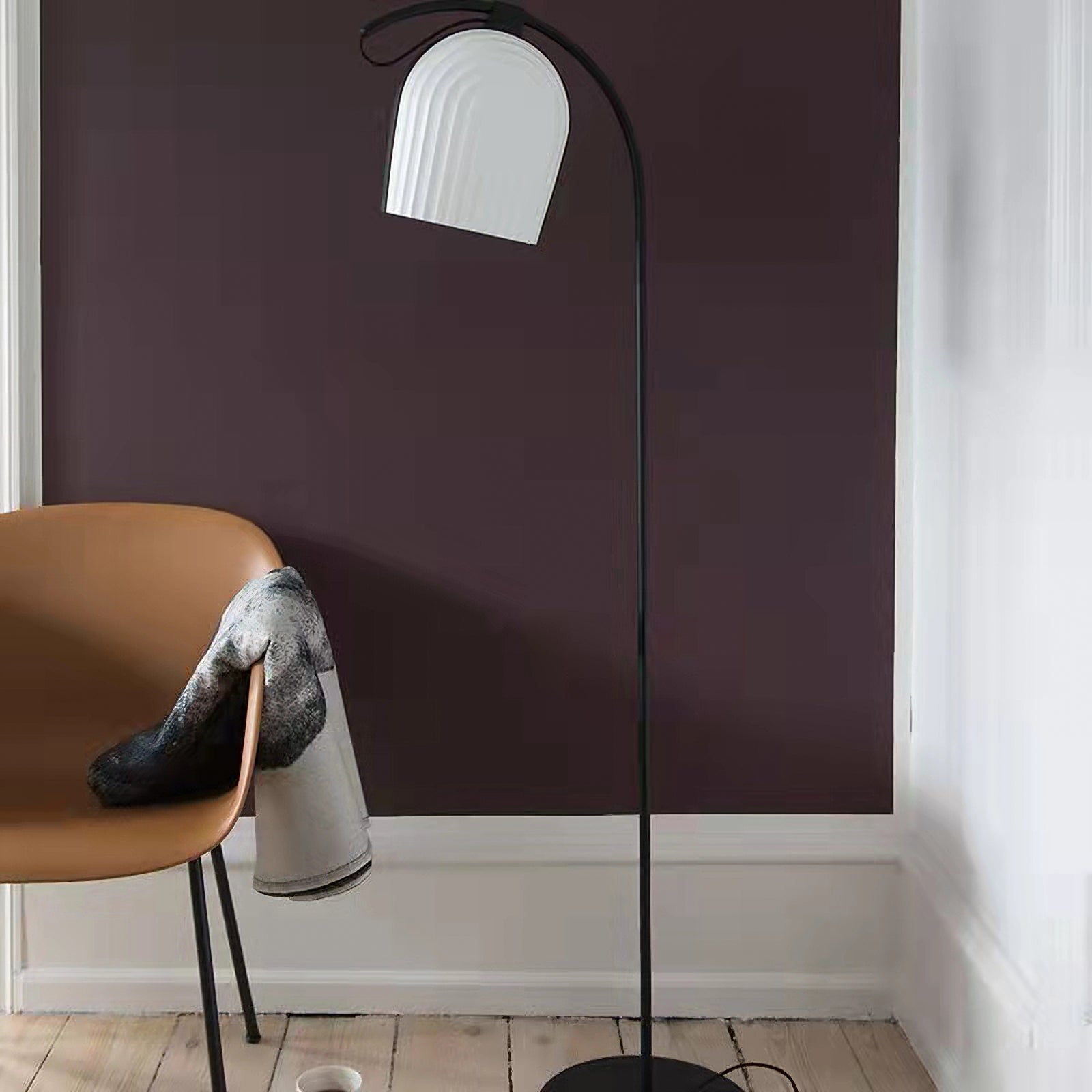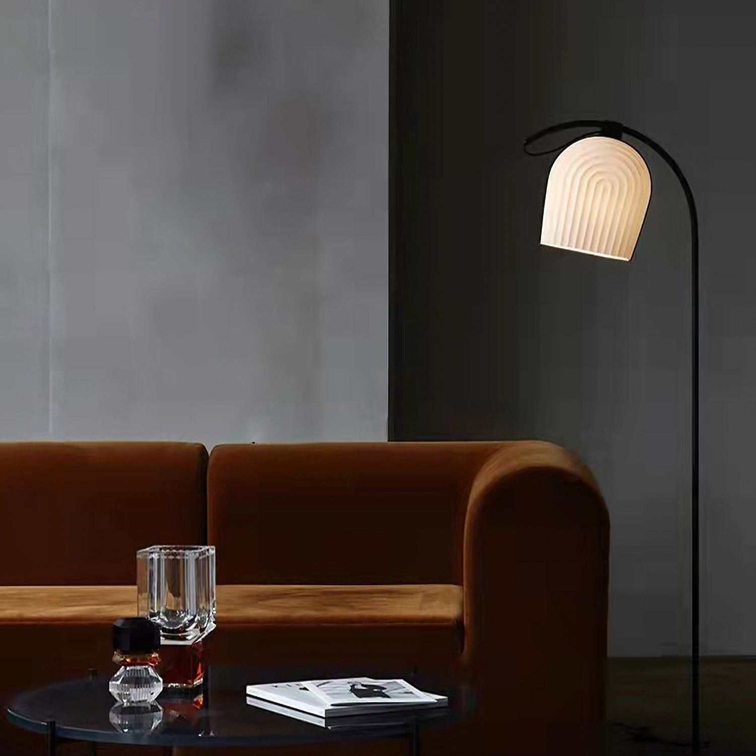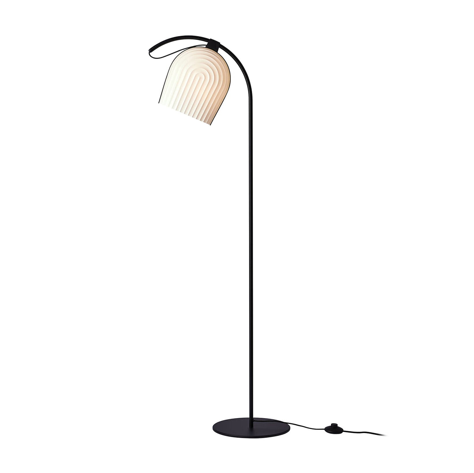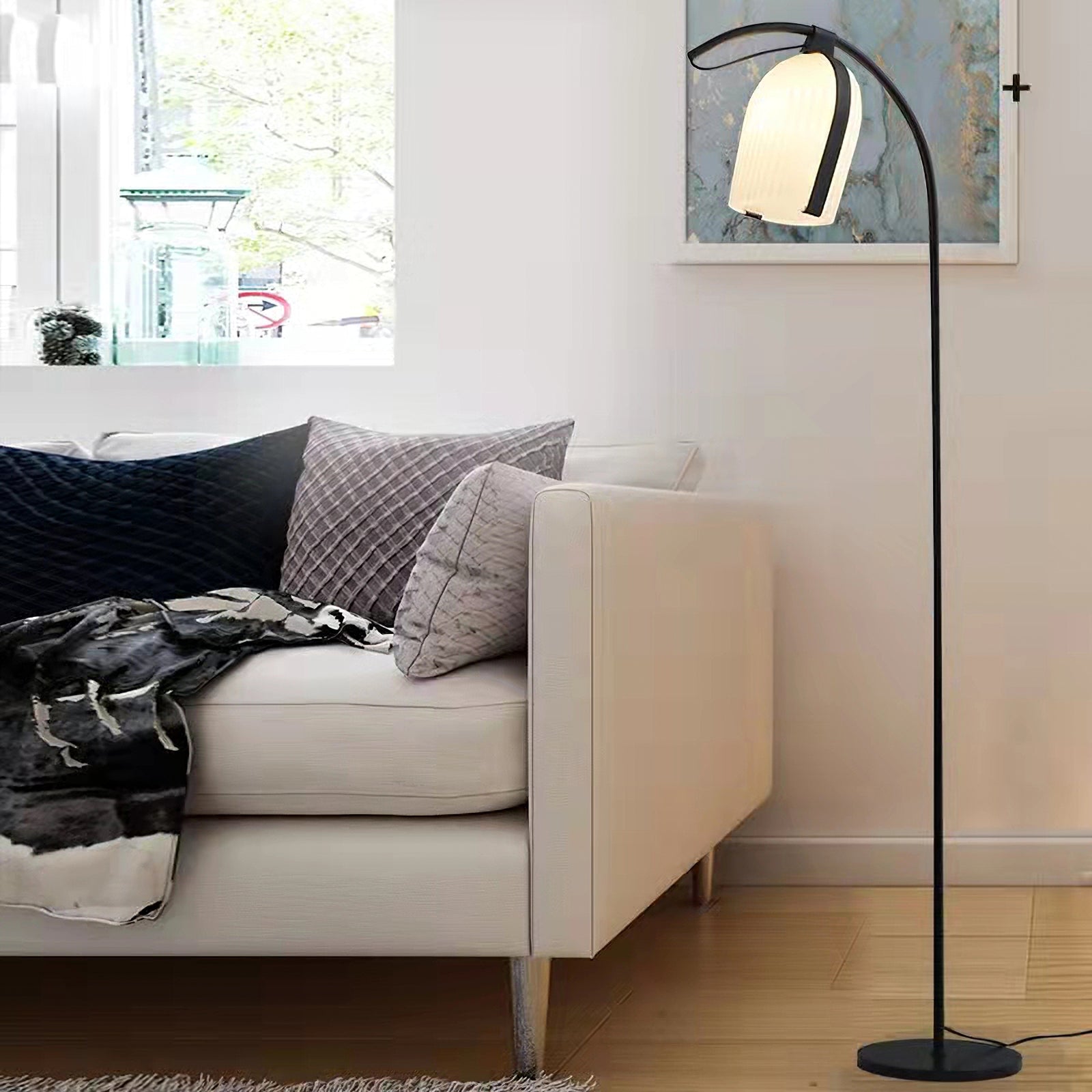 Floor lamp providing diffused light with on / off foot switch on cord. Shade slides back and forth on the arc of the stem to adjust the light to where you need it, while also changing the look of the lamp. Some assembly is required.