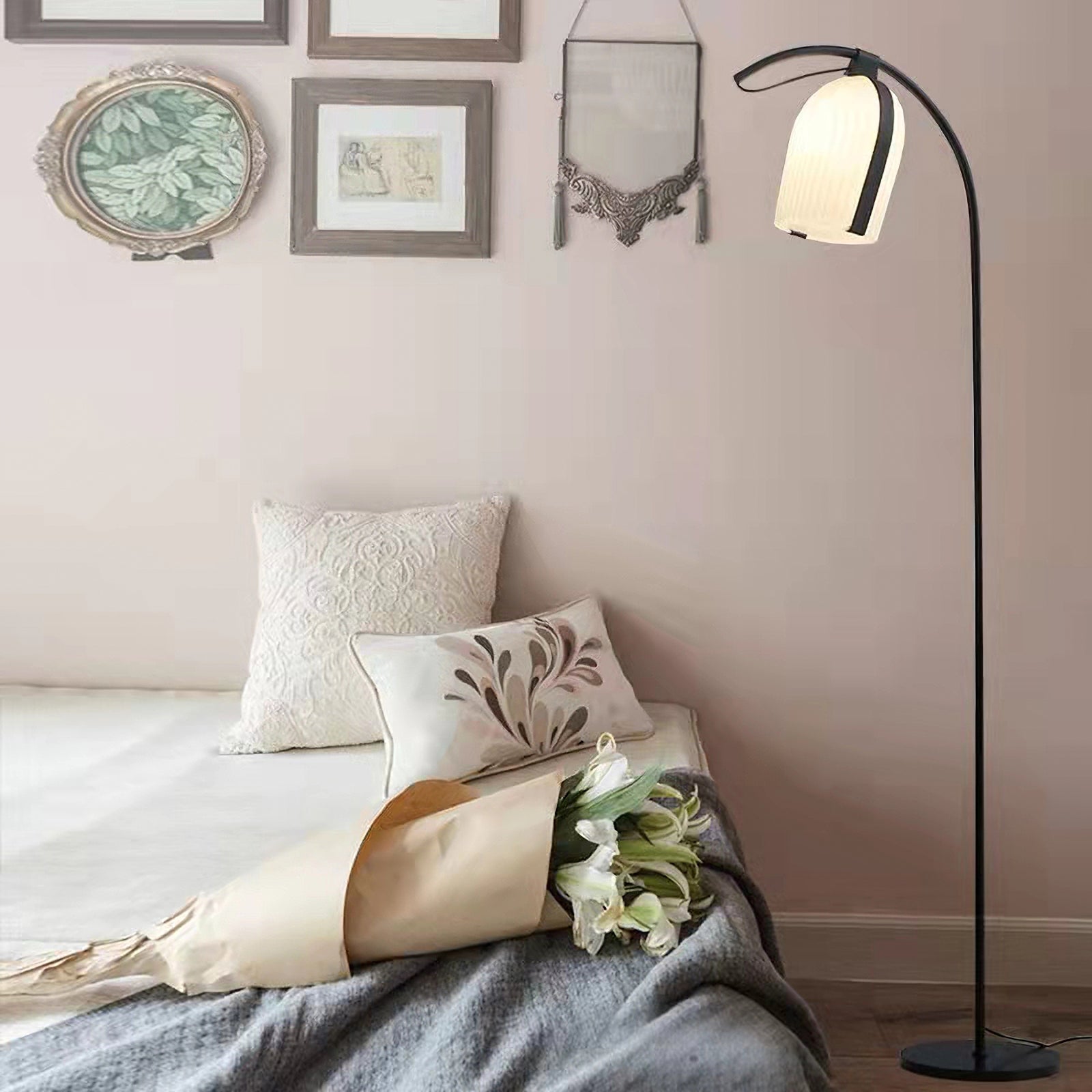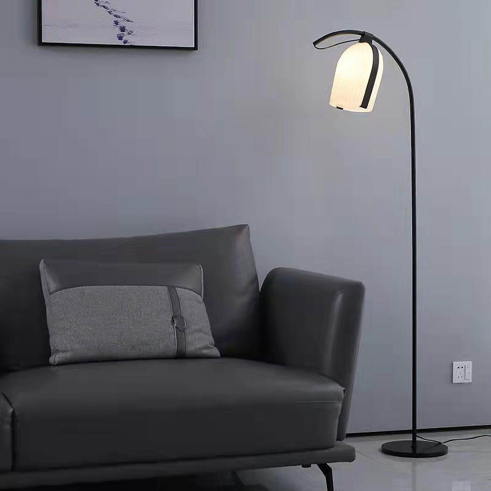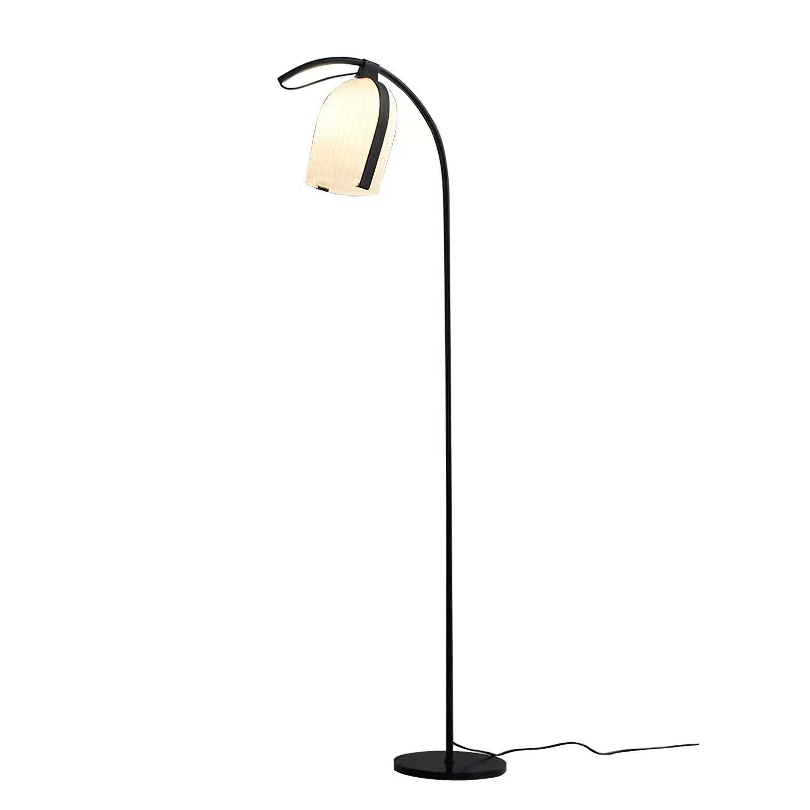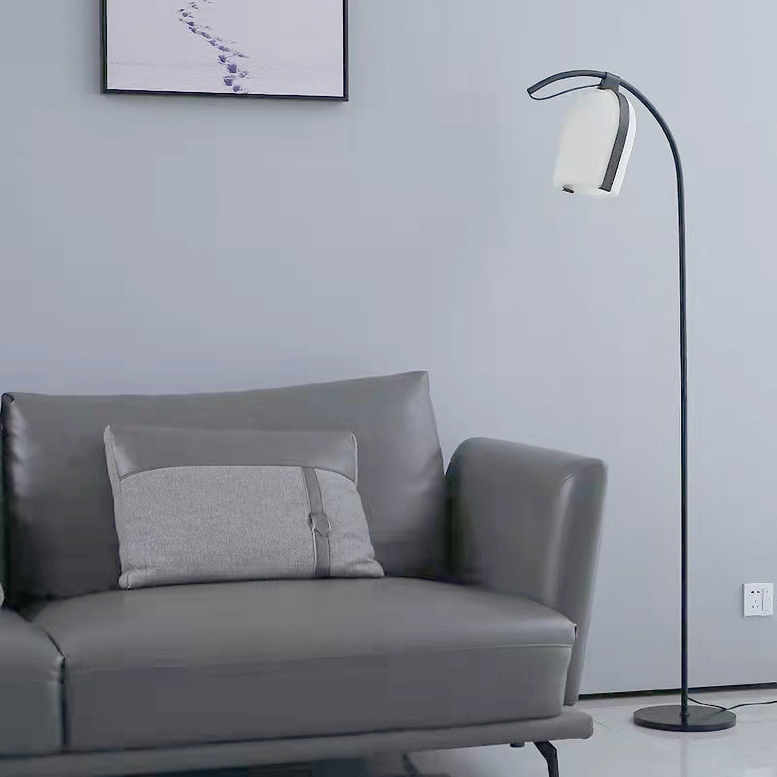 Floor lamp providing diffused light with on / off foot switch on cord. Shade slides back and forth on the arc of the stem to adjust the light to where you need it, while also changing the look of the lamp. Some assembly is required.