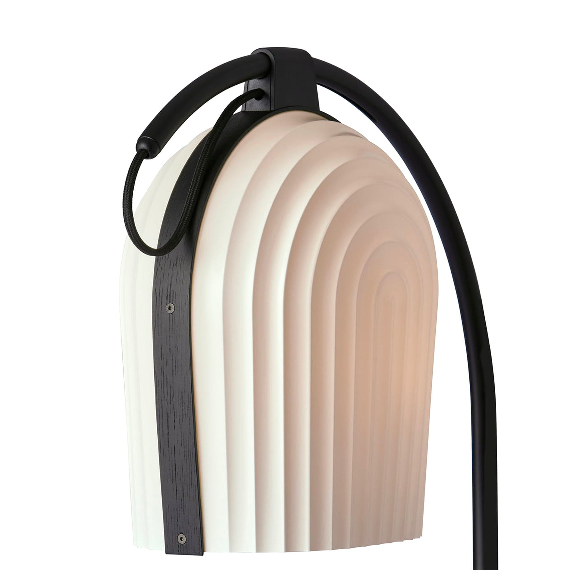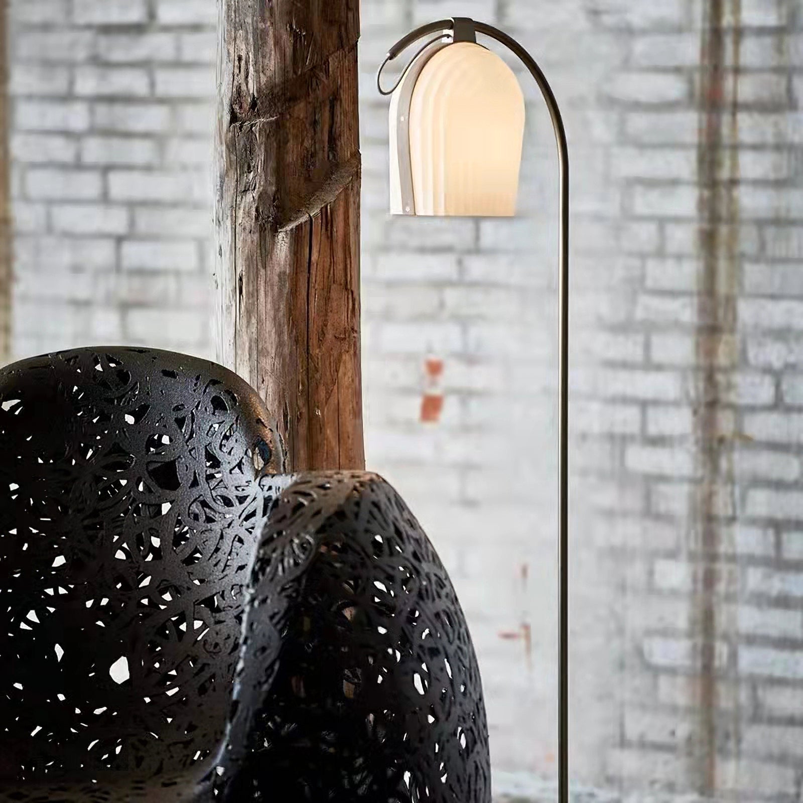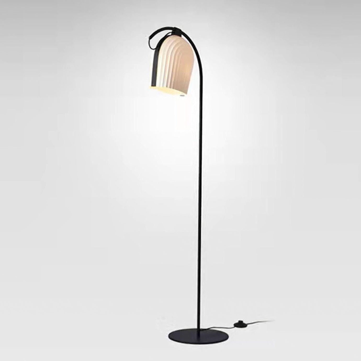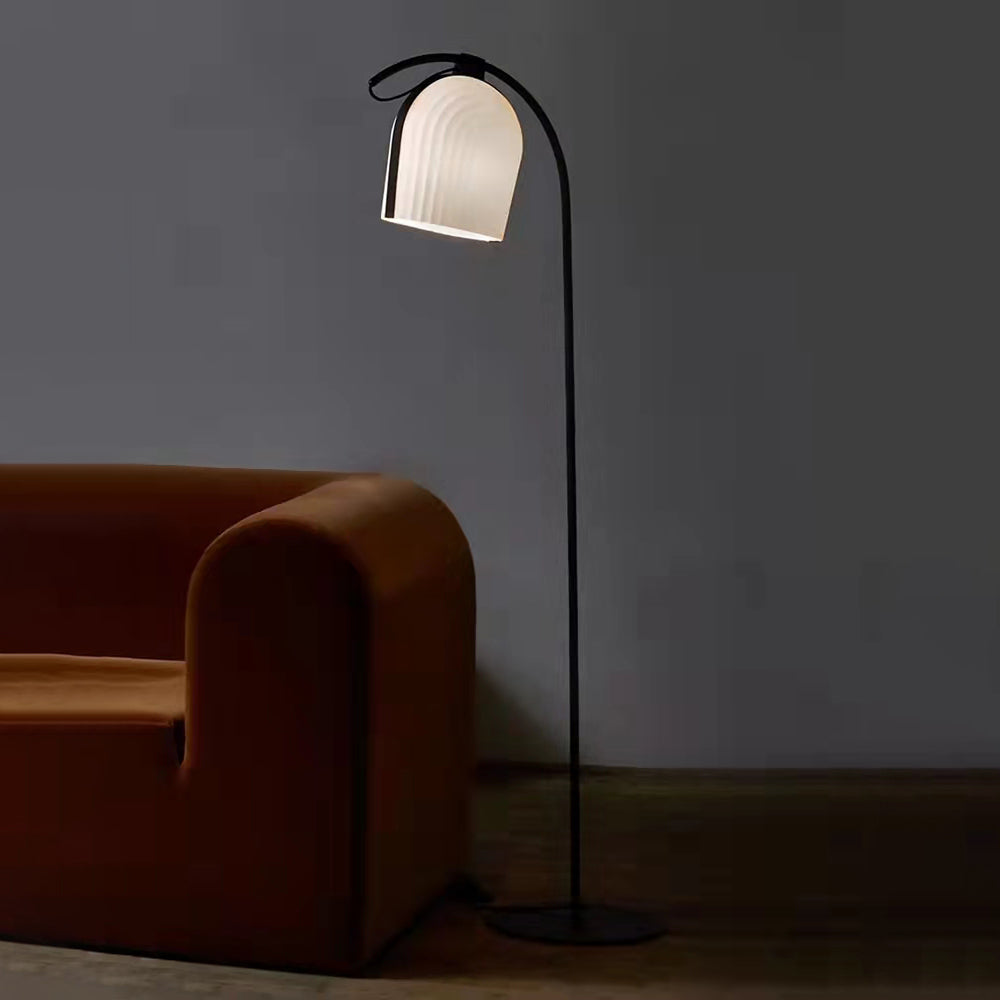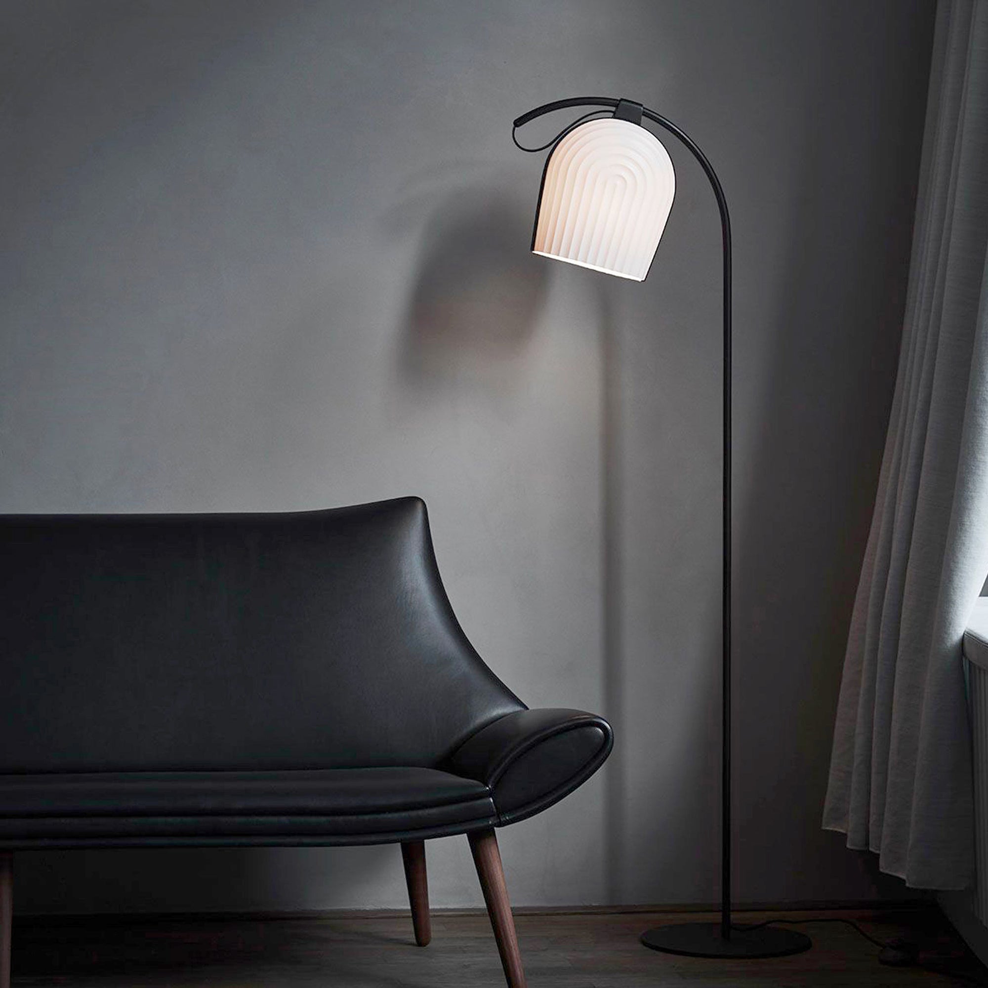 Floor lamp providing diffused light with on / off foot switch on cord. Shade slides back and forth on the arc of the stem to adjust the light to where you need it, while also changing the look of the lamp. Some assembly is required.