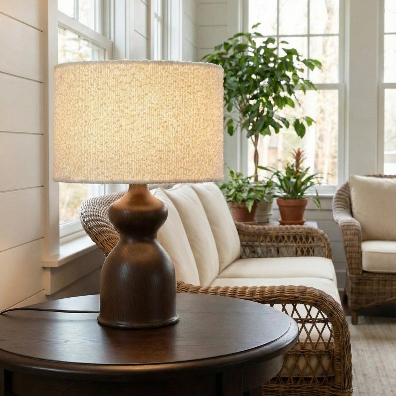 The Ariana Table Lamp from Mooijane blends warm softness with sculptural elegance through its gently contoured wooden base and finely textured fabric shade. The hand-finished wood features a smooth, flowing silhouette that brings an organic, natural presence to any room. Above it, the fabric shade diffuses light into a warm, ambient glow—perfect for reading, unwinding, or creating a calming nighttime atmosphere.