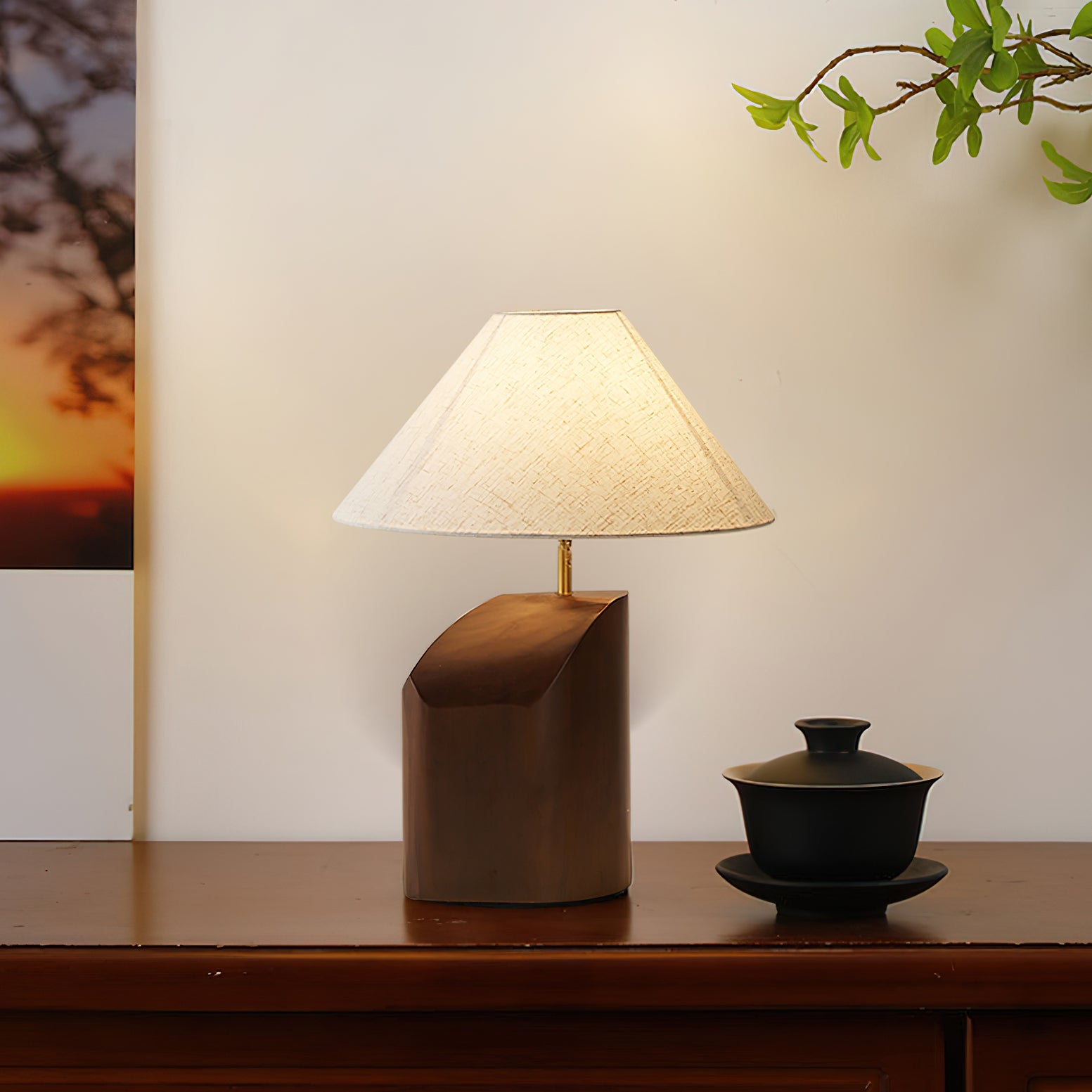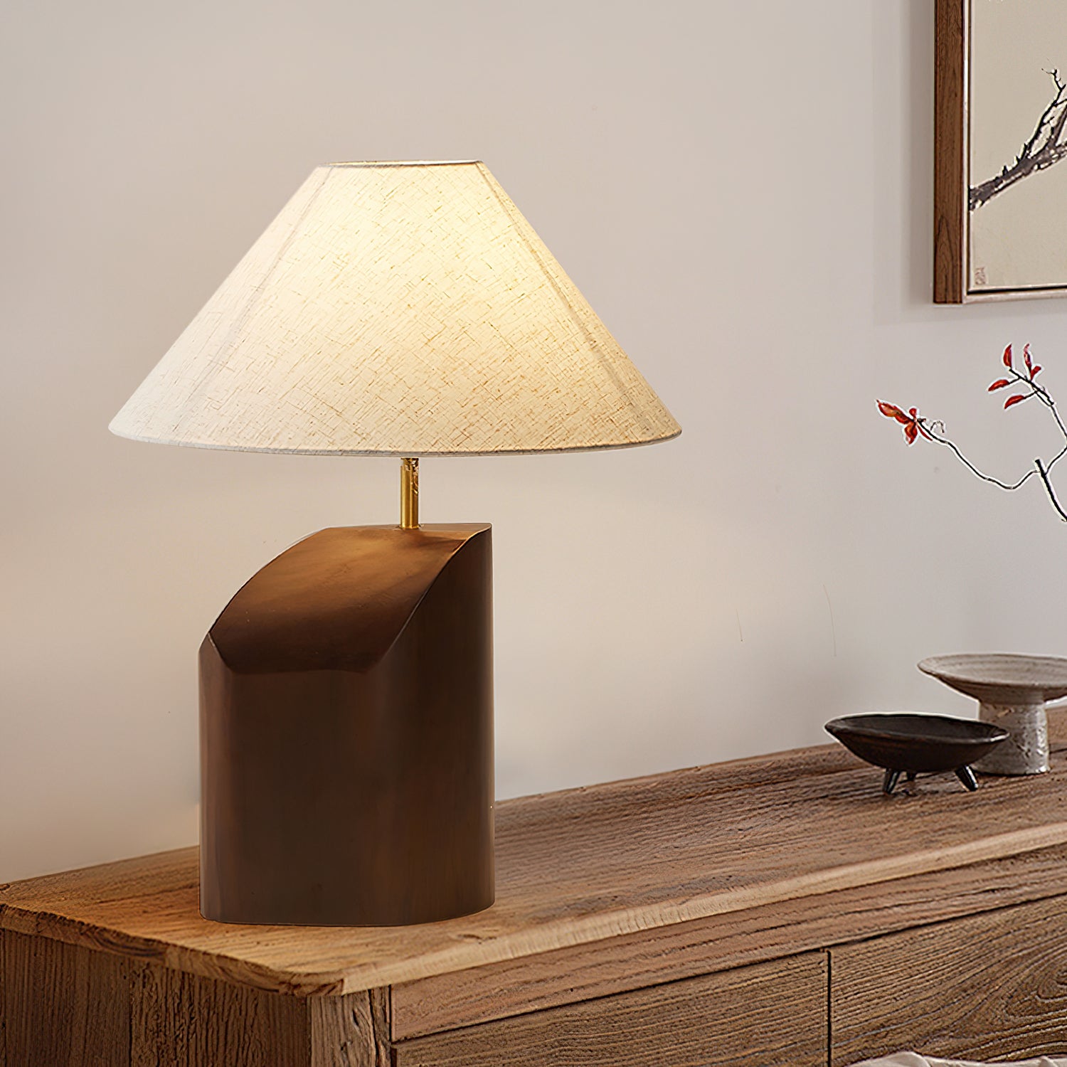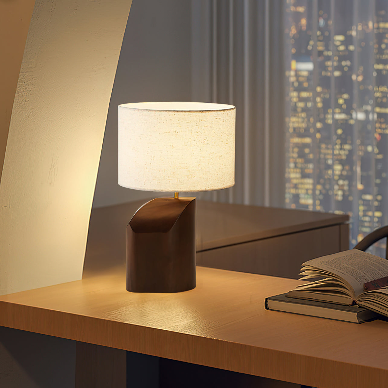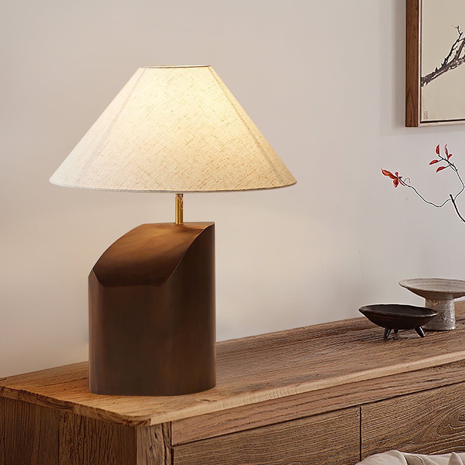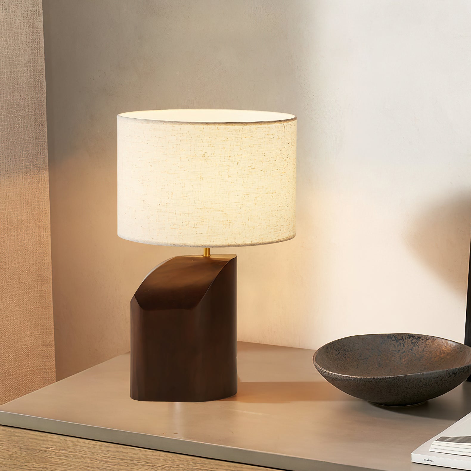 Elevate your space with the Arouca Table Lamp from Mooijane. The sculptural walnut wood base adds a touch of modern elegance, while the asymmetrical curve and warm fabric lampshade create a sophisticated ambience. Perfect for a bedroom, reading nook, or any modern living area.