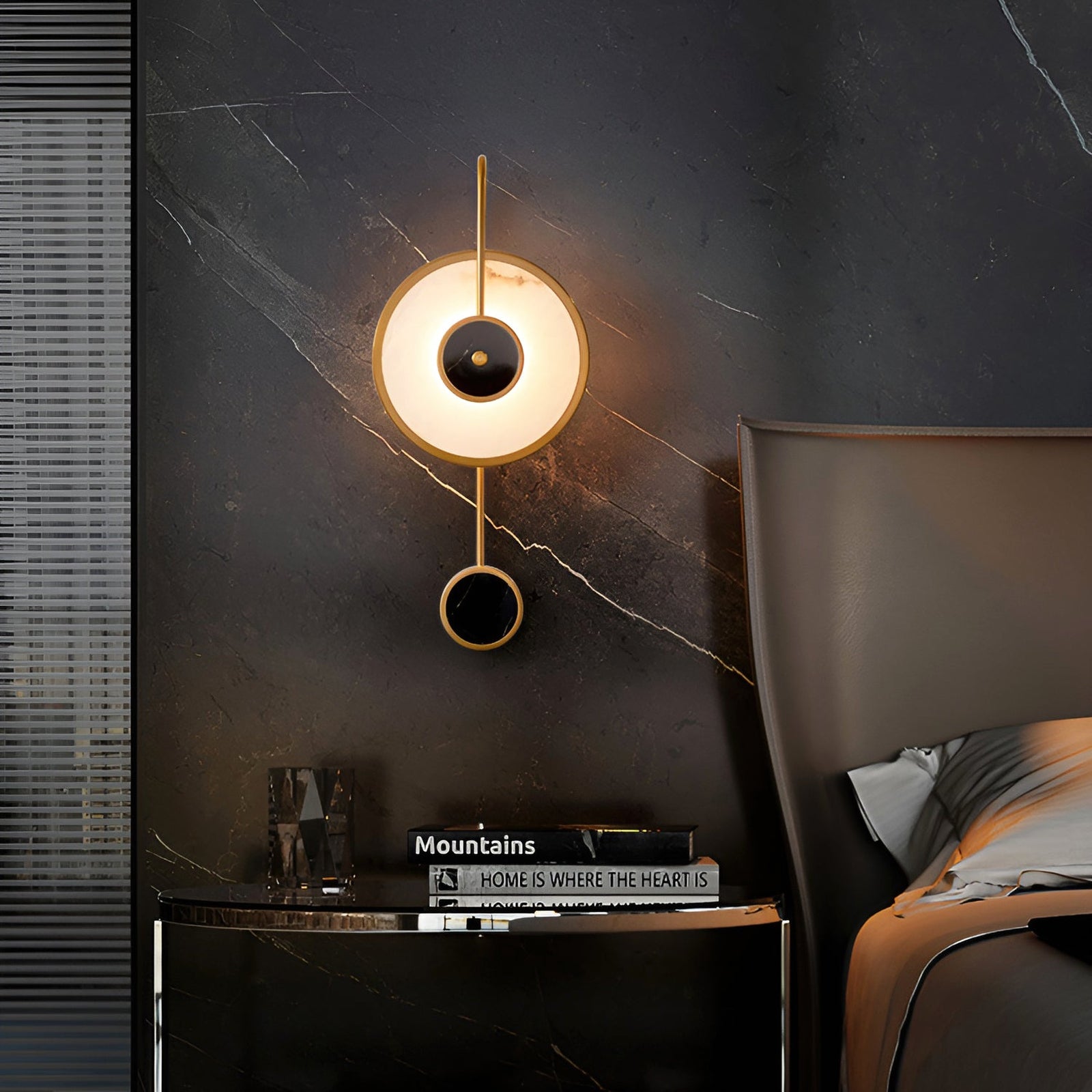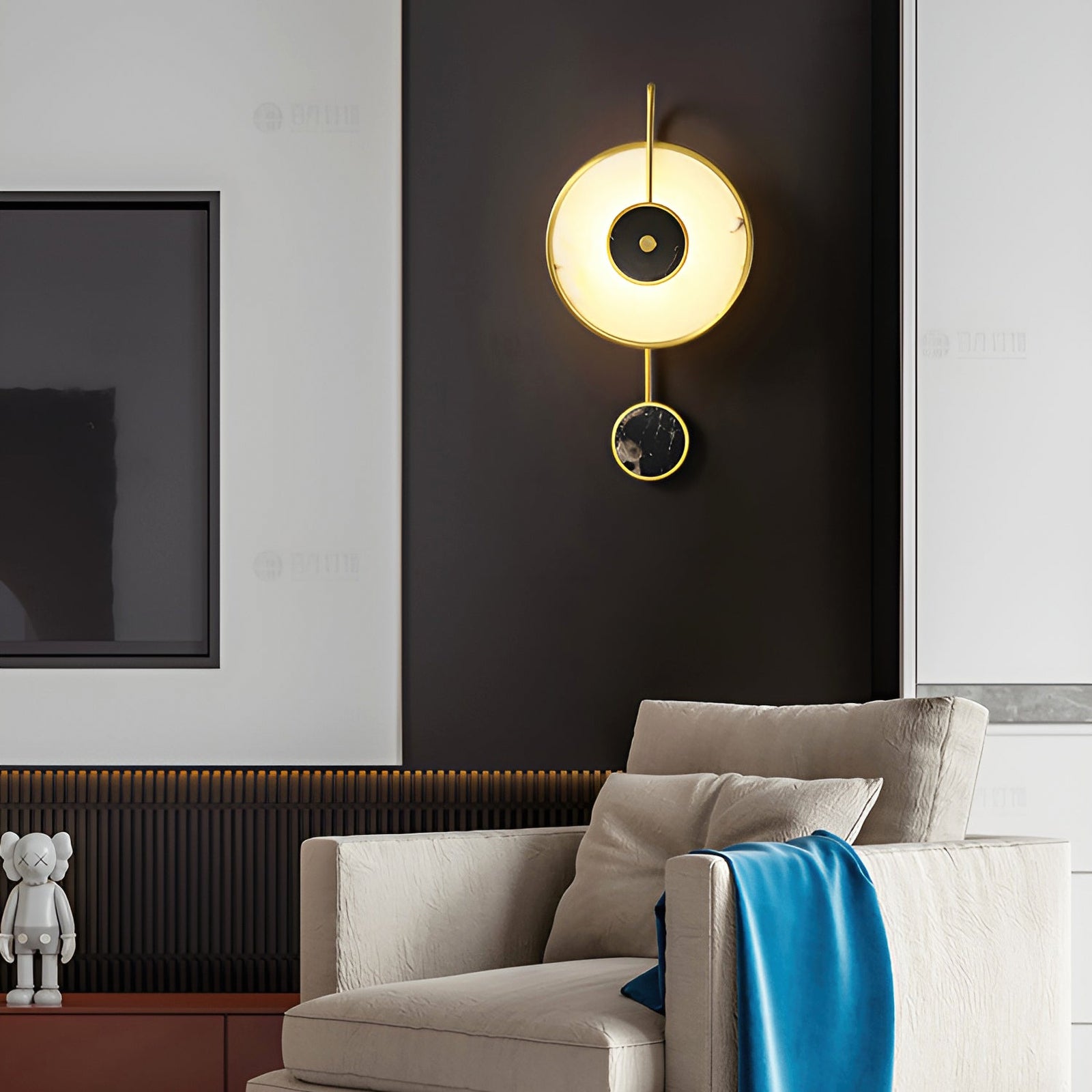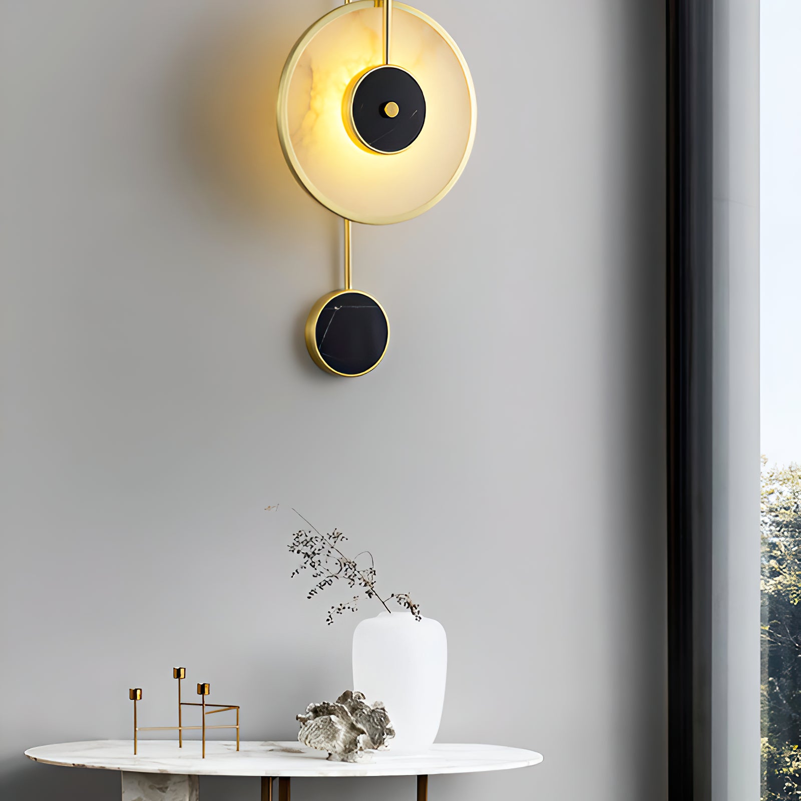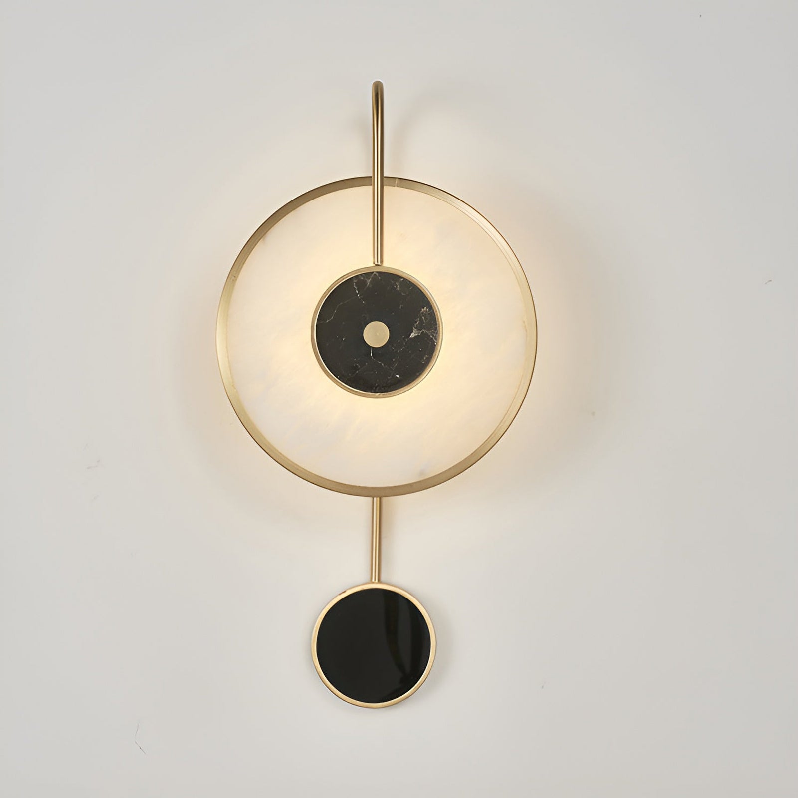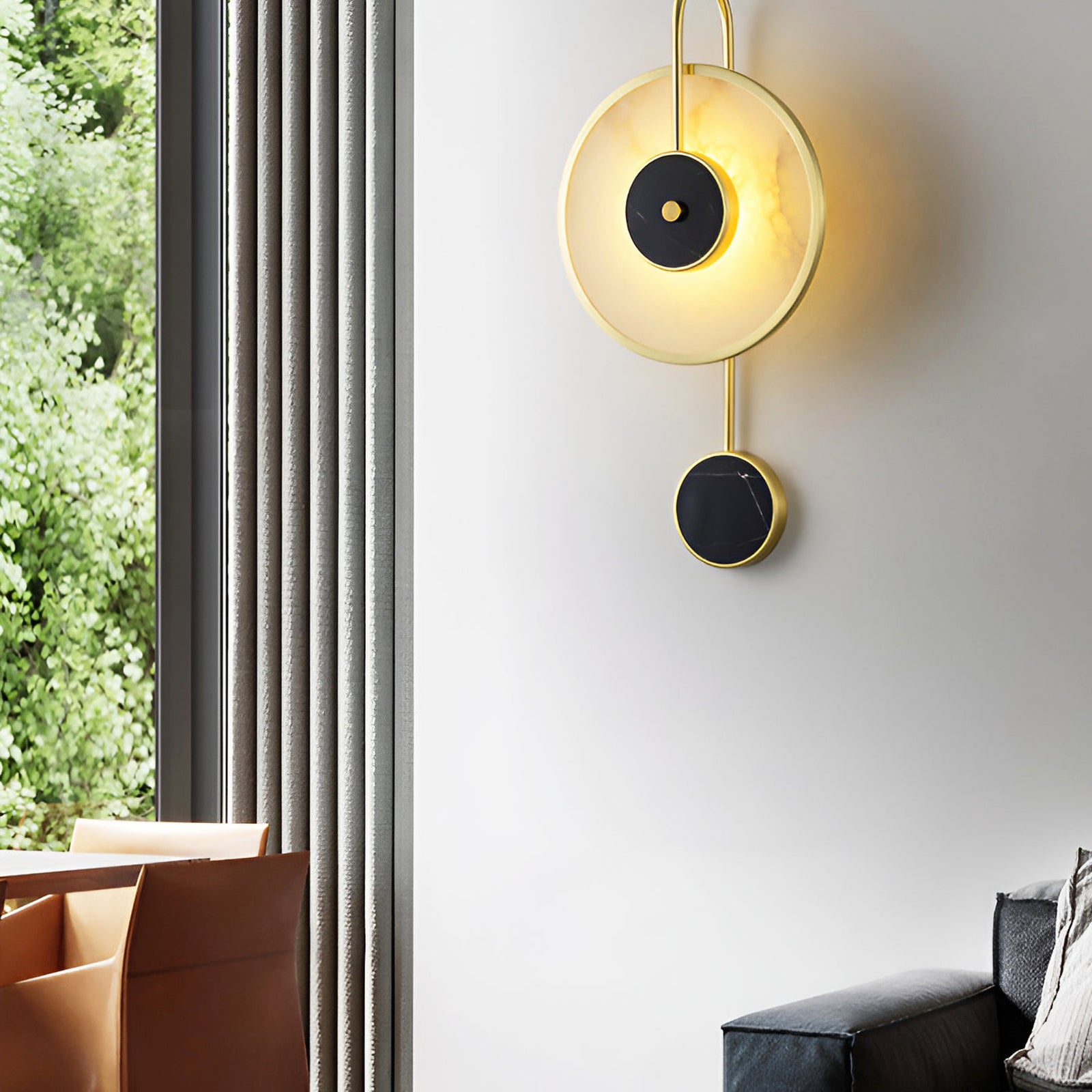 This Art Deco Black & White Alabaster Wall Lamp features a refined circular design, blending elegant materials and bold contrasts. The central disc is crafted from black marble, providing a striking focal point against the surrounding alabaster ring that radiates a warm, diffused glow. A slim, polished brass frame encircles the alabaster, adding sophistication to the piece. An additional smaller, black circular accent above the main disc connects to the larger frame with a delicate brass rod, giving a balanced, floating aesthetic. This wall lamp is an ideal choice for spaces that require a touch of luxury and a modern Art Deco flair.