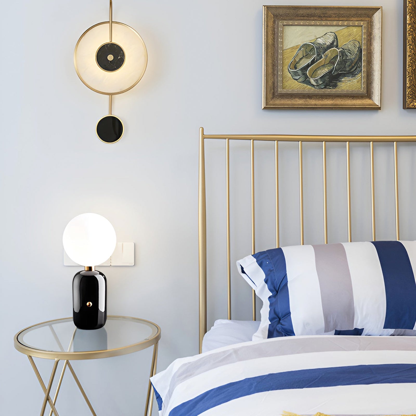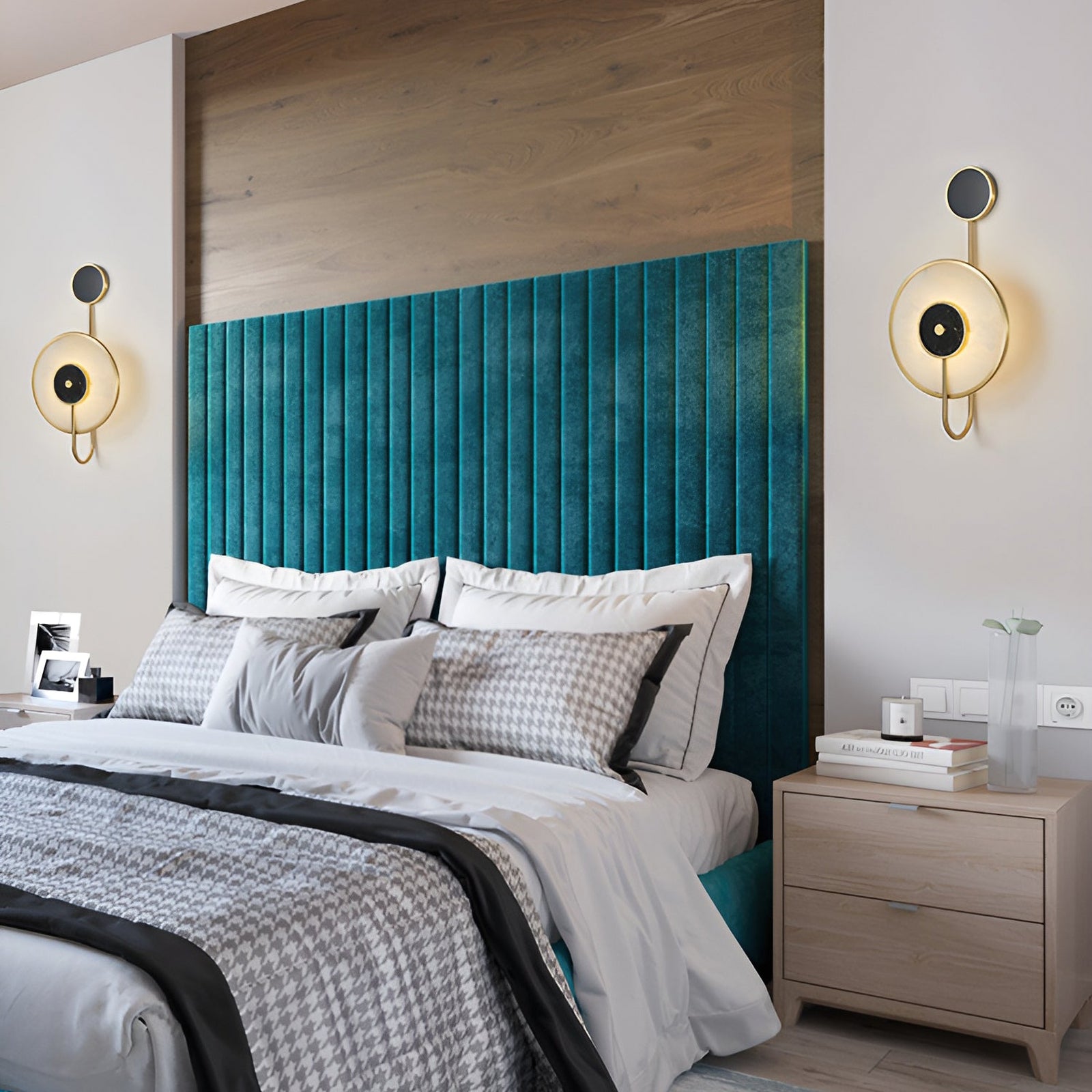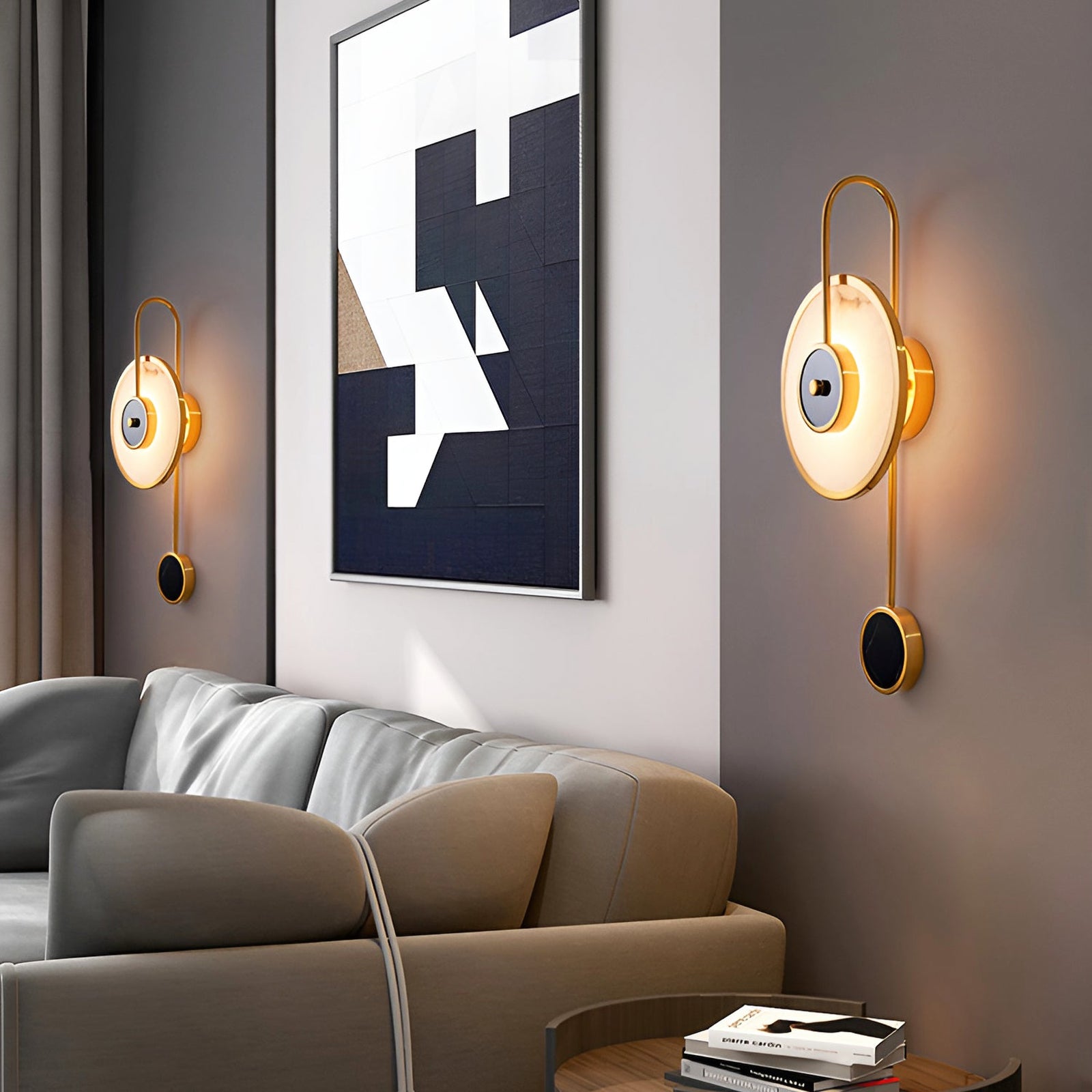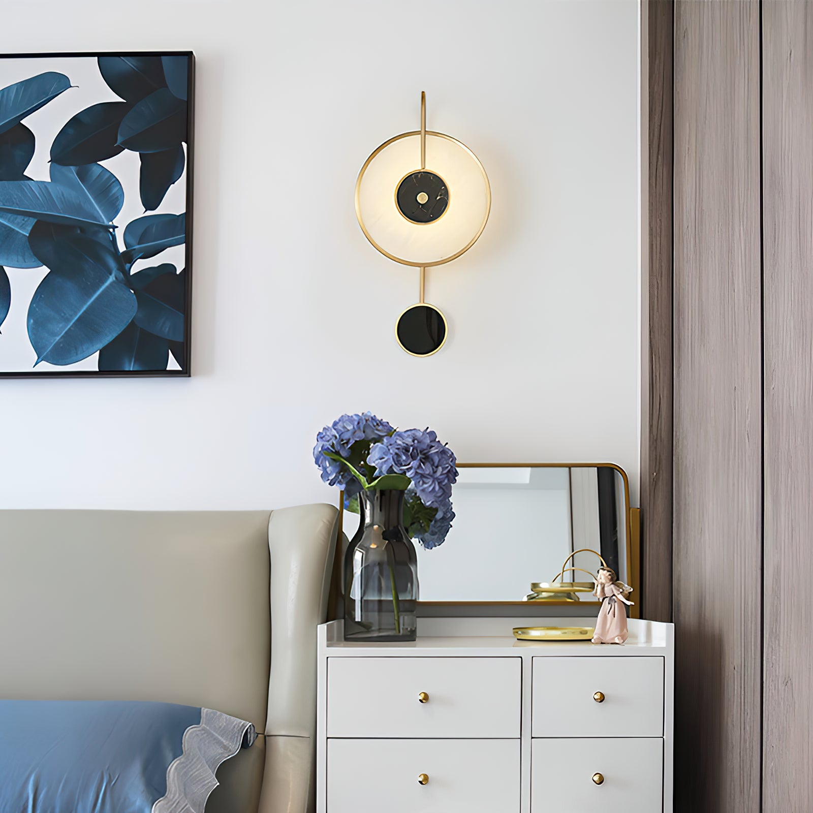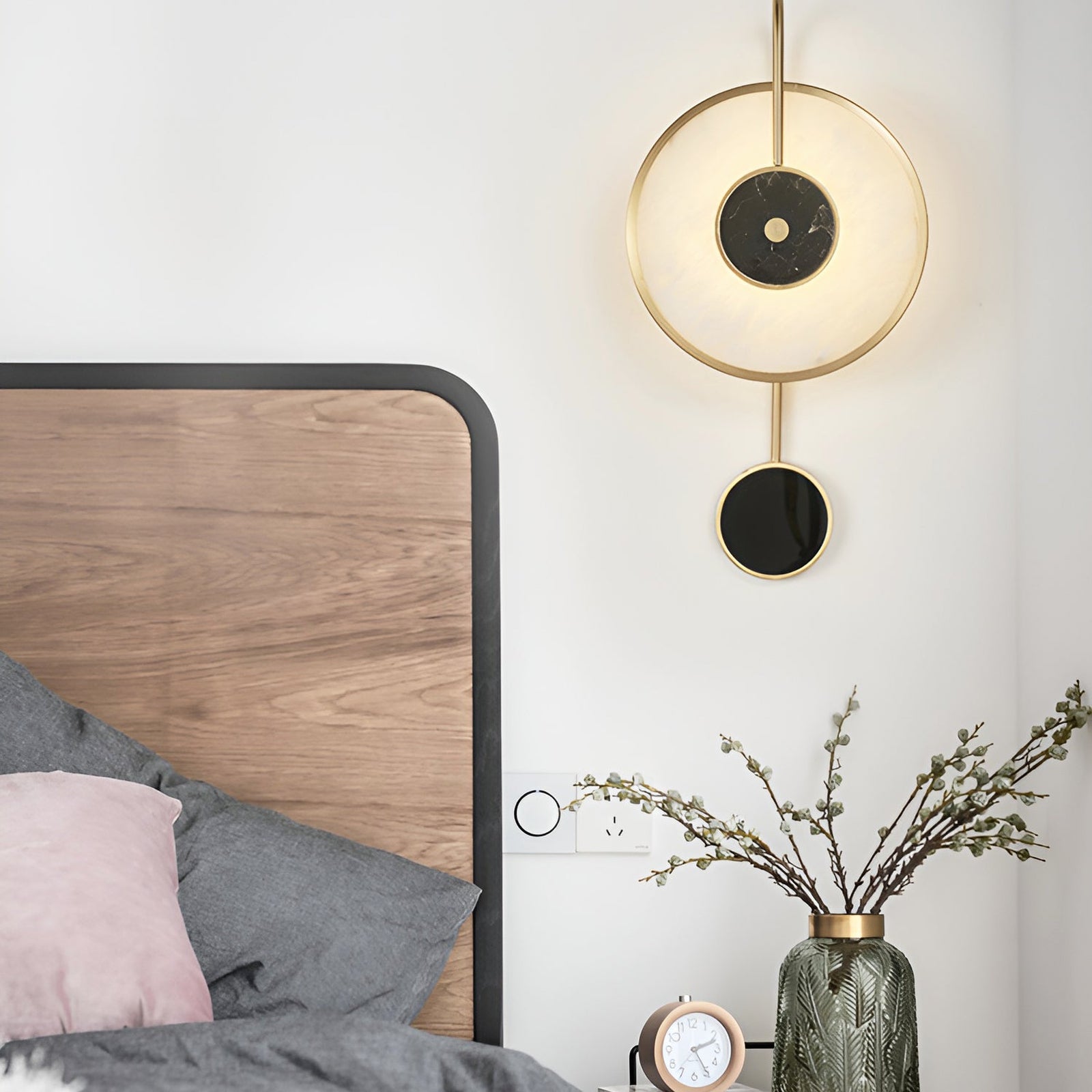 This Art Deco Black & White Alabaster Wall Lamp features a refined circular design, blending elegant materials and bold contrasts. The central disc is crafted from black marble, providing a striking focal point against the surrounding alabaster ring that radiates a warm, diffused glow. A slim, polished brass frame encircles the alabaster, adding sophistication to the piece. An additional smaller, black circular accent above the main disc connects to the larger frame with a delicate brass rod, giving a balanced, floating aesthetic. This wall lamp is an ideal choice for spaces that require a touch of luxury and a modern Art Deco flair.