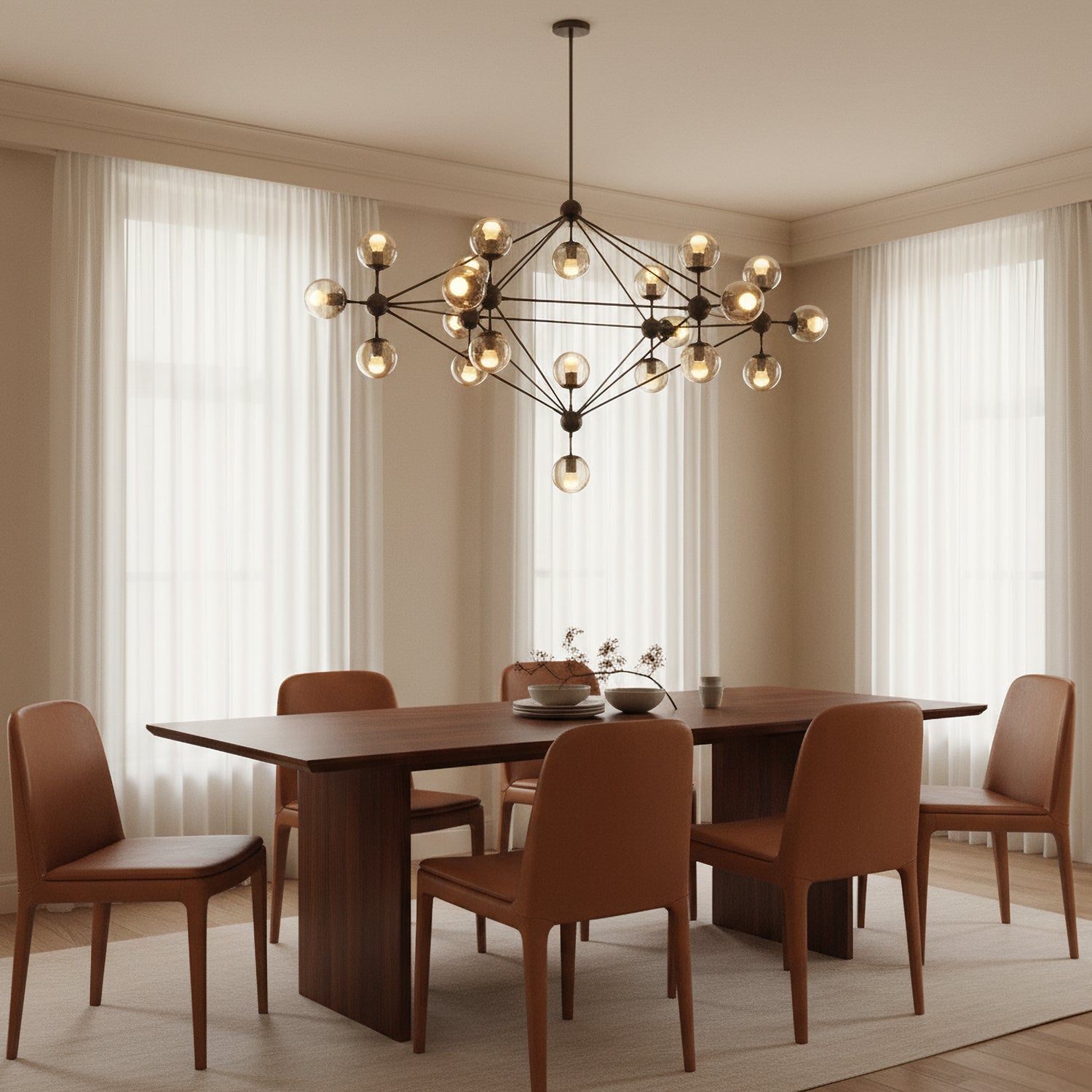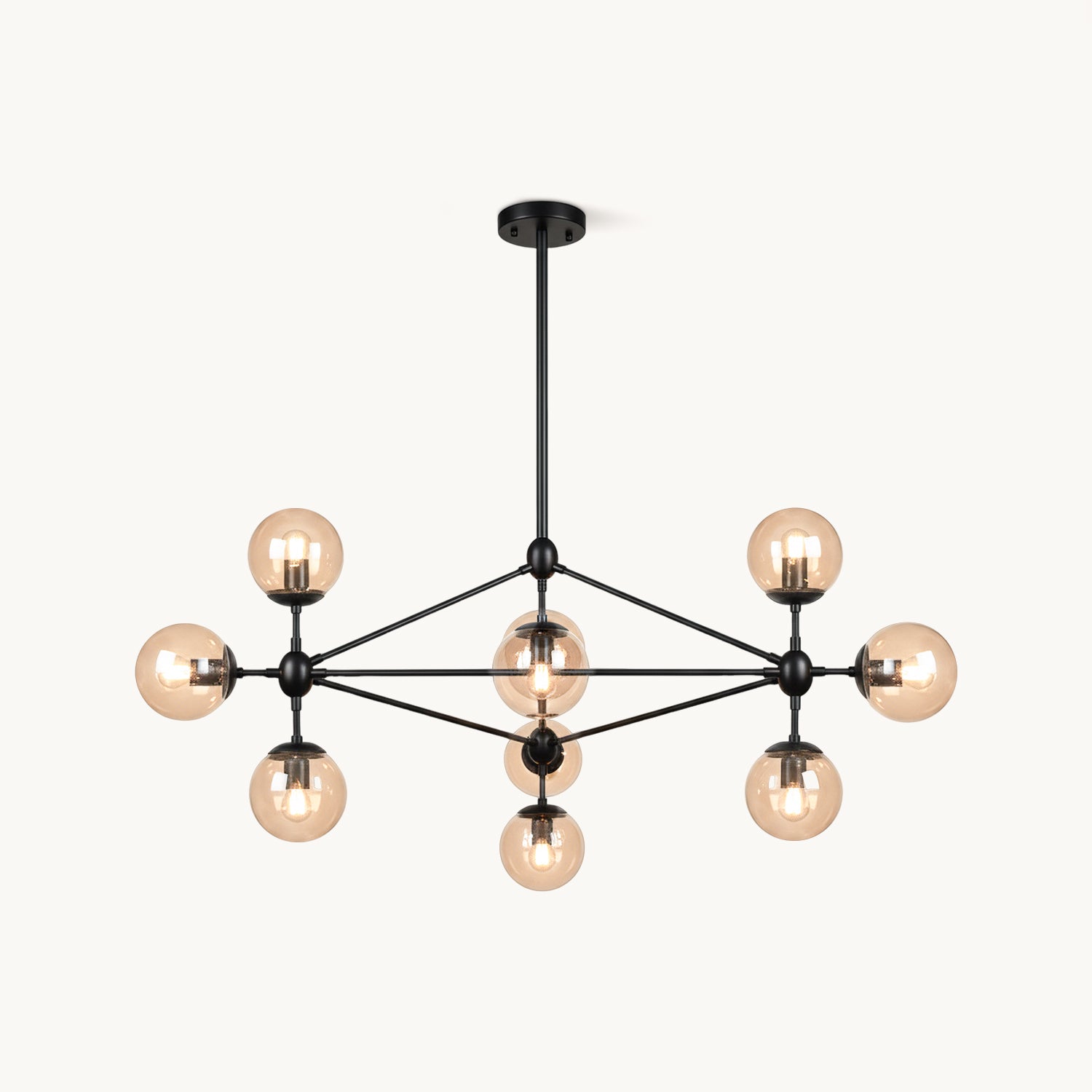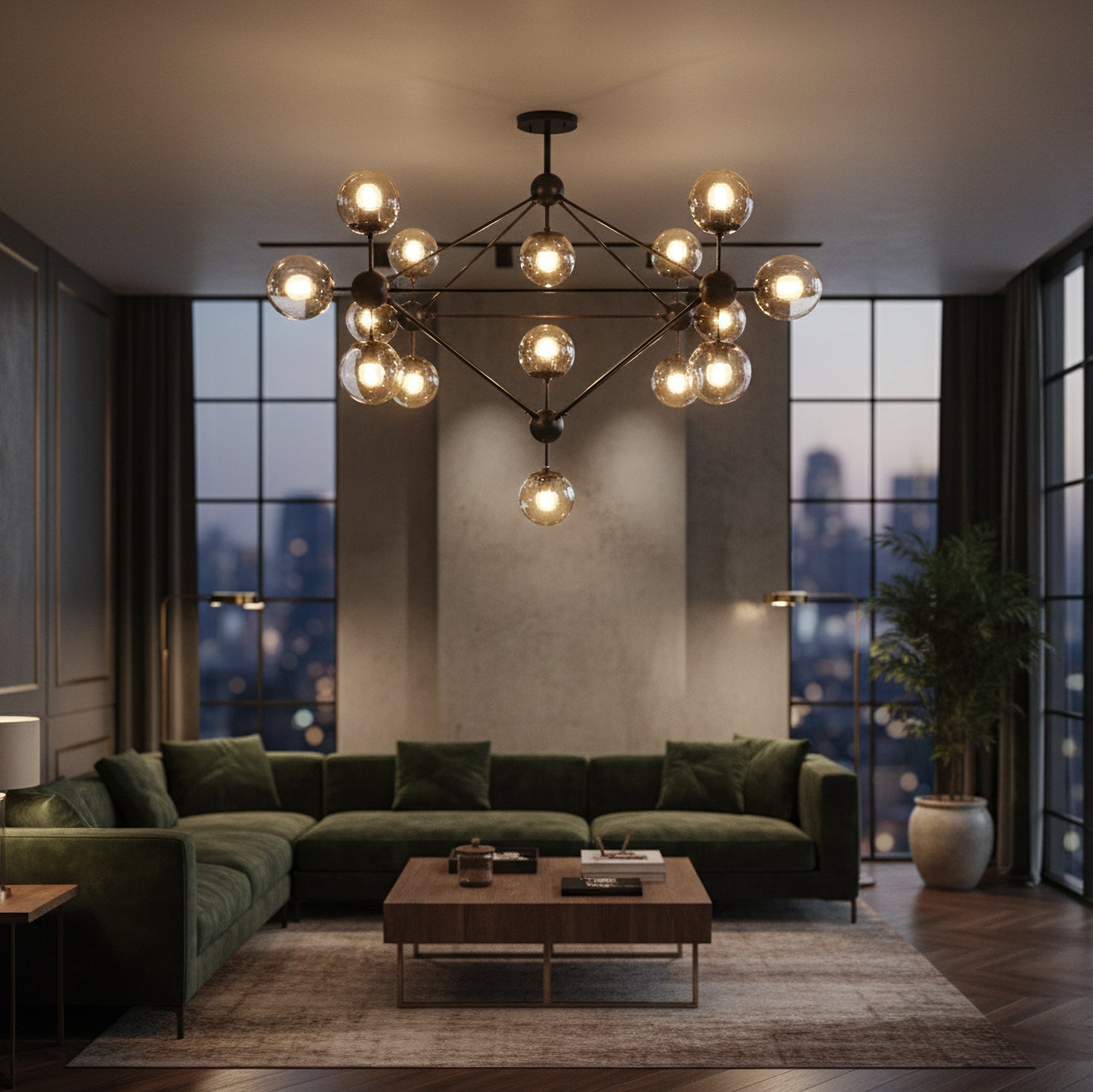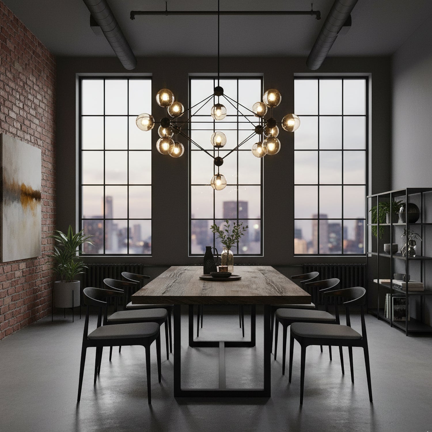 The Artemis Chandelier by Mooijane features a bold matte black iron frame that exudes a classic industrial vibe. Its architectural design, reminiscent of a deconstructed molecule or futuristic structure, makes it more than just a light—it’s a sculptural statement. Ideal for modern lofts, dining rooms, or living spaces seeking striking, contemporary character.