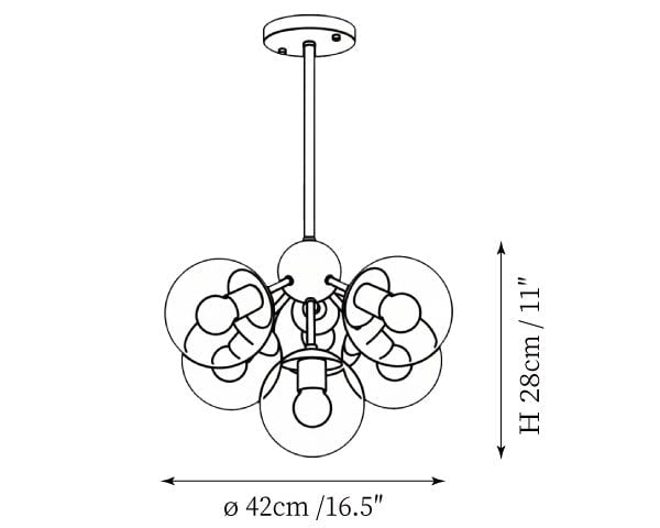 - 5-Lights Size: Dia 42cm x H 28cm / ∅ 16.5″ x H 11″. (3.9"+7.9" suspension rod.)