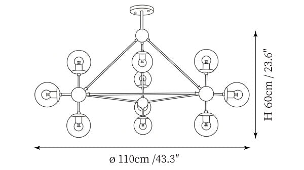 - 10-Lights Size: Dia 110cm x H 60cm / ∅ 43.3″ x H 23.6″. (3.9" suspension rod.)