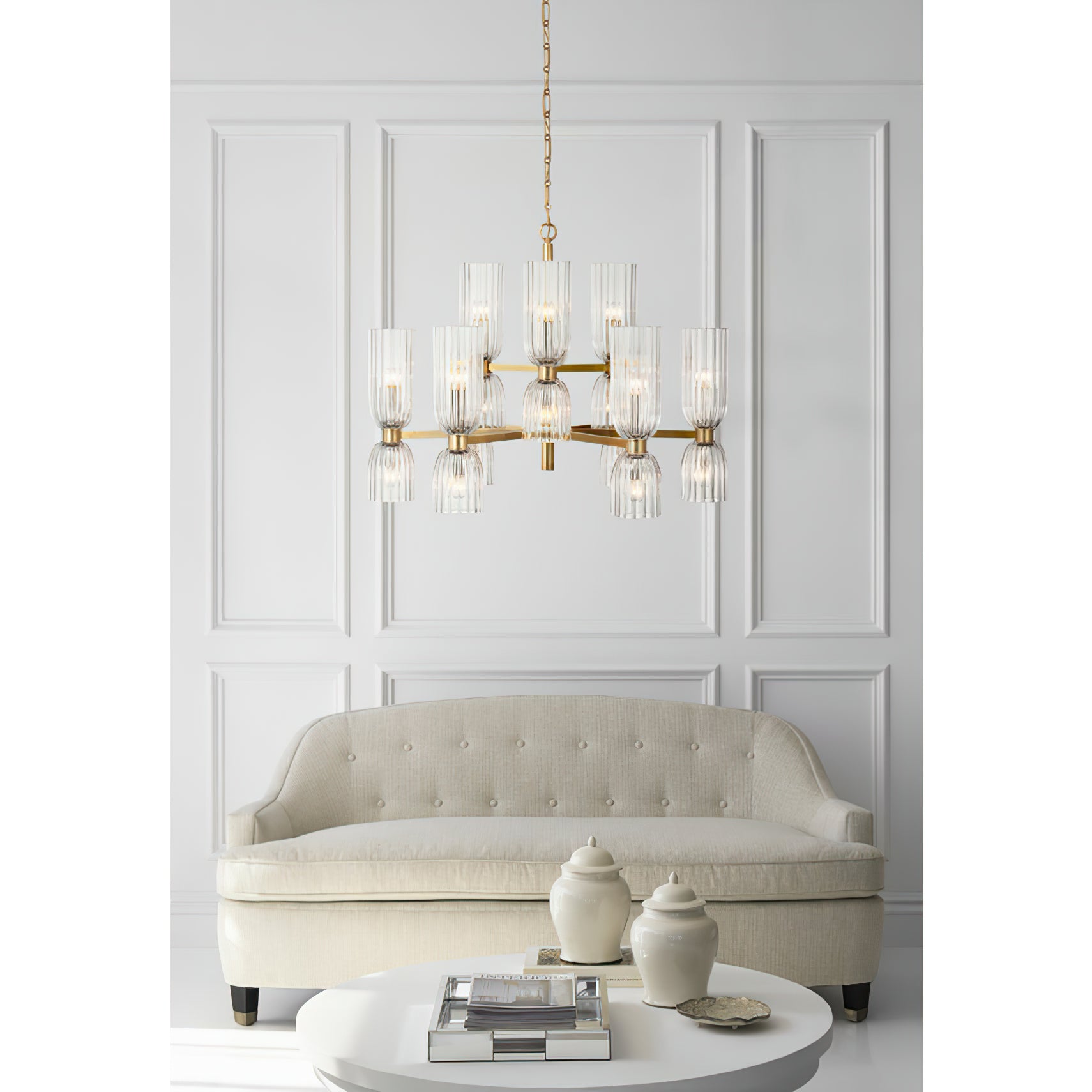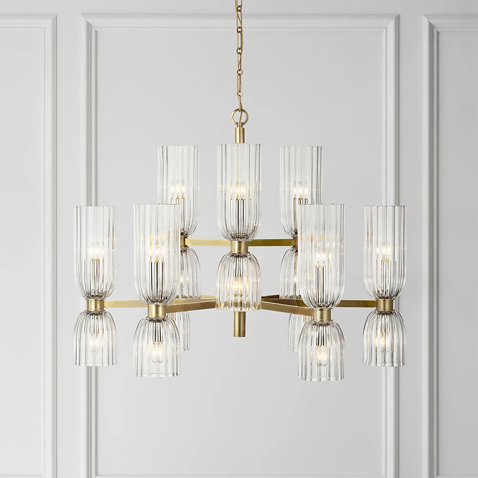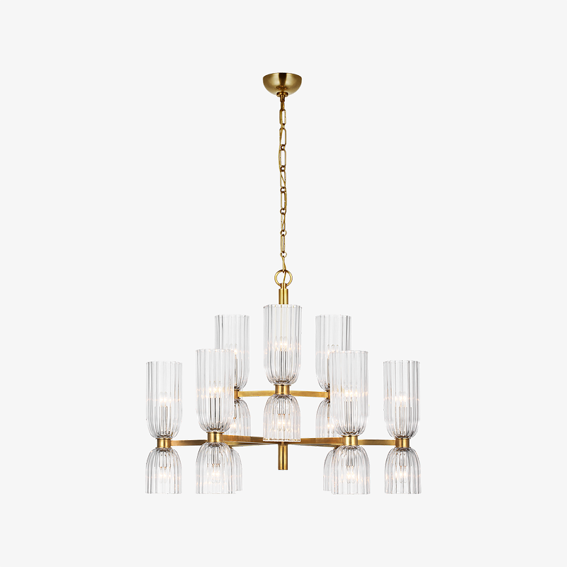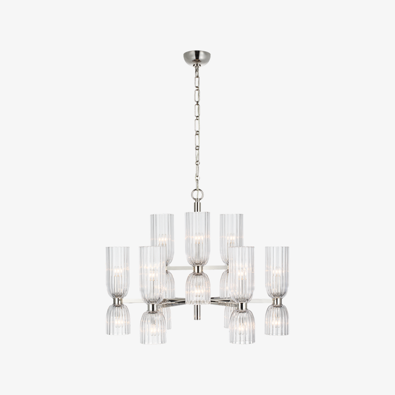 Elevate your space with the Asalea Double Tier Chandelier. Featuring ribbed glass and polished metal finishes, this modern French design adds a sophisticated touch to any room. Available in two finishes, it's the perfect focal point for your dining room or living room.