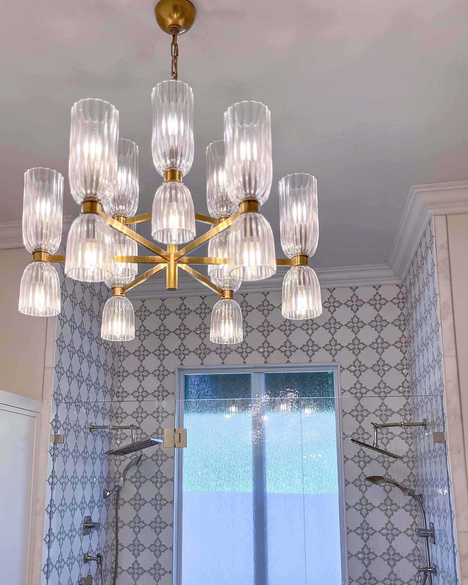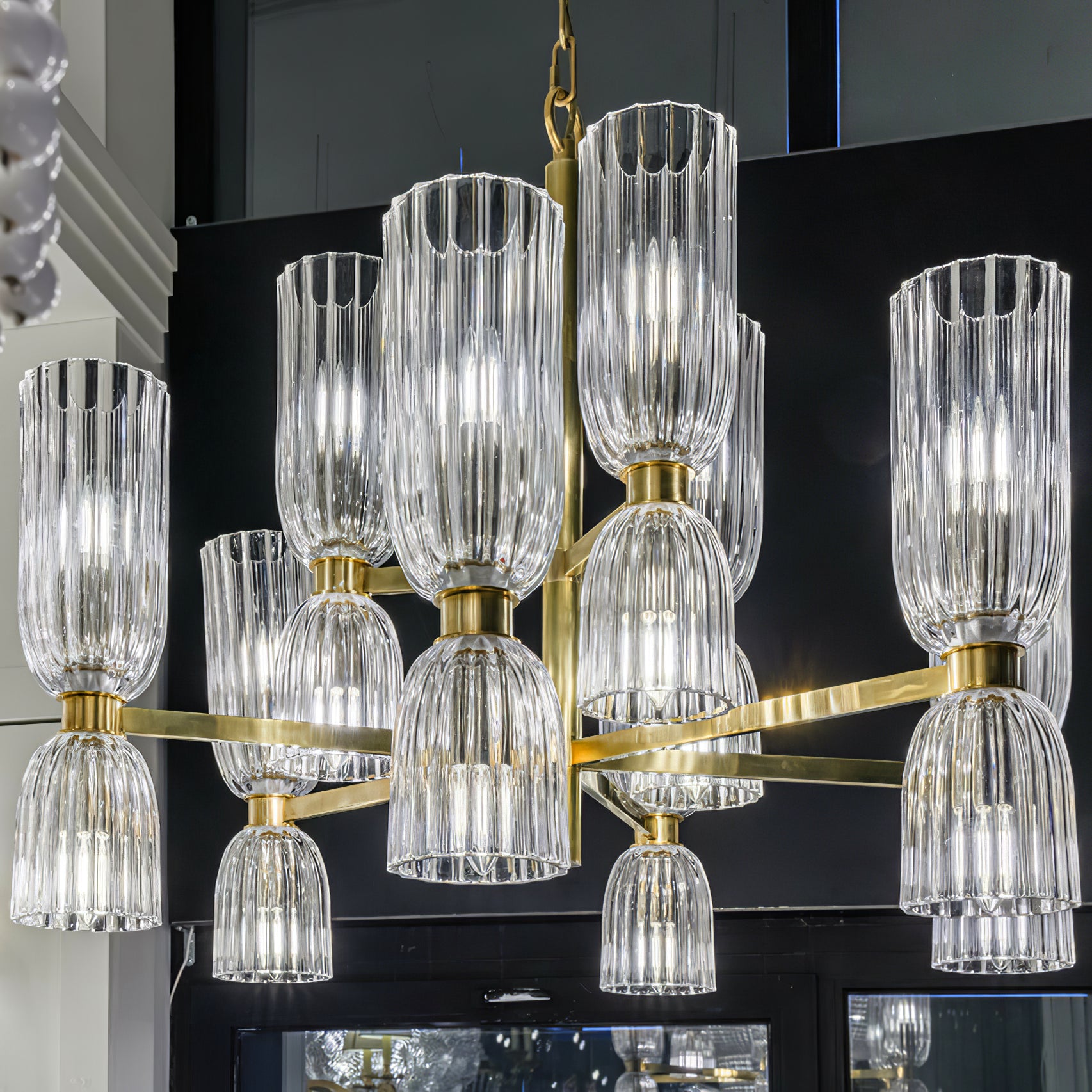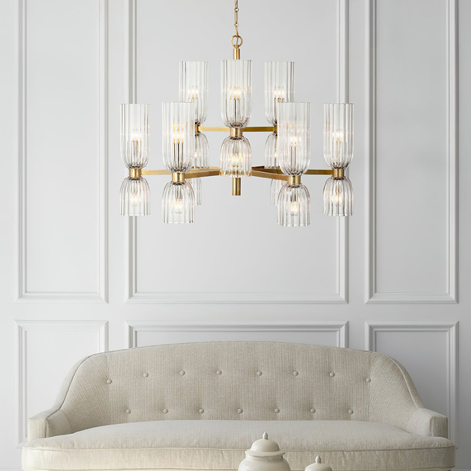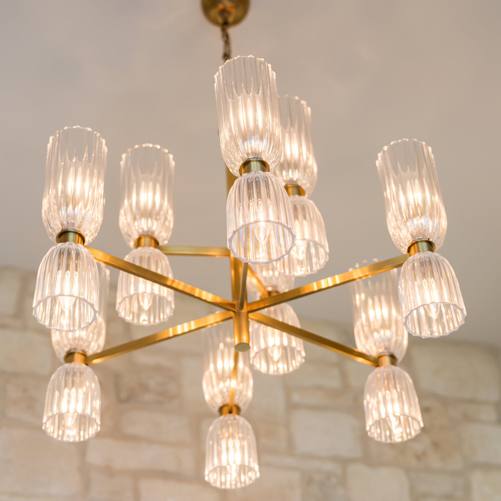 Elevate your space with the Asalea Double Tier Chandelier. Featuring ribbed glass and polished metal finishes, this modern French design adds a sophisticated touch to any room. Available in two finishes, it's the perfect focal point for your dining room or living room.
