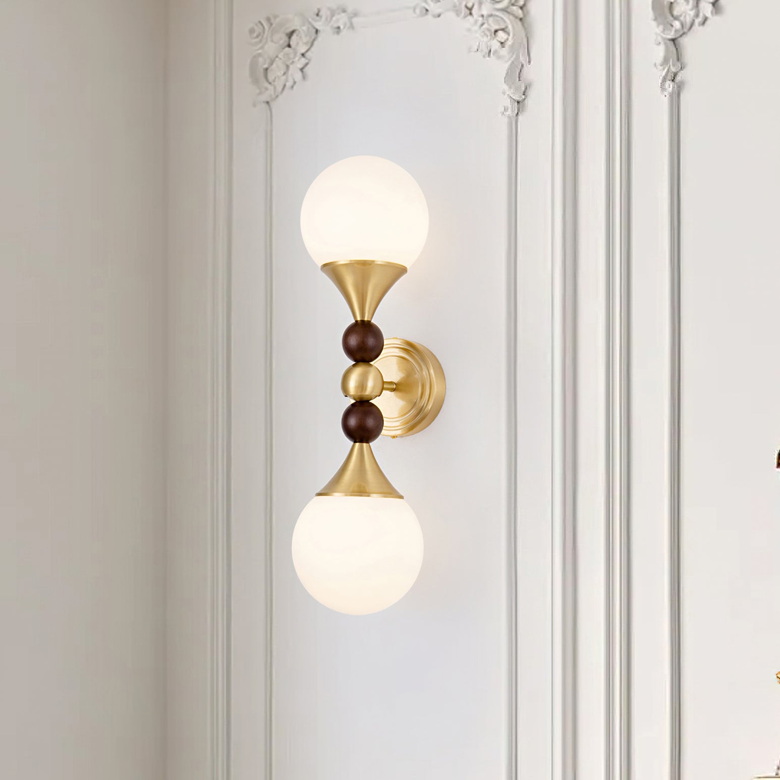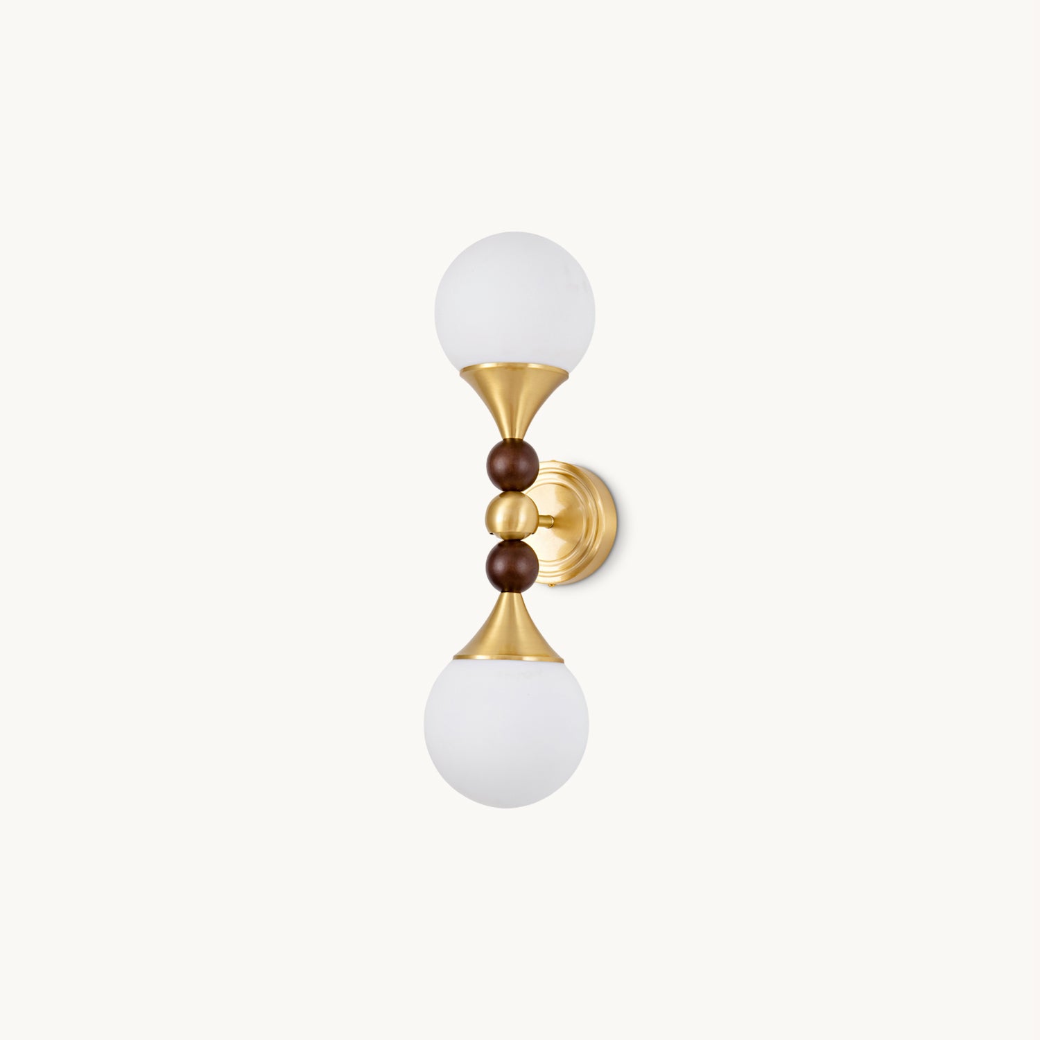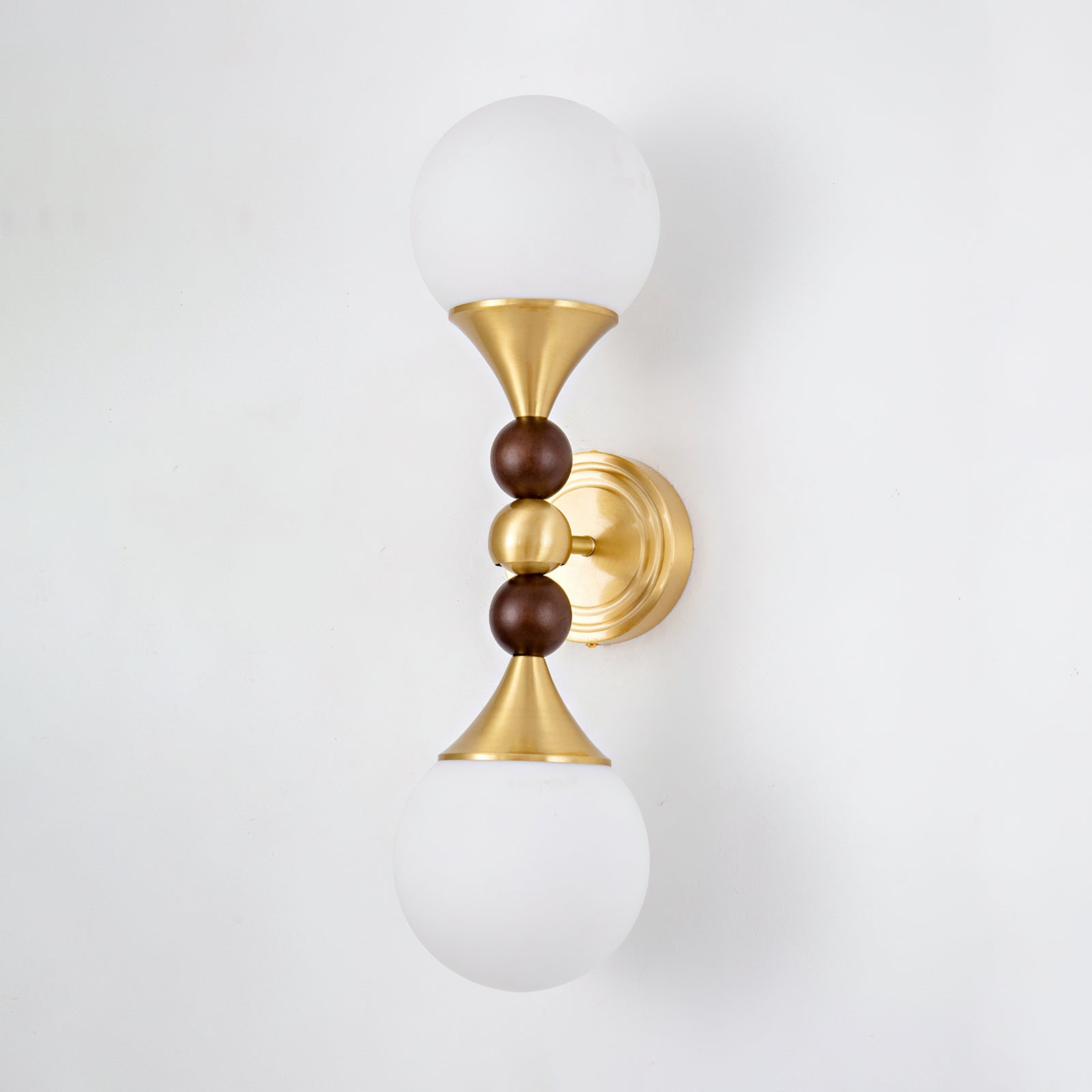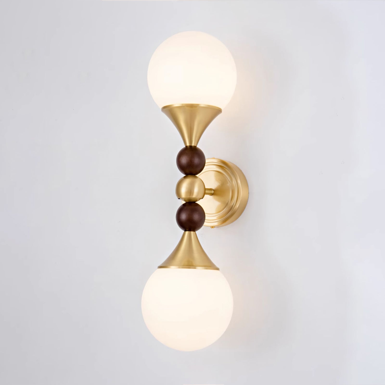 The Astoria Wall Lamp by Mooijane features a balanced silhouette with dual opaline glass globes and a refined brass structure, blending modern simplicity with classic elegance. A rounded wood accent at the center adds warmth and a natural touch, while the trumpet-shaped holder and sleek brass base enhance its sculptural form. Ideal for hallways, bedside settings, or living room feature walls, Astoria offers soft illumination and timeless style in one artistic statement.