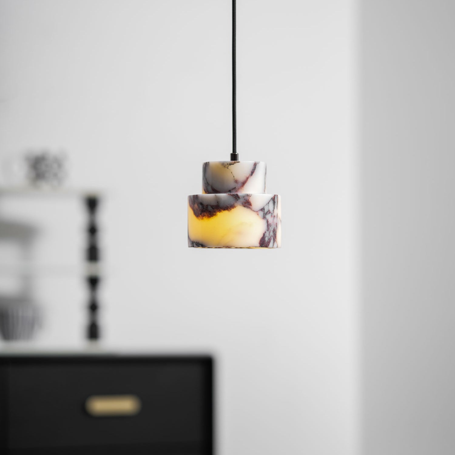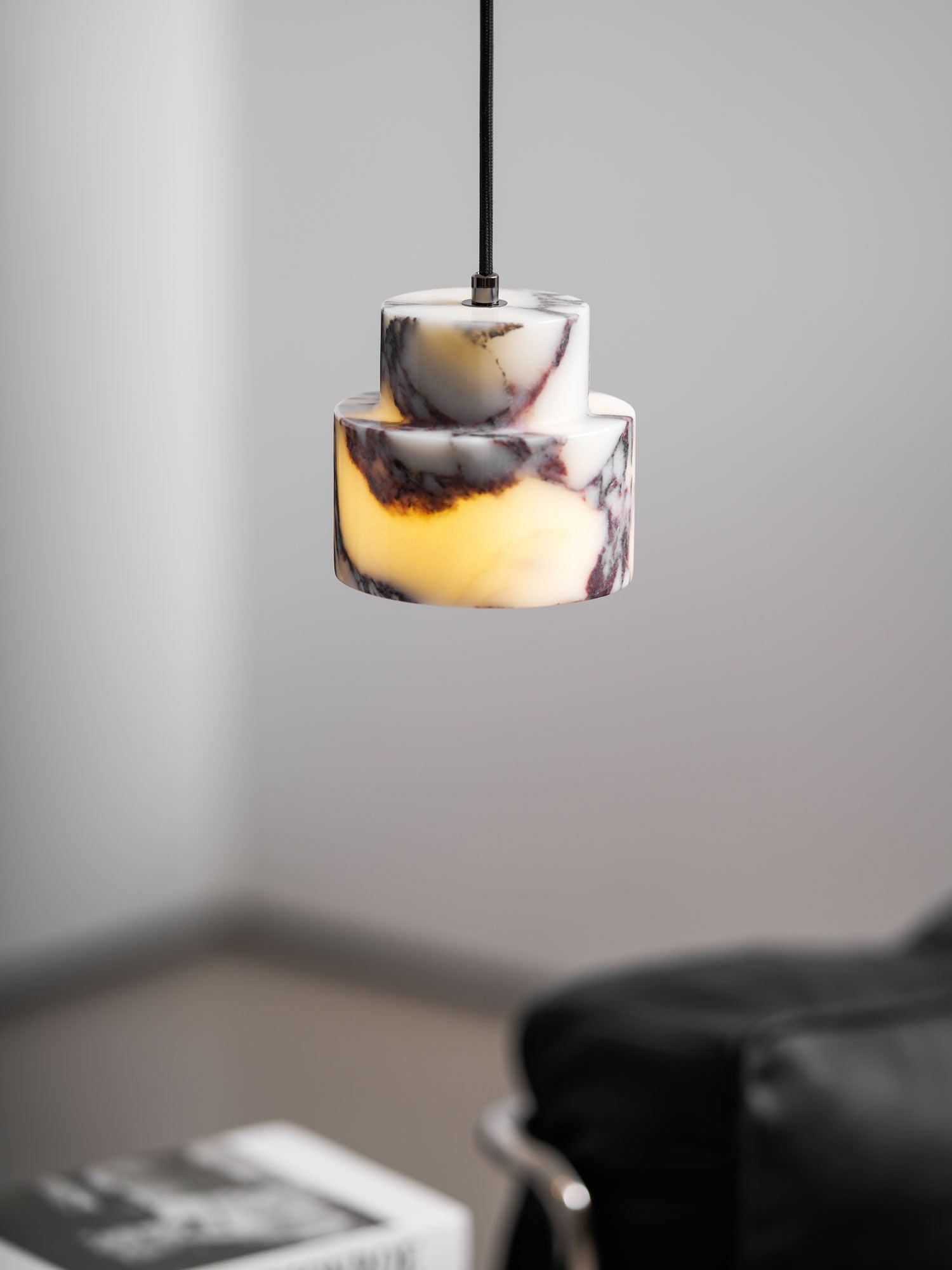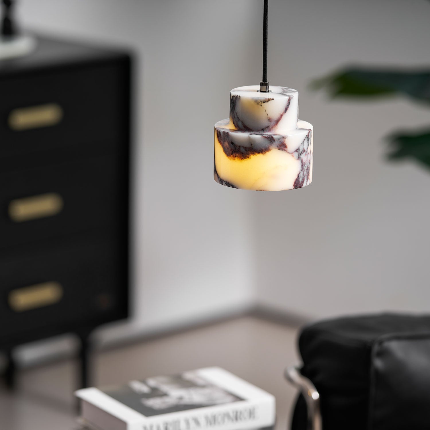 The Astra Marble Pendant Lamp by Mooijane blends sculptural elegance with natural beauty. Carved from solid marble, its layered geometric form highlights the stone’s organic veining—reminiscent of flowing clouds or splashed ink—making each piece one-of-a-kind. Soft light filters through the marble, casting a warm, ambient glow that enhances modern interiors with a sense of calm and refinement.